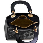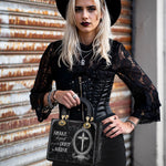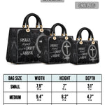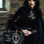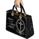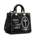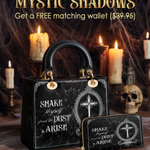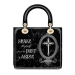 This handbag embodies resurrection and power. Centered around an ornate gothic frame encasing a radiant cross, the design evokes sacred strength and eternal grace. The surrounding scripture, “Shake thyself from the dust; arise”, serves not just as a verse but as a calling—for transformation, for liberation, for rising anew. The distressed black texture and silver-gray tones amplify its mystic presence, turning faith into a fierce fashion statement.