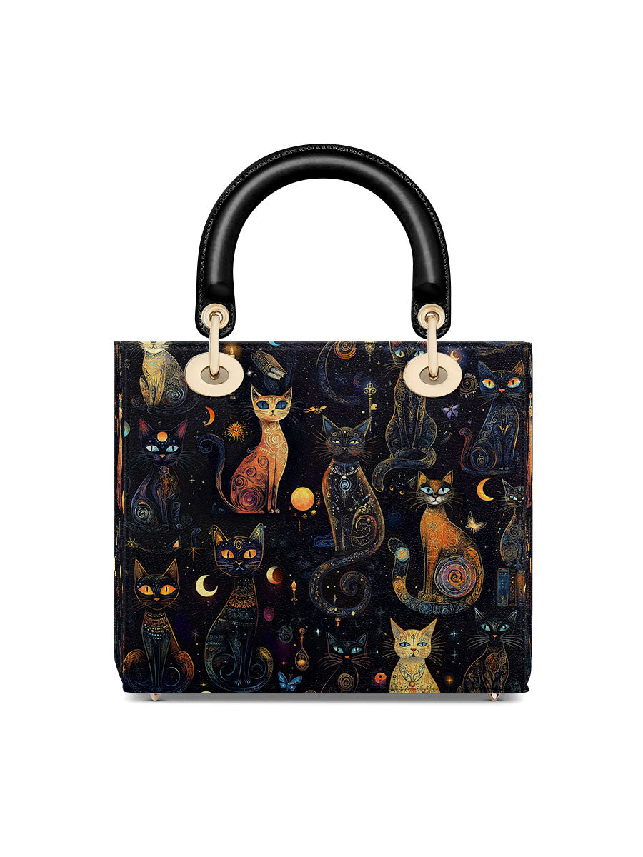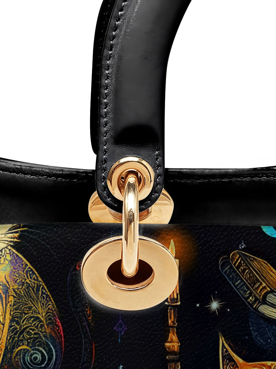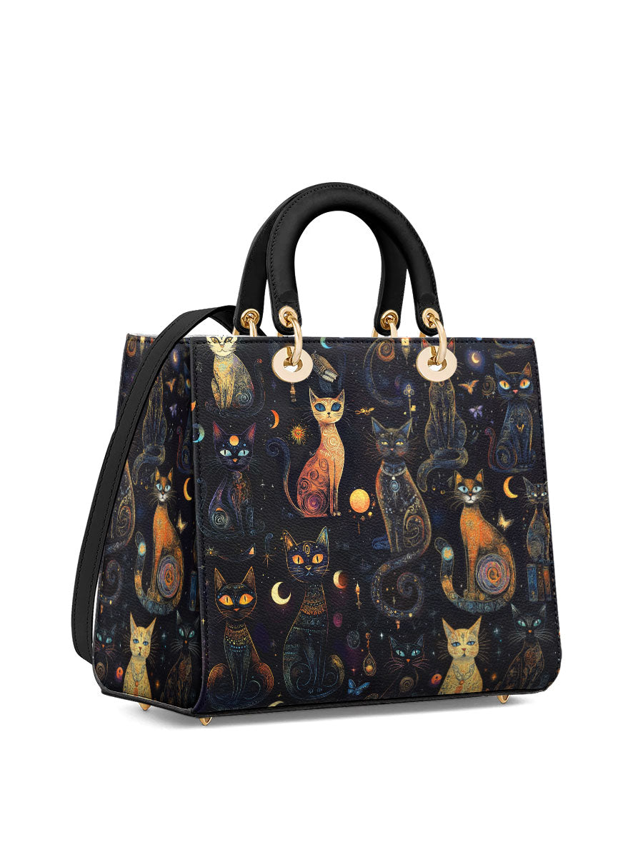 This enchanting leather handbag is a celestial gallery of mysterious felines, each one shimmering with otherworldly charm and secret wisdom. Against a deep, cosmic backdrop of moons, stars, and swirling constellations, these mystical cats stand like guardians of the night—watchful, graceful, and full of silent power.