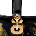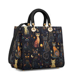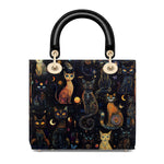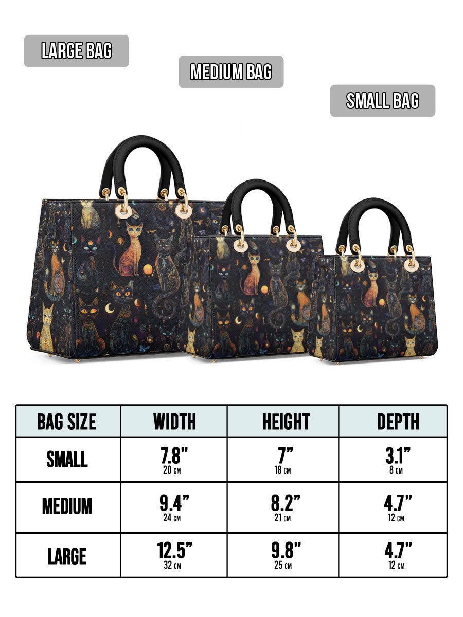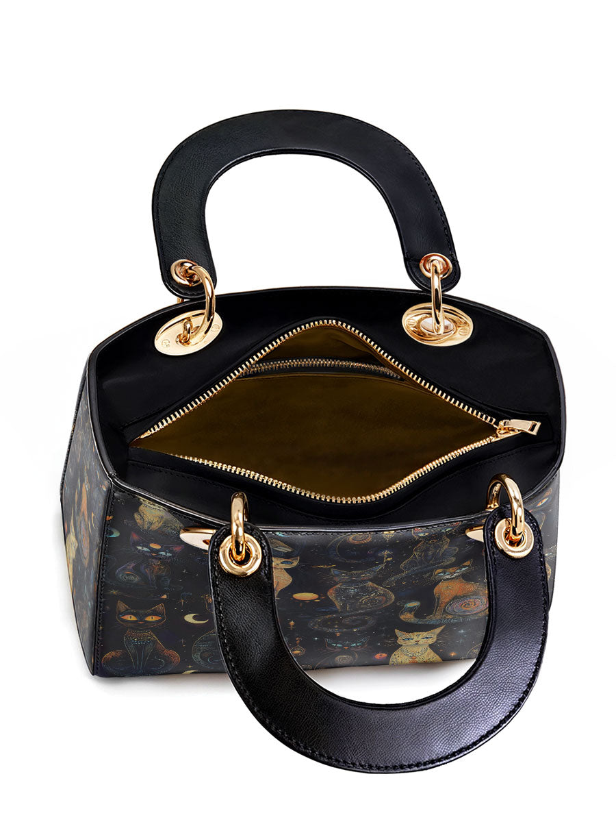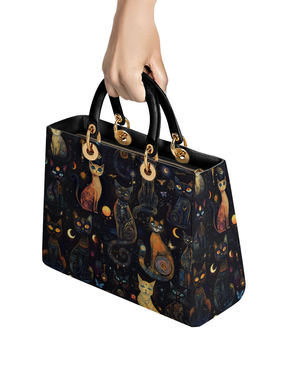 This enchanting leather handbag is a celestial gallery of mysterious felines, each one shimmering with otherworldly charm and secret wisdom. Against a deep, cosmic backdrop of moons, stars, and swirling constellations, these mystical cats stand like guardians of the night—watchful, graceful, and full of silent power.