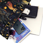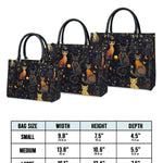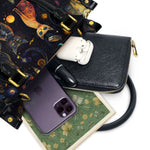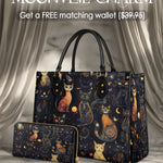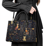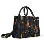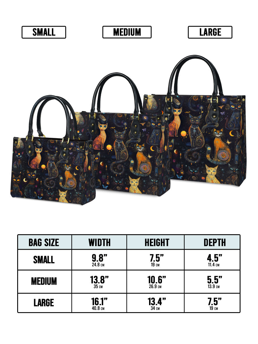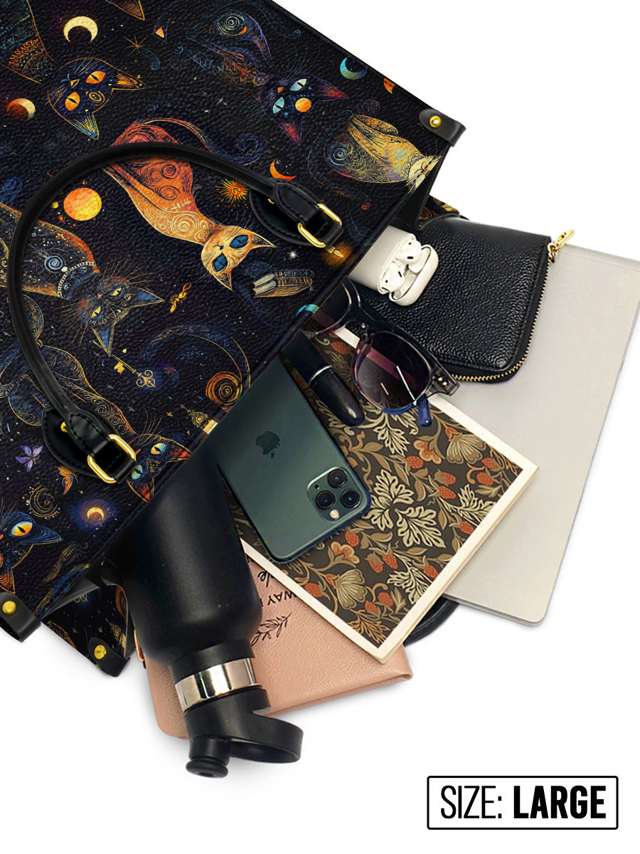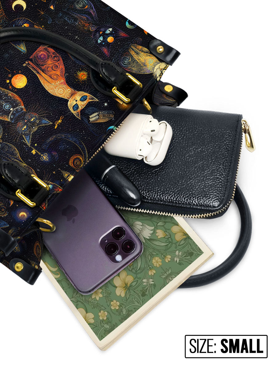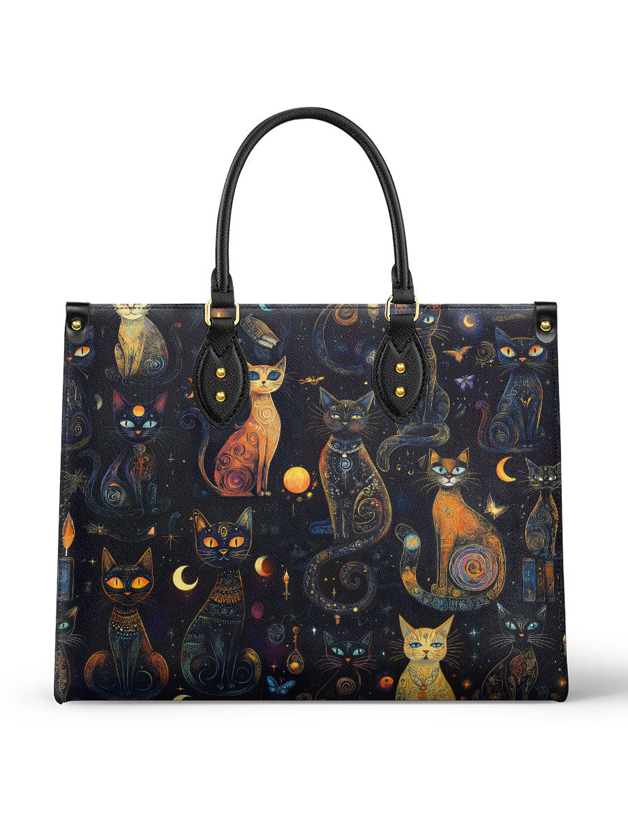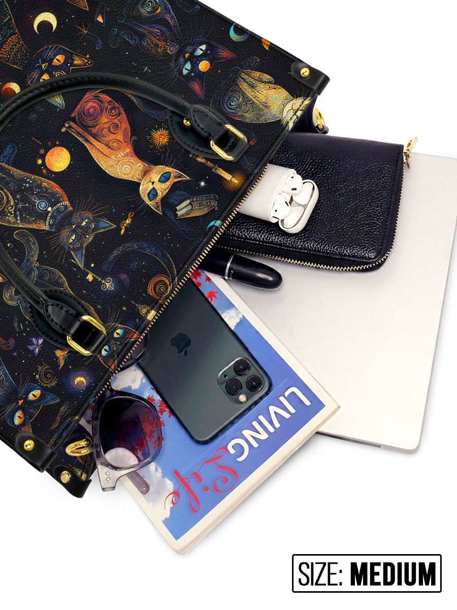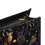 This enchanting leather handbag is a celestial gallery of mysterious felines, each one shimmering with otherworldly charm and secret wisdom. Against a deep, cosmic backdrop of moons, stars, and swirling constellations, these mystical cats stand like guardians of the night—watchful, graceful, and full of silent power.