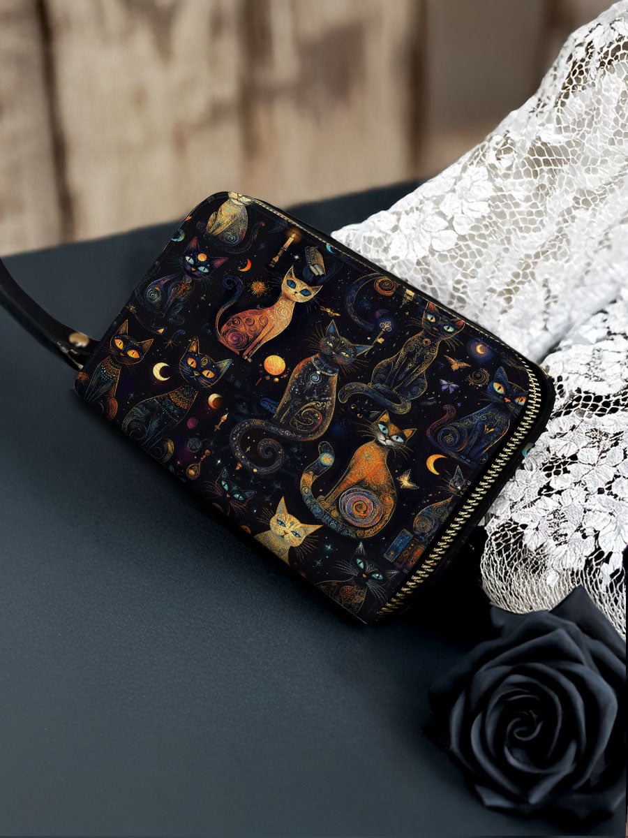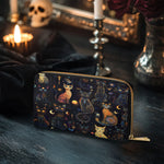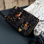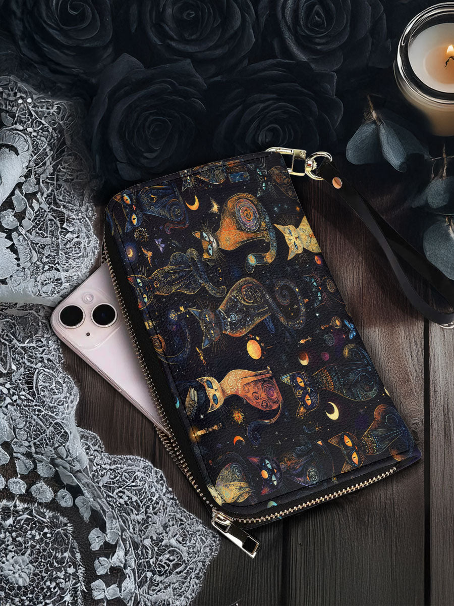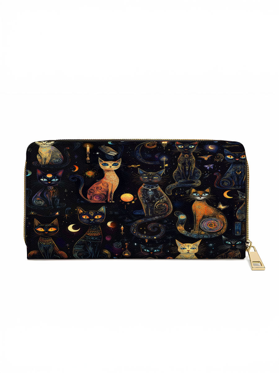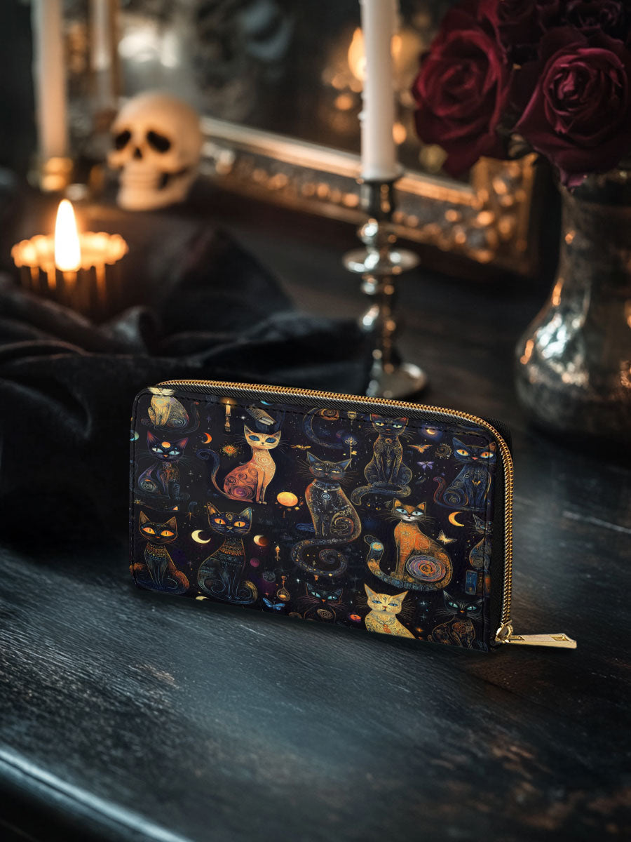 Designed for those who find beauty in the shadows and magic in the mundane, this wallet radiates both style and spirit. Adorned with a tapestry of elegant cats surrounded by stars and lunar phases, it evokes a sense of mystery, intelligence, and spiritual depth.