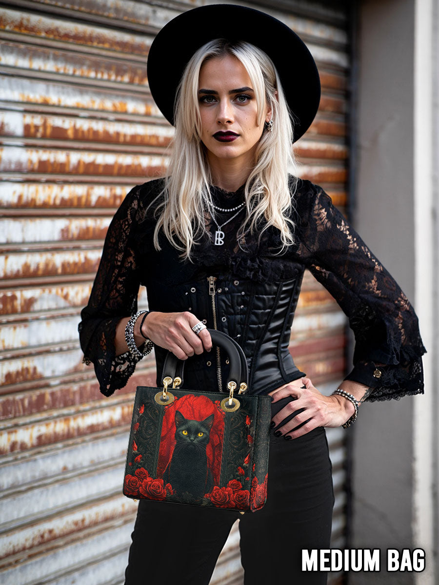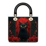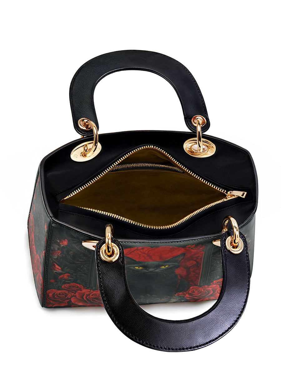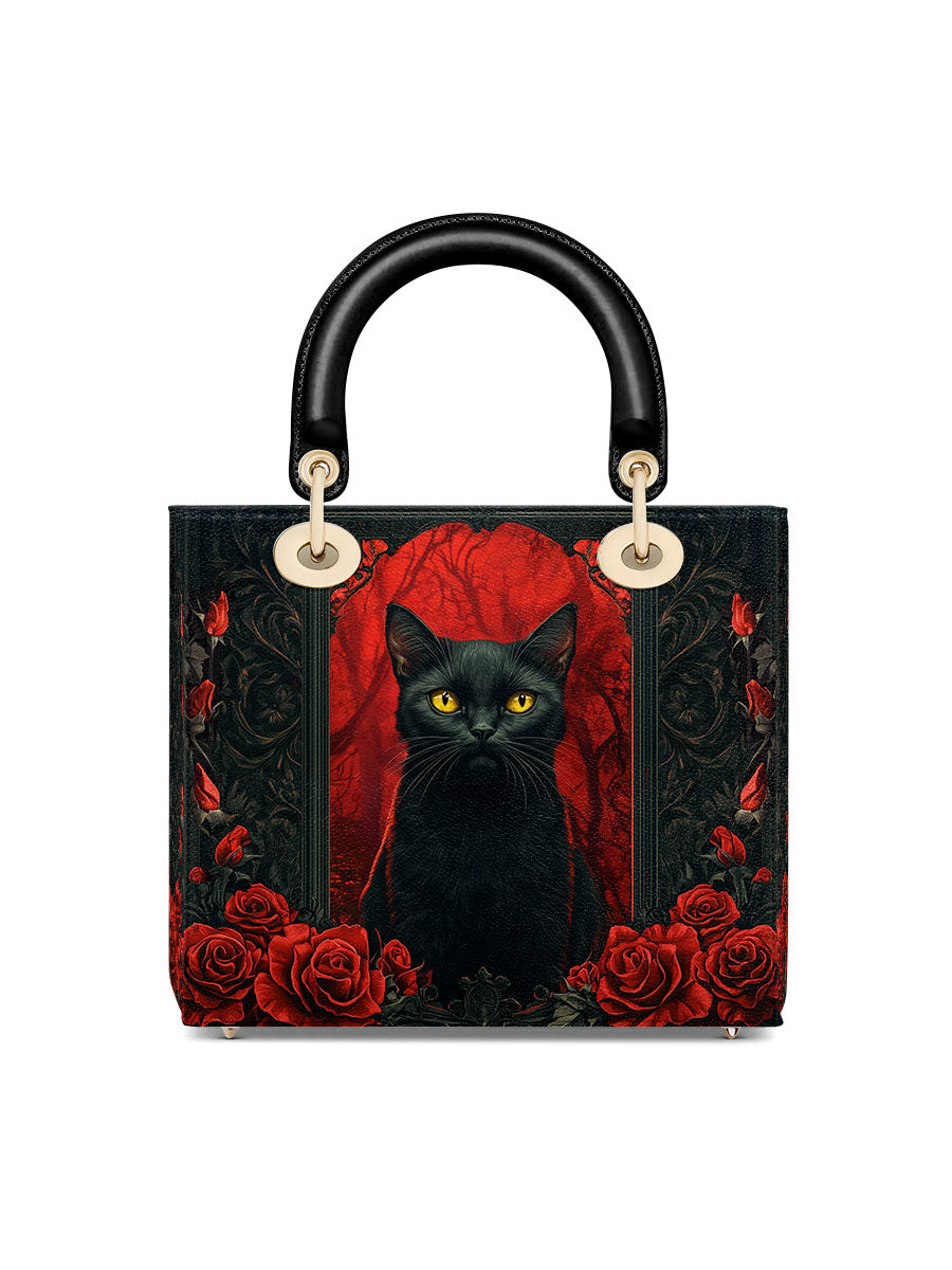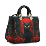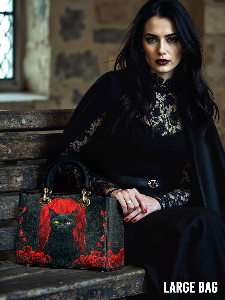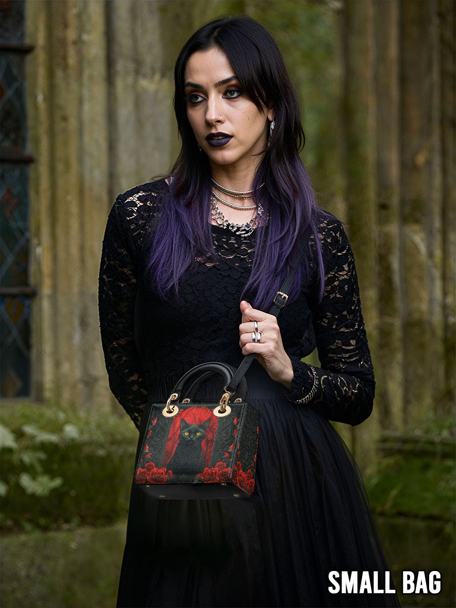 This striking leather handbag captures the allure of the mystical and the untamed. At the center sits a piercing-eyed black cat, framed by rich gothic patterns and a blood-red backdrop of roses—symbols of intuition, protection, and the wild feminine. It’s an artwork that whispers of moonlit rituals and deep, silent wisdom.