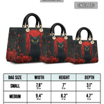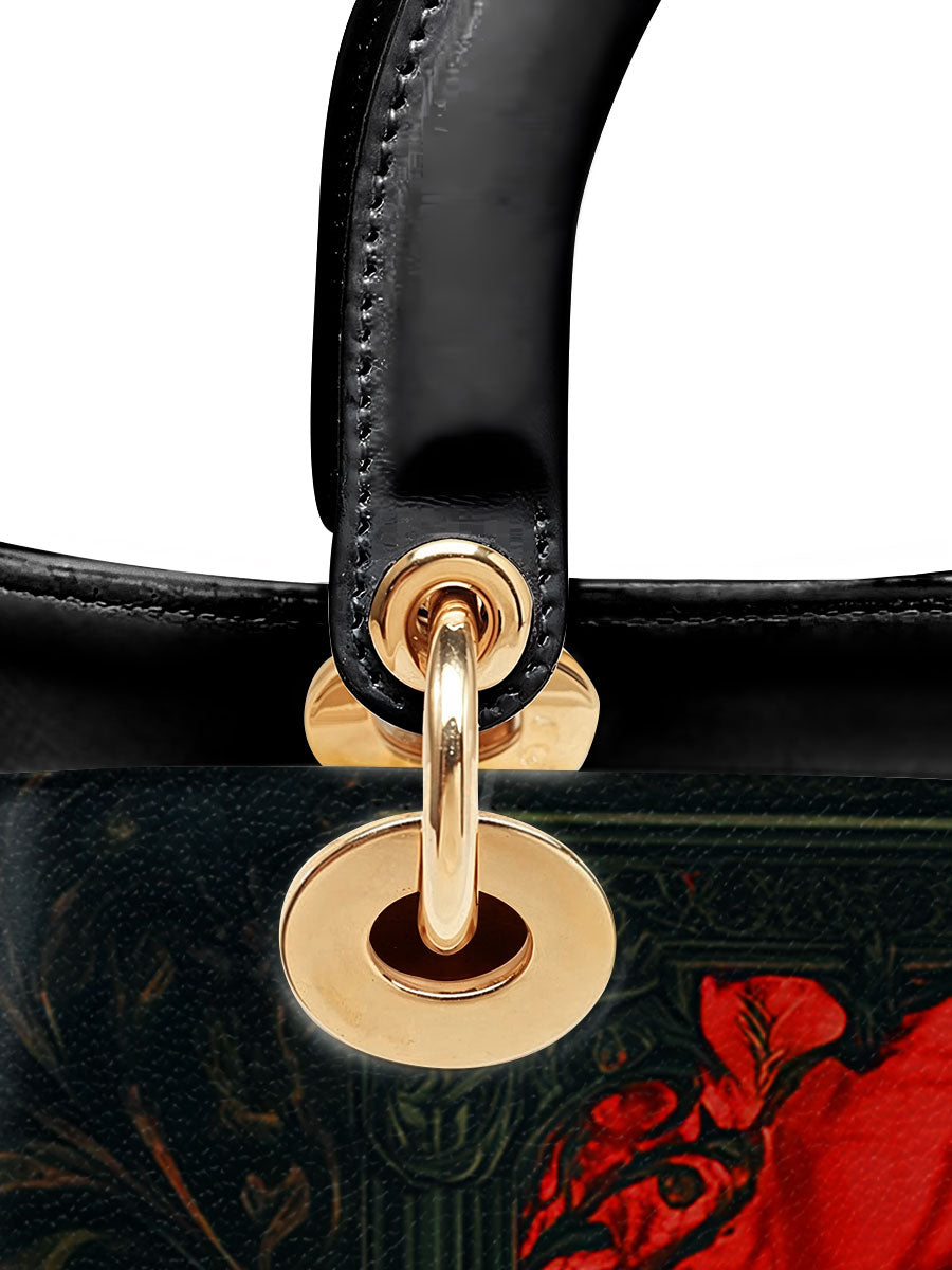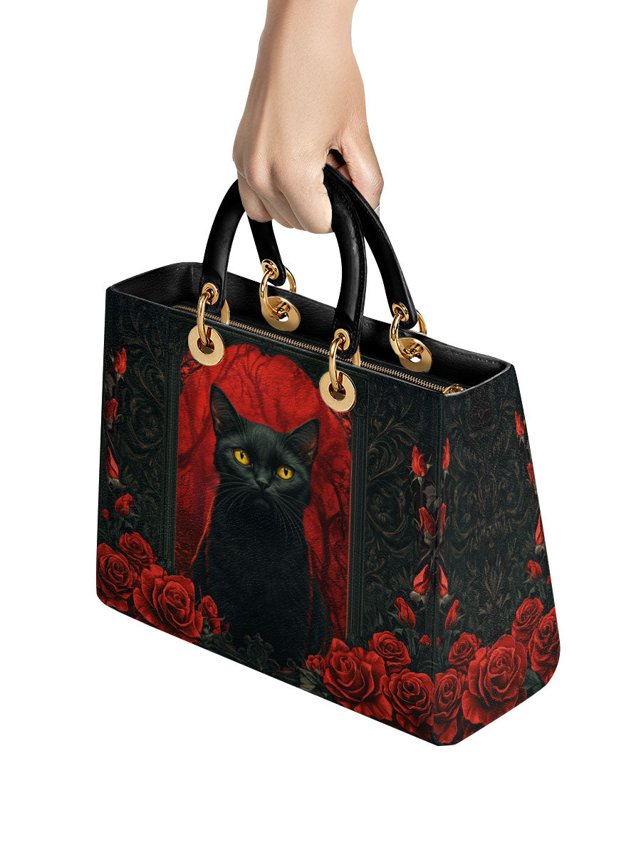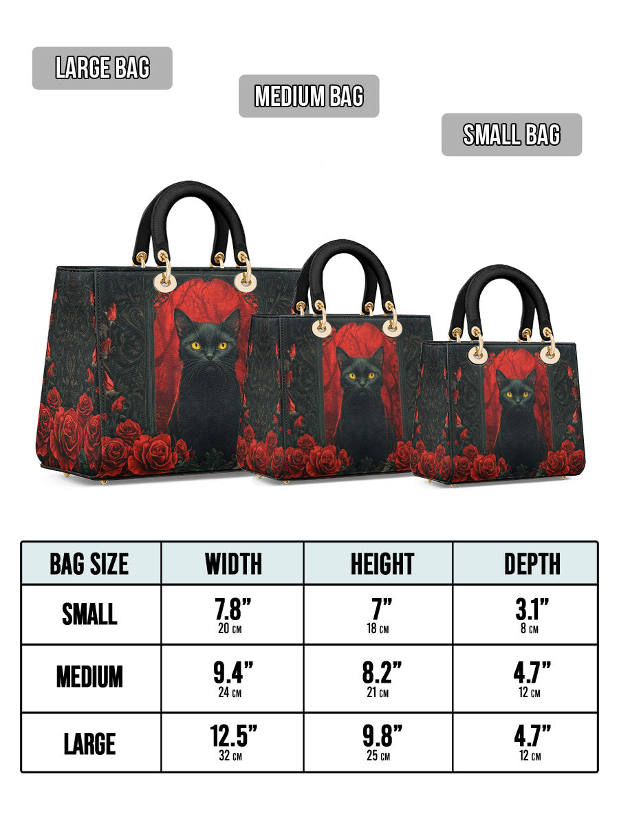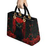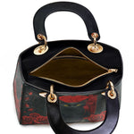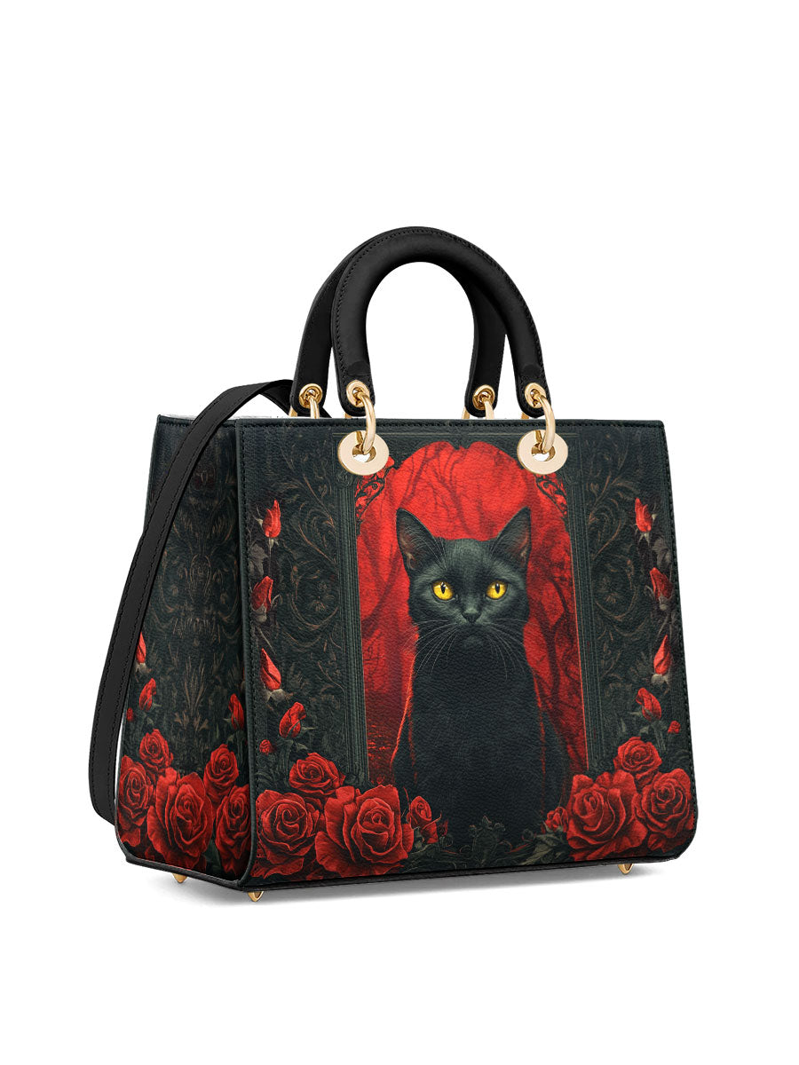 This striking leather handbag captures the allure of the mystical and the untamed. At the center sits a piercing-eyed black cat, framed by rich gothic patterns and a blood-red backdrop of roses—symbols of intuition, protection, and the wild feminine. It’s an artwork that whispers of moonlit rituals and deep, silent wisdom.