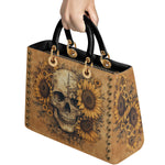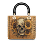 This handbag brings together striking contrast and raw beauty—a weathered skull surrounded by blooming sunflowers, symbolizing the dance between life and death. The warm, distressed tones and studded trim create a rugged yet refined aesthetic, perfect for those who embrace imperfection as part of their story.