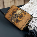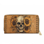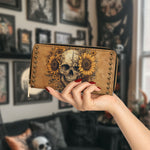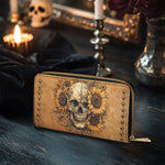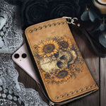 This wallet captures the unexpected harmony between mortality and light. A hauntingly detailed skull rests among radiant sunflowers, offering a design that’s equal parts mysterious and uplifting. The golden hues and intricate artwork draw the eye in, while the theme speaks to those who live authentically, fearlessly, and with heart.
