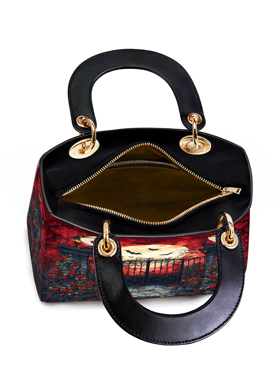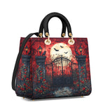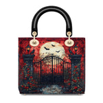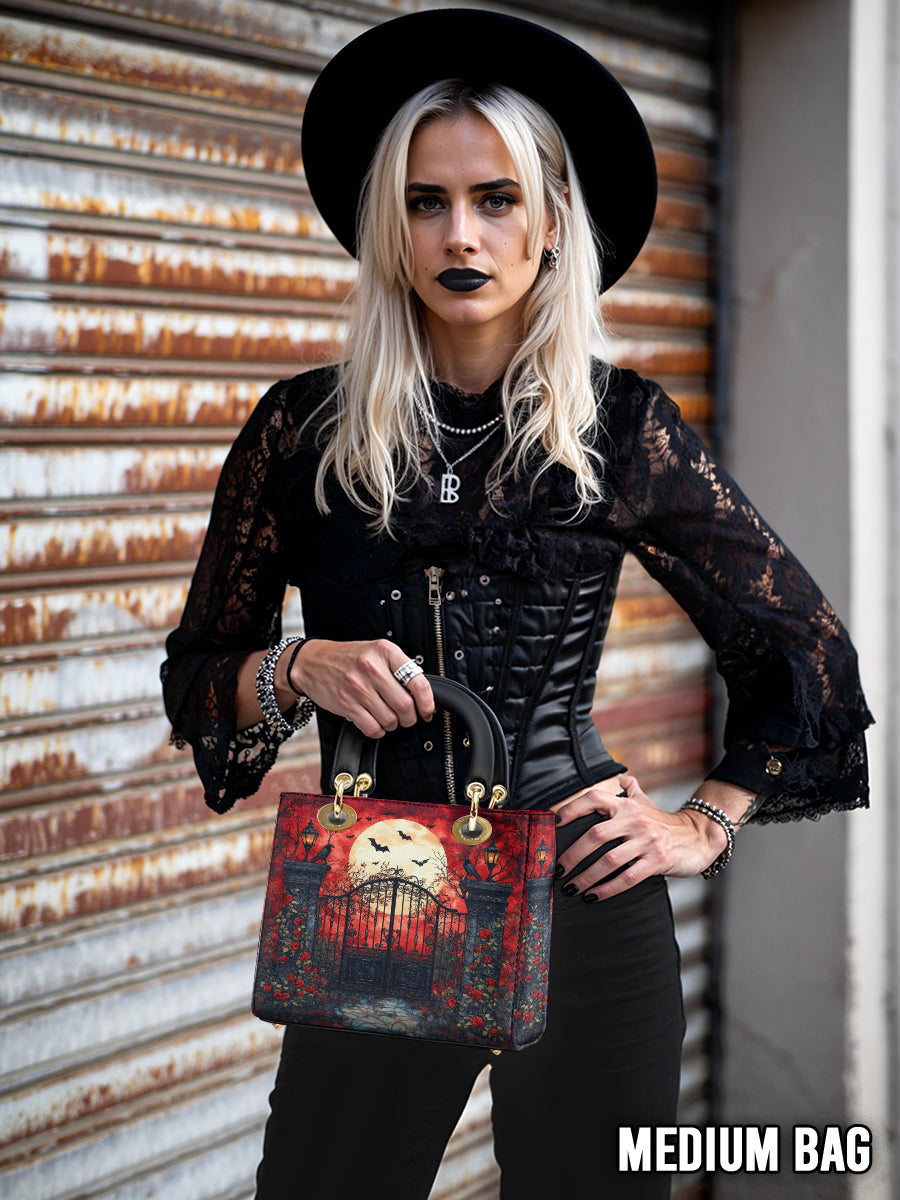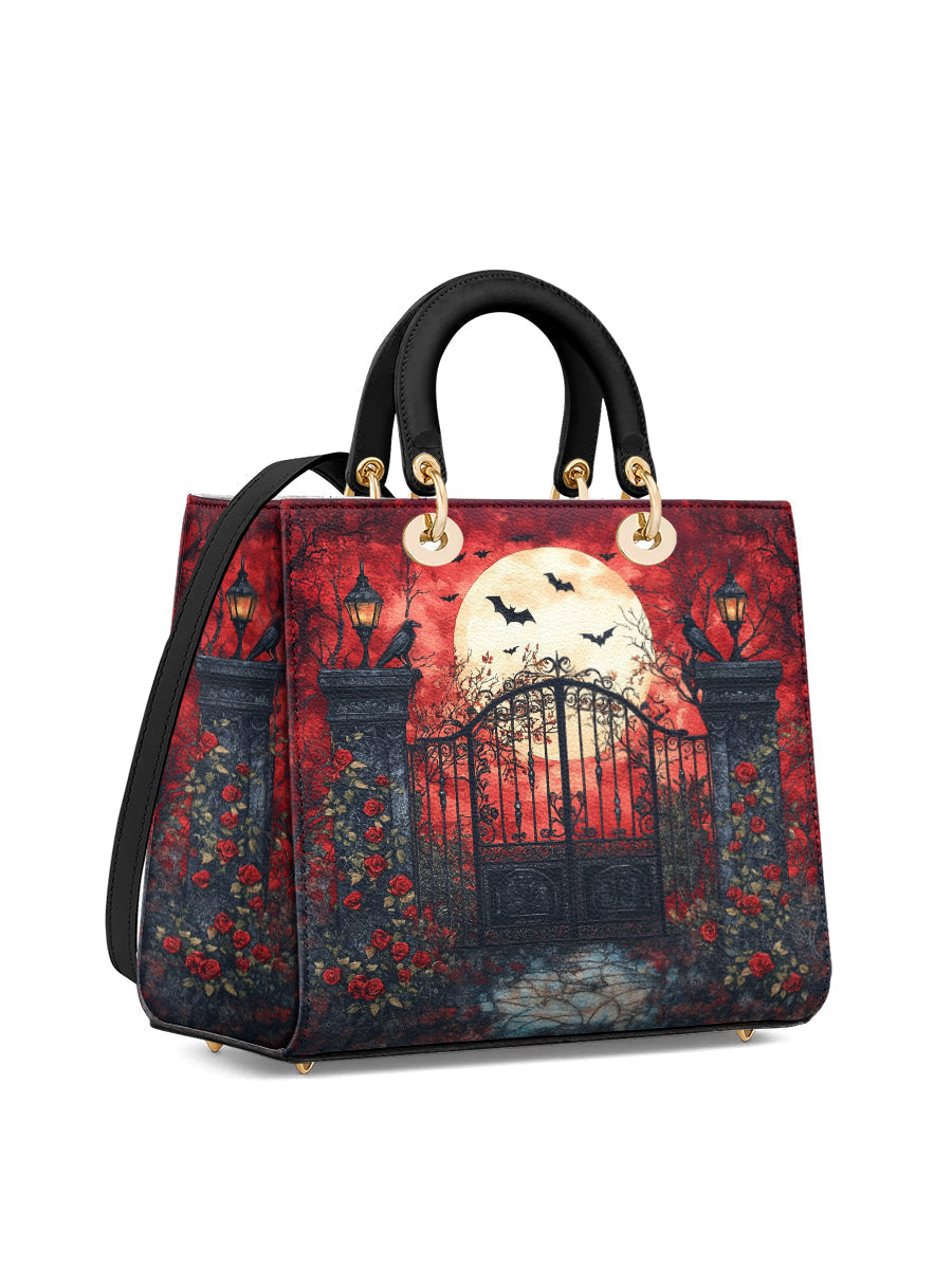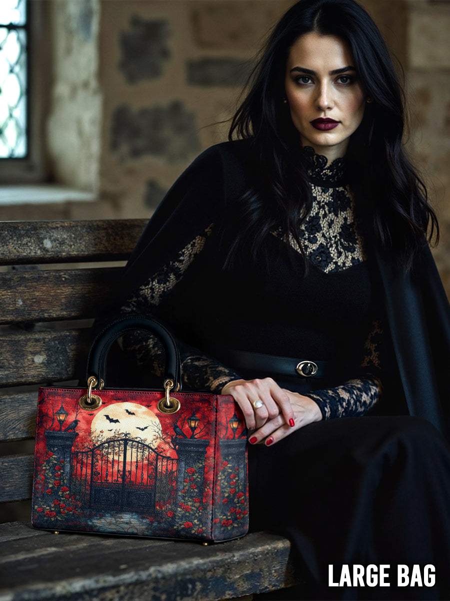 There are thresholds not meant to be crossed—unless you carry the courage to face what lies beyond. The Crimson Gate handbag captures that moment between dusk and darkness, where the moon rises like a beacon behind ornate iron gates, guarding secrets wrapped in roses and shadows. Bats soar beneath a blood-red sky, and black crows perch as silent sentinels to a world unseen.