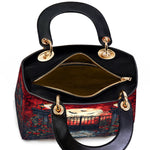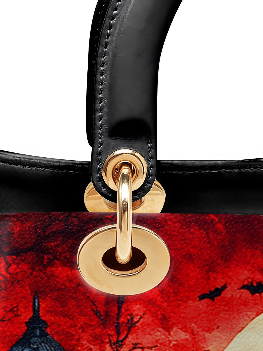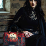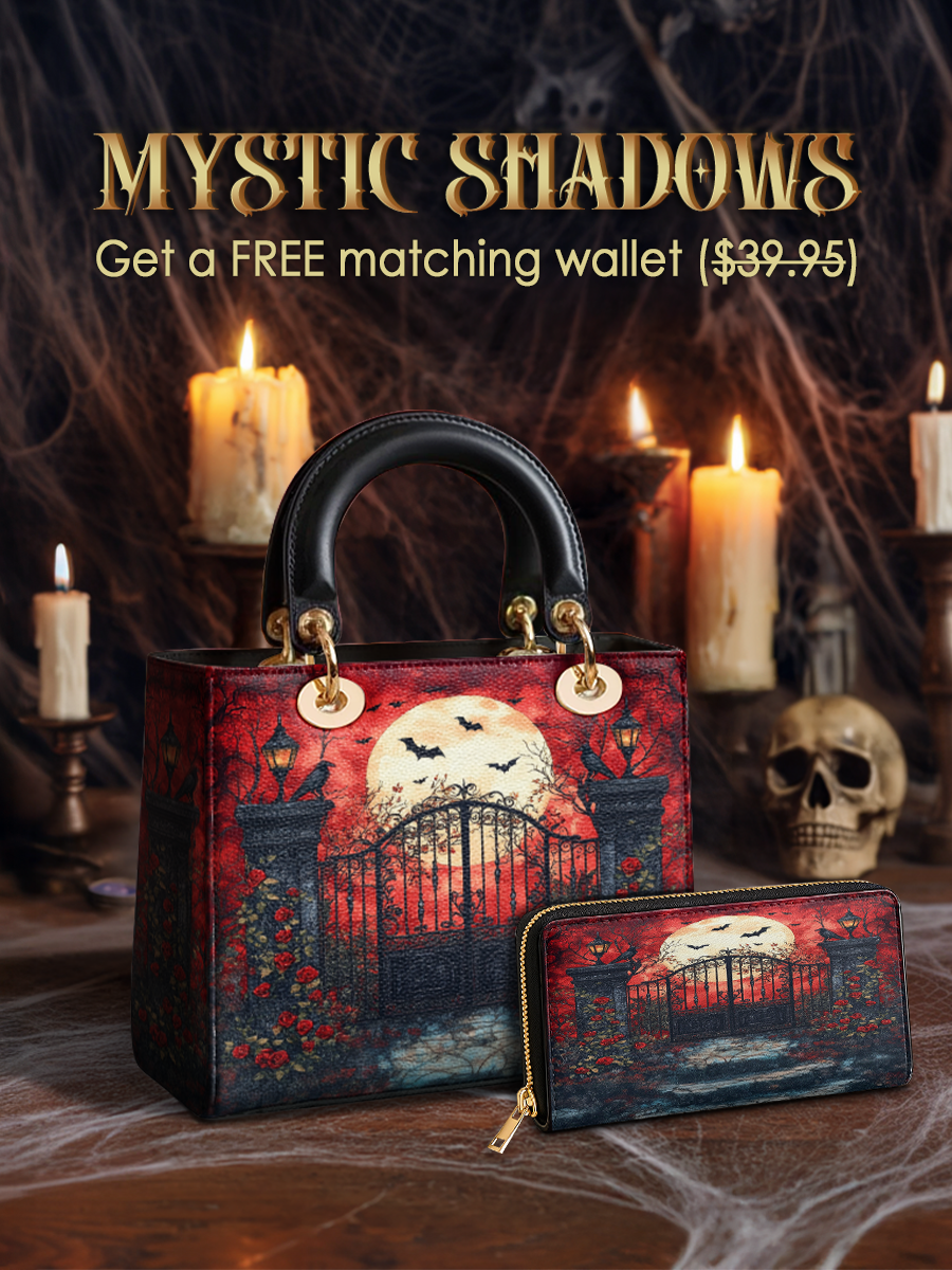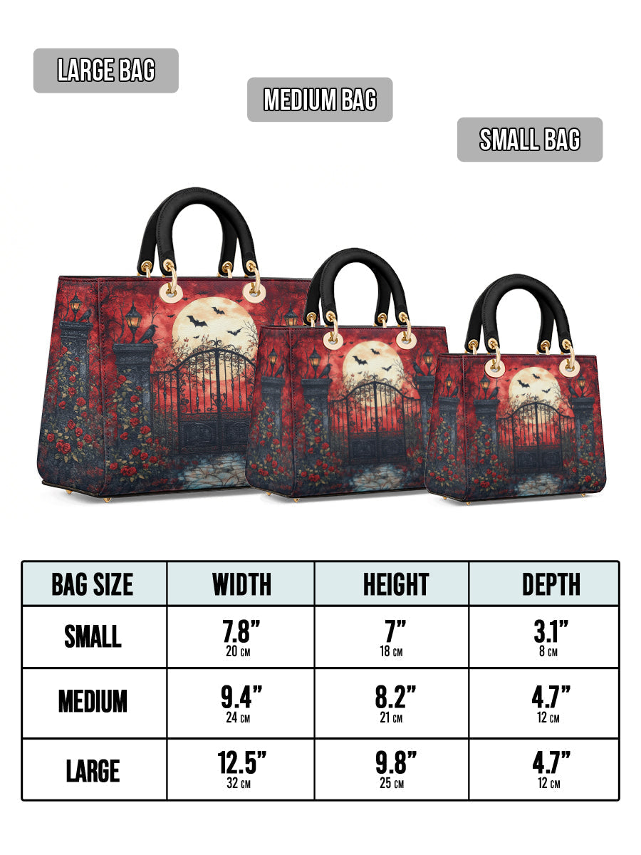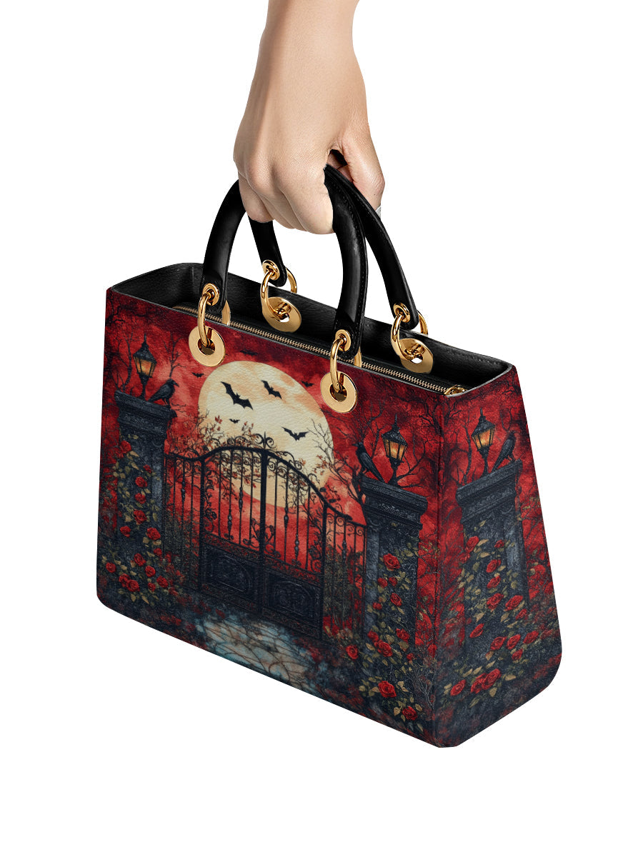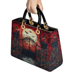 There are thresholds not meant to be crossed—unless you carry the courage to face what lies beyond. The Crimson Gate handbag captures that moment between dusk and darkness, where the moon rises like a beacon behind ornate iron gates, guarding secrets wrapped in roses and shadows. Bats soar beneath a blood-red sky, and black crows perch as silent sentinels to a world unseen.