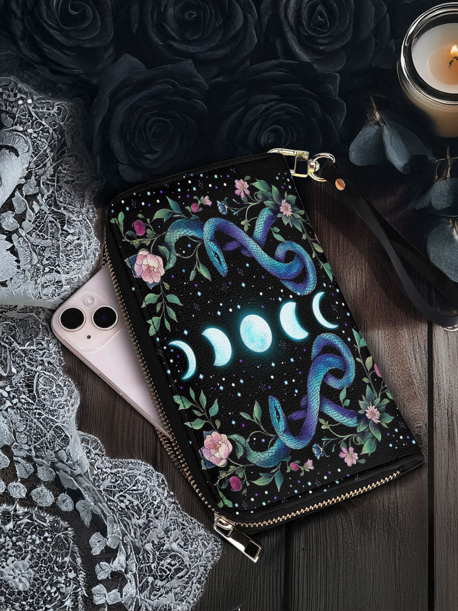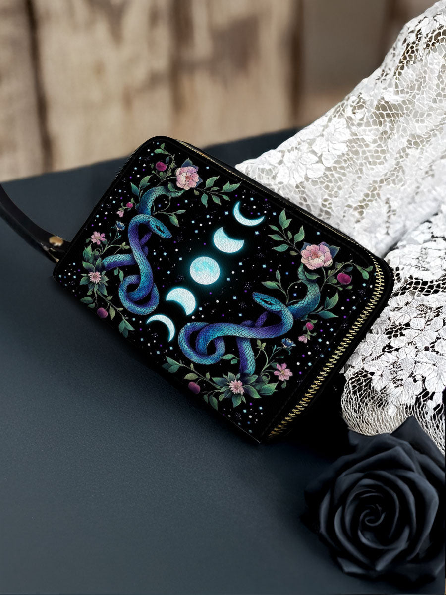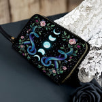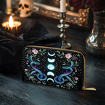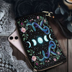 Infused with the symbolism of ancient wisdom, this wallet captures the essence of lunar energy and spiritual rebirth. The moon phases shine through a velvet-black sky, wrapped in a dance of serpents and enchanted florals—an ode to the cycle of change and the grace found within it.