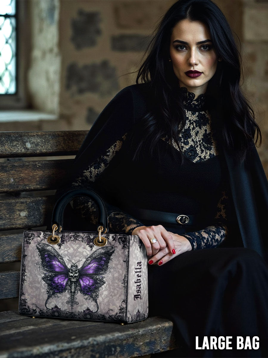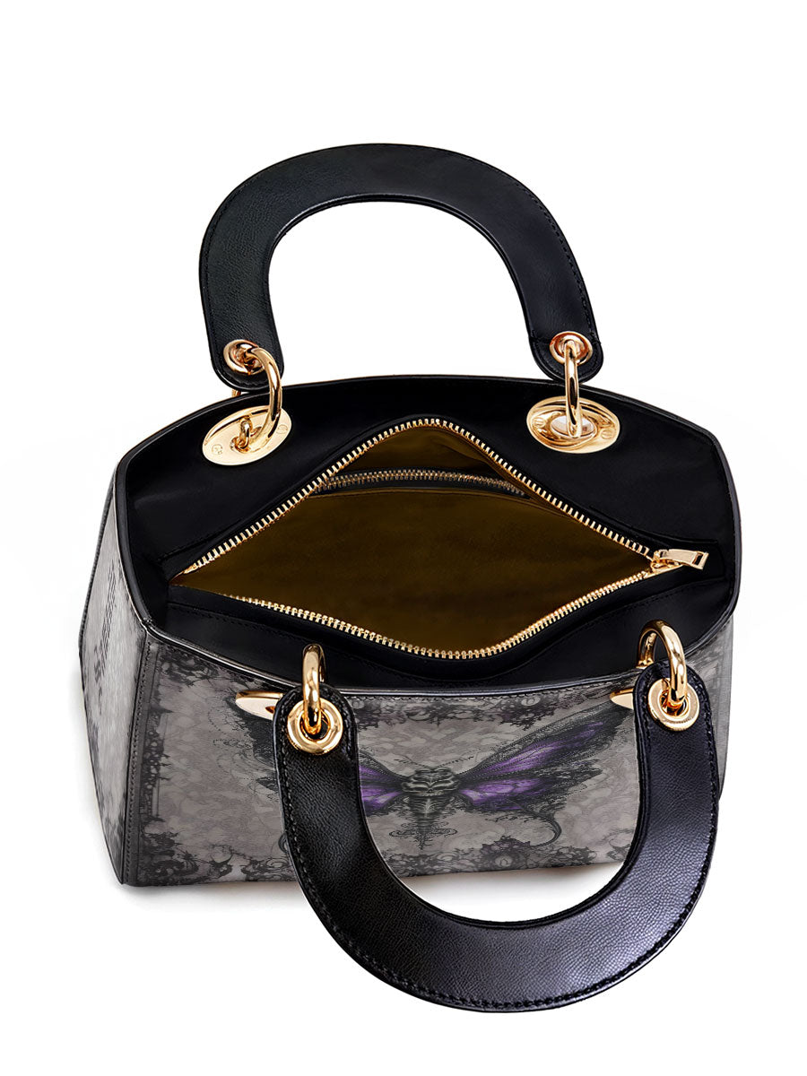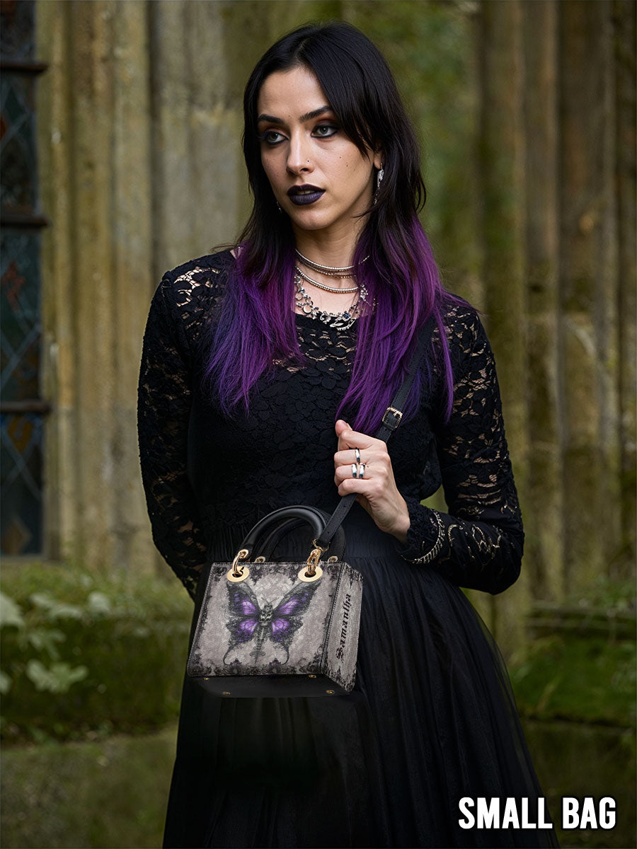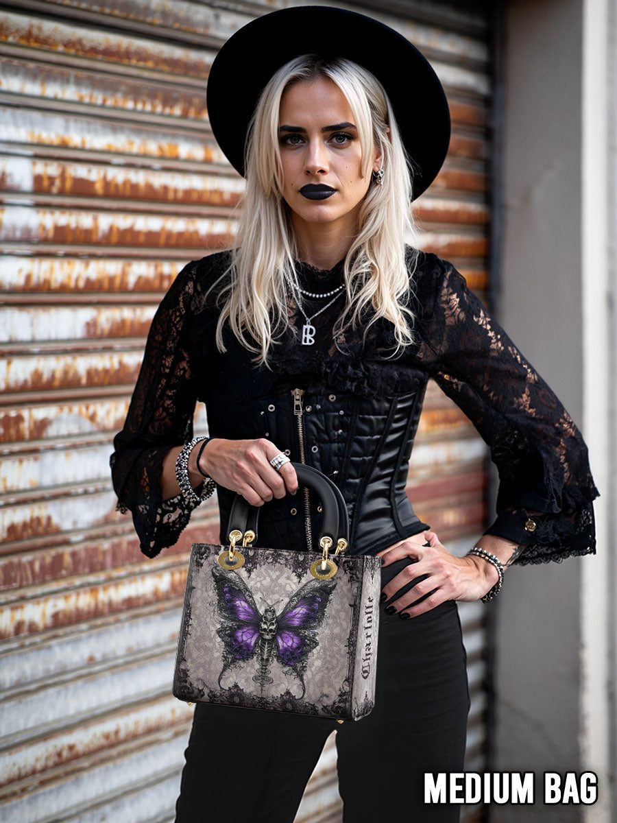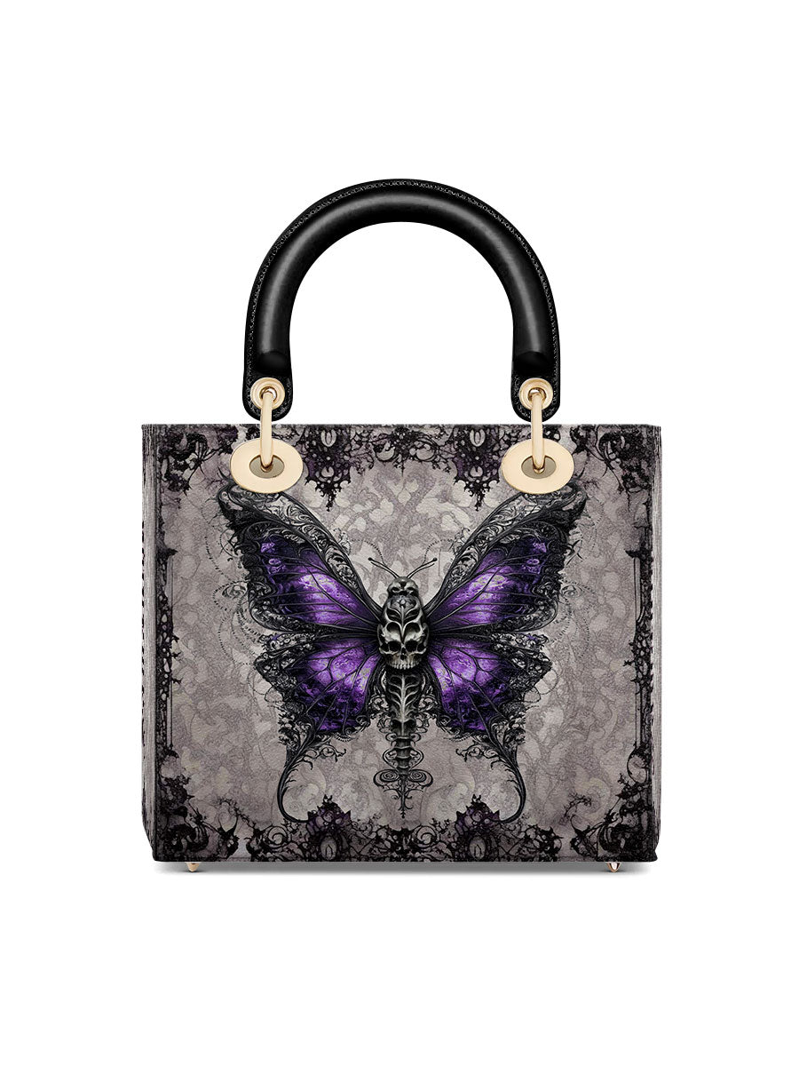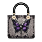 This captivating handbag unveils a fusion of transformation and mystery, embodied through the image of a gothic butterfly with vivid violet wings and skeletal undertones. Surrounded by ornate black filigree and soft grey textures, it carries a sense of quiet rebellion and poetic beauty. The butterfly, long a symbol of metamorphosis, is reimagined here with edge and power—perfect for those who embrace change on their own terms.