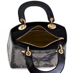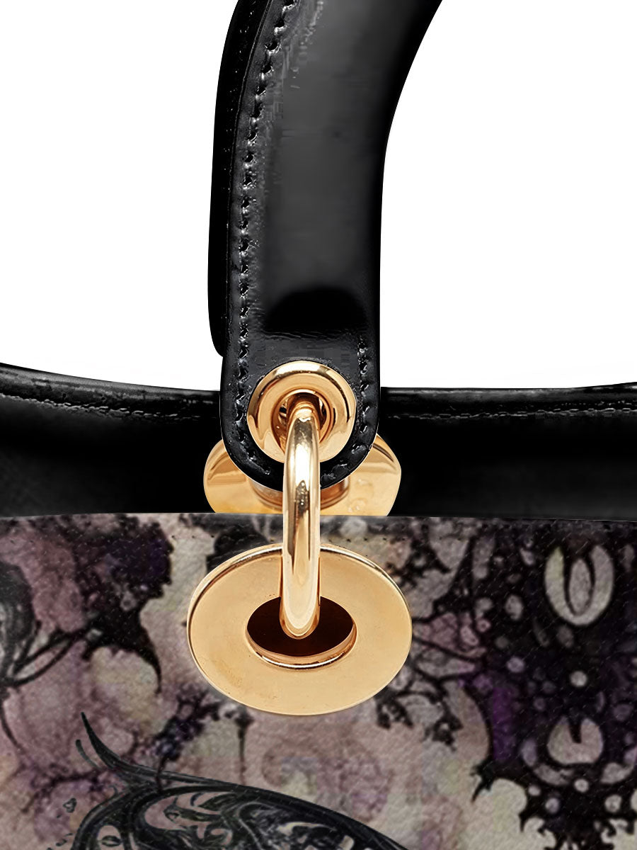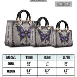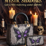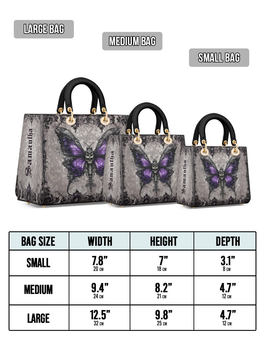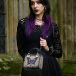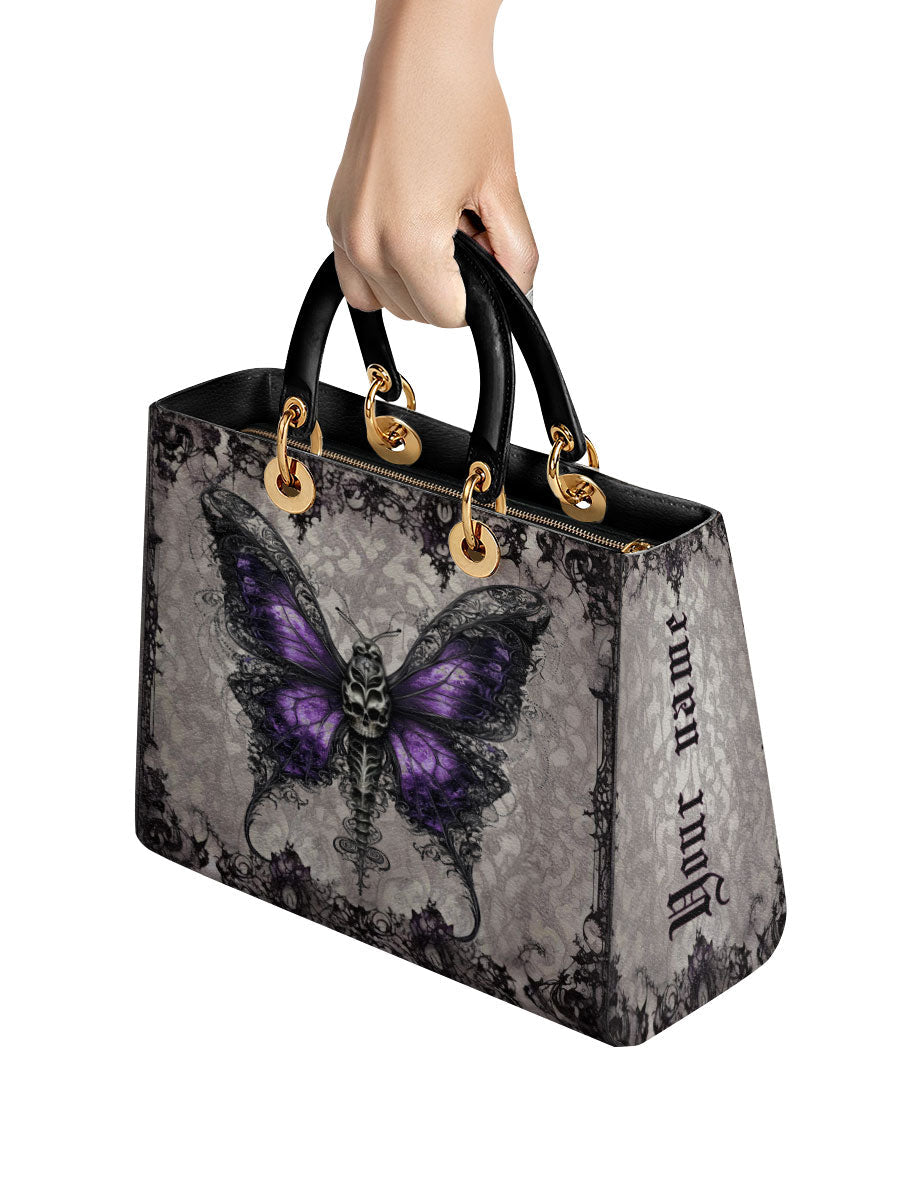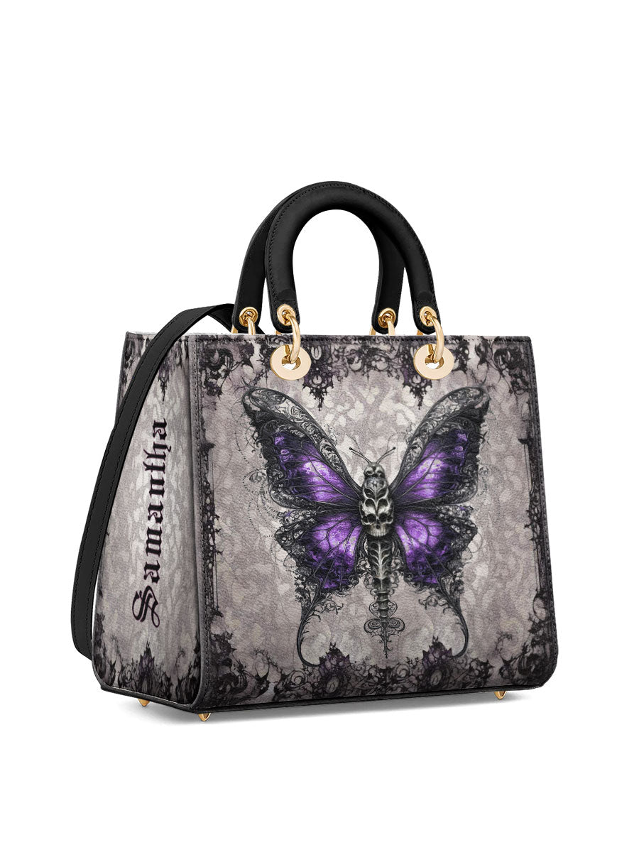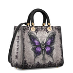 This captivating handbag unveils a fusion of transformation and mystery, embodied through the image of a gothic butterfly with vivid violet wings and skeletal undertones. Surrounded by ornate black filigree and soft grey textures, it carries a sense of quiet rebellion and poetic beauty. The butterfly, long a symbol of metamorphosis, is reimagined here with edge and power—perfect for those who embrace change on their own terms.