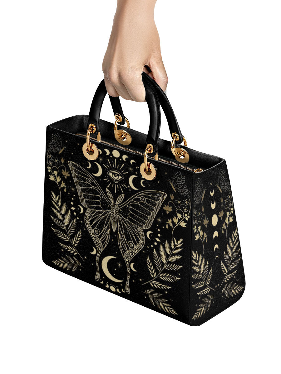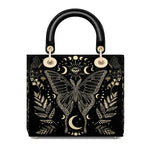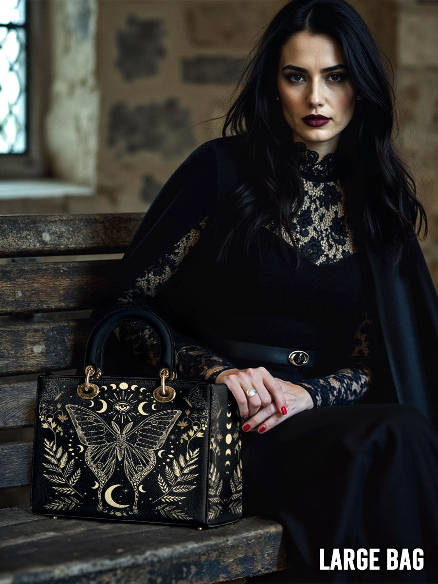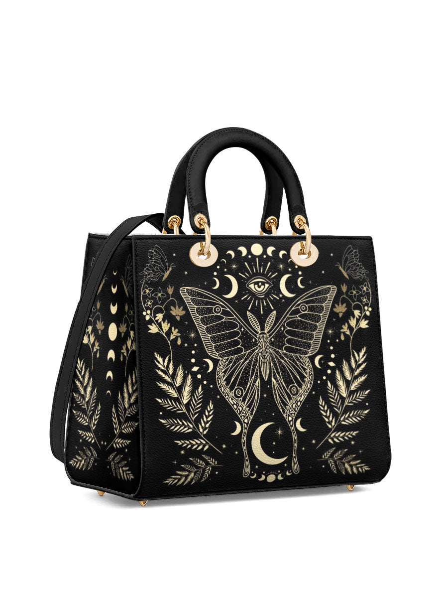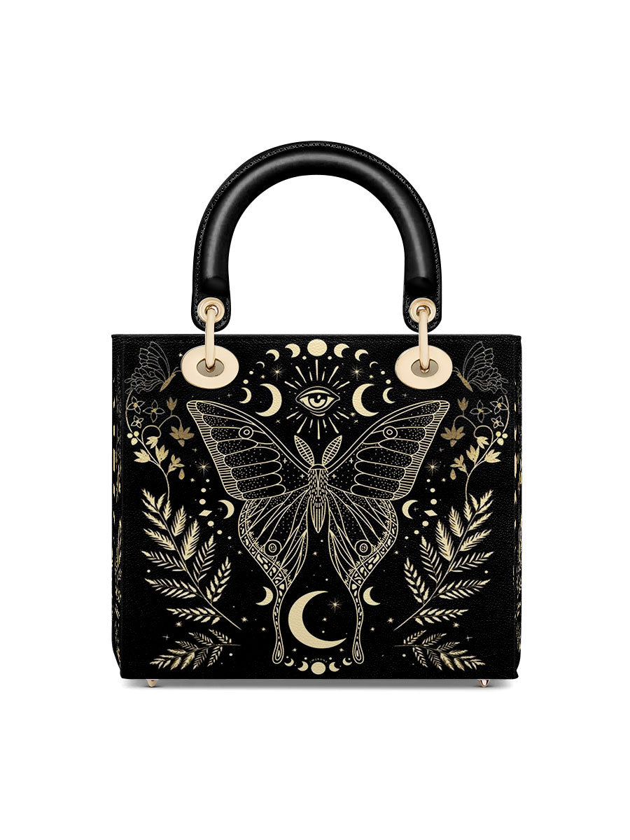 A radiant tribute to the divine feminine, this handbag features a stunning butterfly adorned with celestial symbols, crescent moons, and blooming laurels in luminous gold on a deep black background. The design evokes mystery, freedom, and sacred transformation, drawing inspiration from the moon’s phases and the spiritual journey of the soul. Every detail whispers of hidden knowledge and graceful strength, creating a visual harmony between elegance and power.