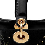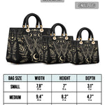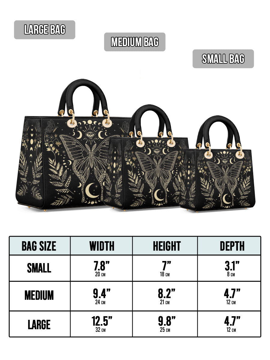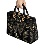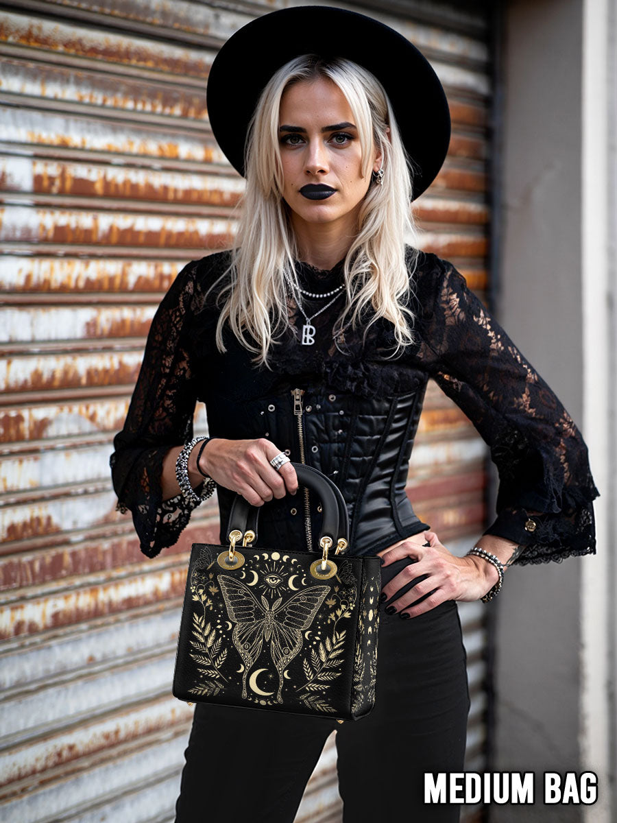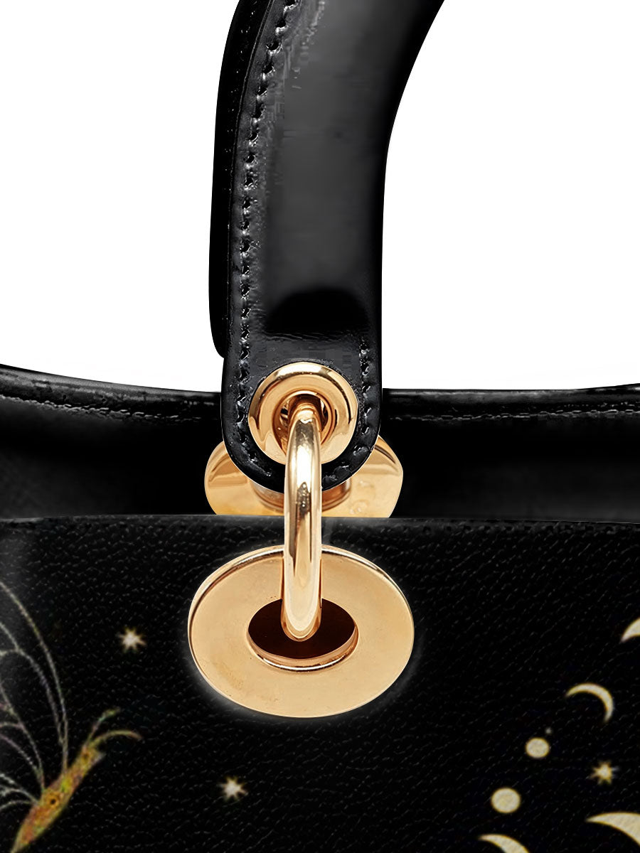 A radiant tribute to the divine feminine, this handbag features a stunning butterfly adorned with celestial symbols, crescent moons, and blooming laurels in luminous gold on a deep black background. The design evokes mystery, freedom, and sacred transformation, drawing inspiration from the moon’s phases and the spiritual journey of the soul. Every detail whispers of hidden knowledge and graceful strength, creating a visual harmony between elegance and power.