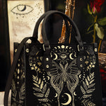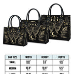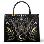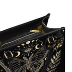 A radiant tribute to the divine feminine, this handbag features a stunning butterfly adorned with celestial symbols, crescent moons, and blooming laurels in luminous gold on a deep black background. The design evokes mystery, freedom, and sacred transformation, drawing inspiration from the moon’s phases and the spiritual journey of the soul. Every detail whispers of hidden knowledge and graceful strength, creating a visual harmony between elegance and power.
