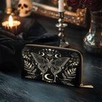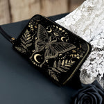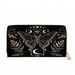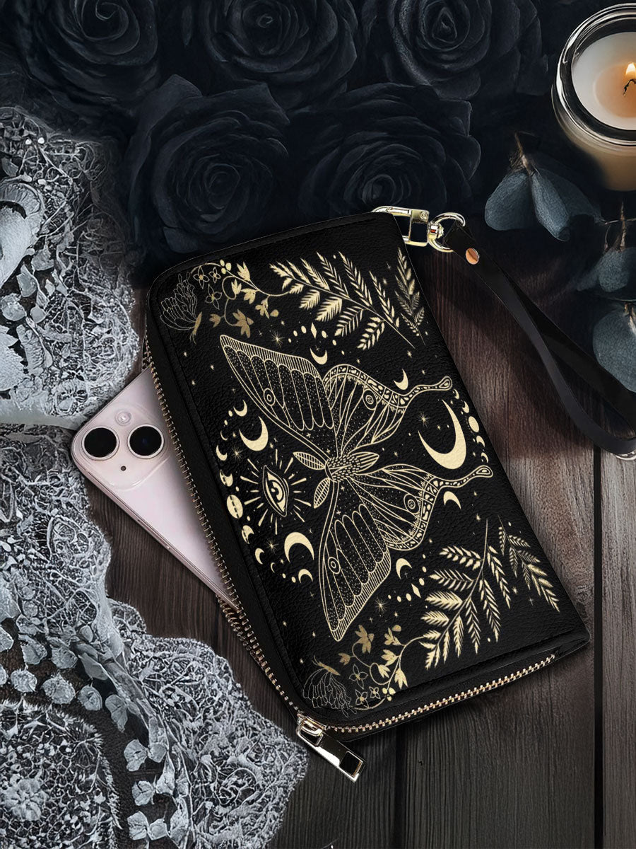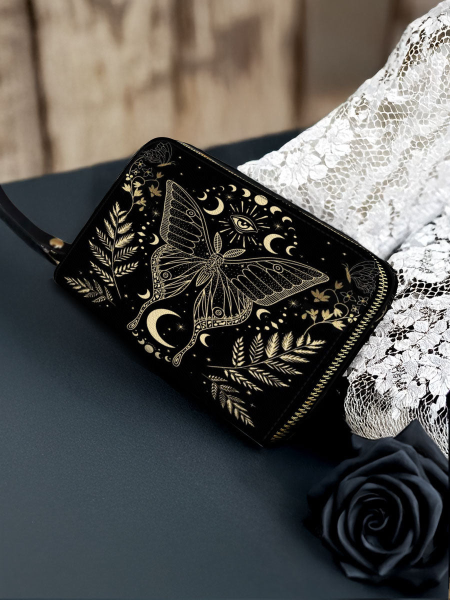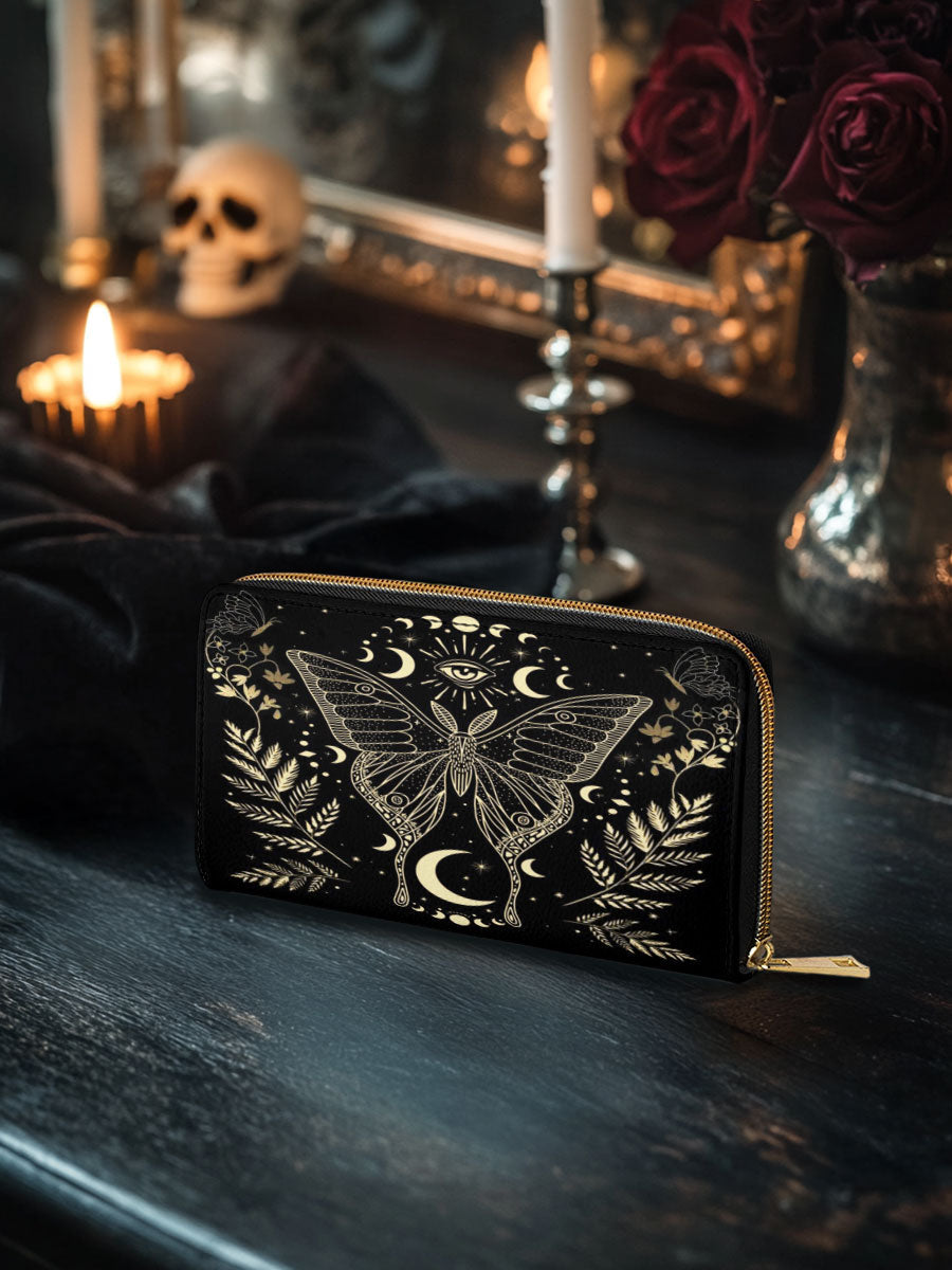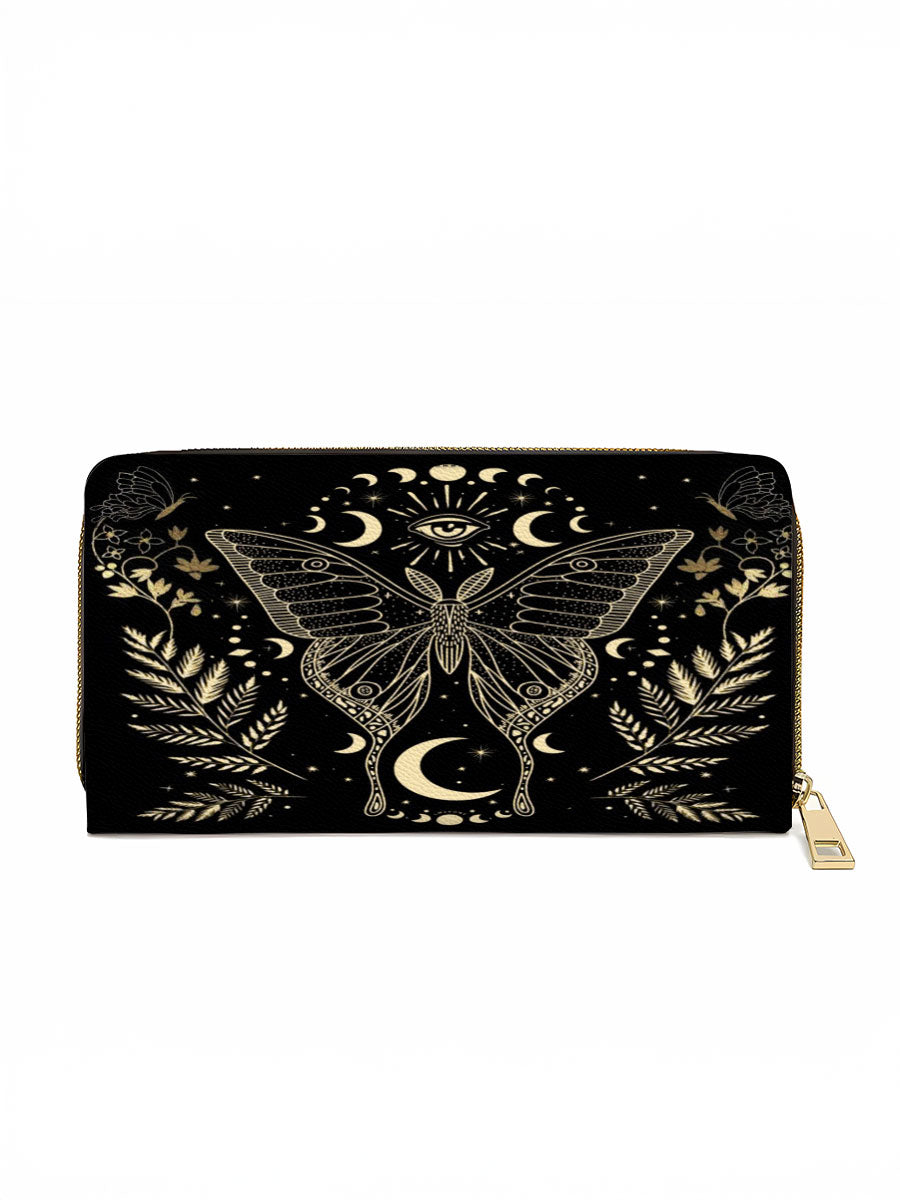 This wallet is a small yet powerful artifact of symbolic beauty. At its center, a golden butterfly spreads its wings, surrounded by lunar phases, cosmic elements, and branches that speak to growth and intuition. The artwork glows with a sense of ancient magic and refined femininity—perfect for those who see beauty in both the stars and shadows.