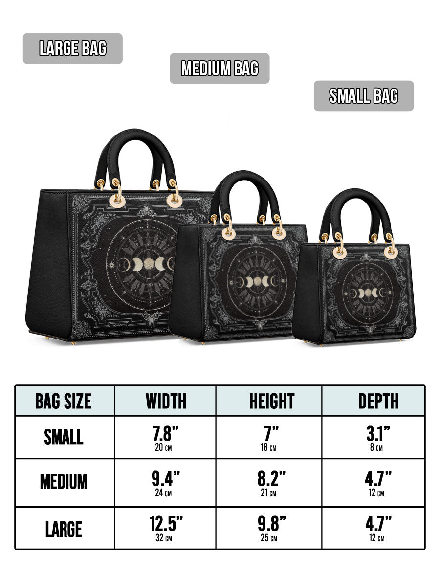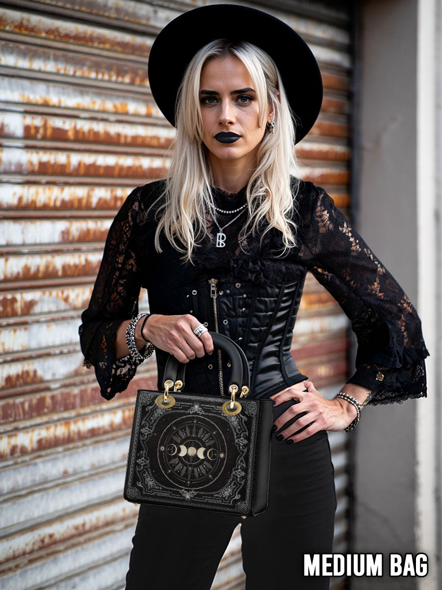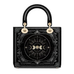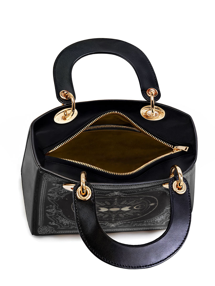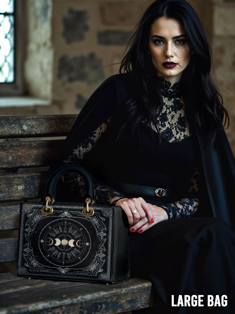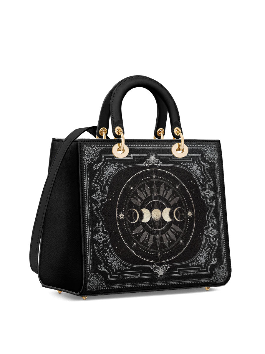 Step into the realm of mysticism and timeless grace with this lunar-inspired handbag. Adorned with a powerful moon phase centerpiece framed in celestial geometry, the design invites a deep connection to intuition, rhythm, and inner wisdom. The intricate detailing against a dark, cosmic background evokes both magic and mystery—capturing the essence of the divine feminine.