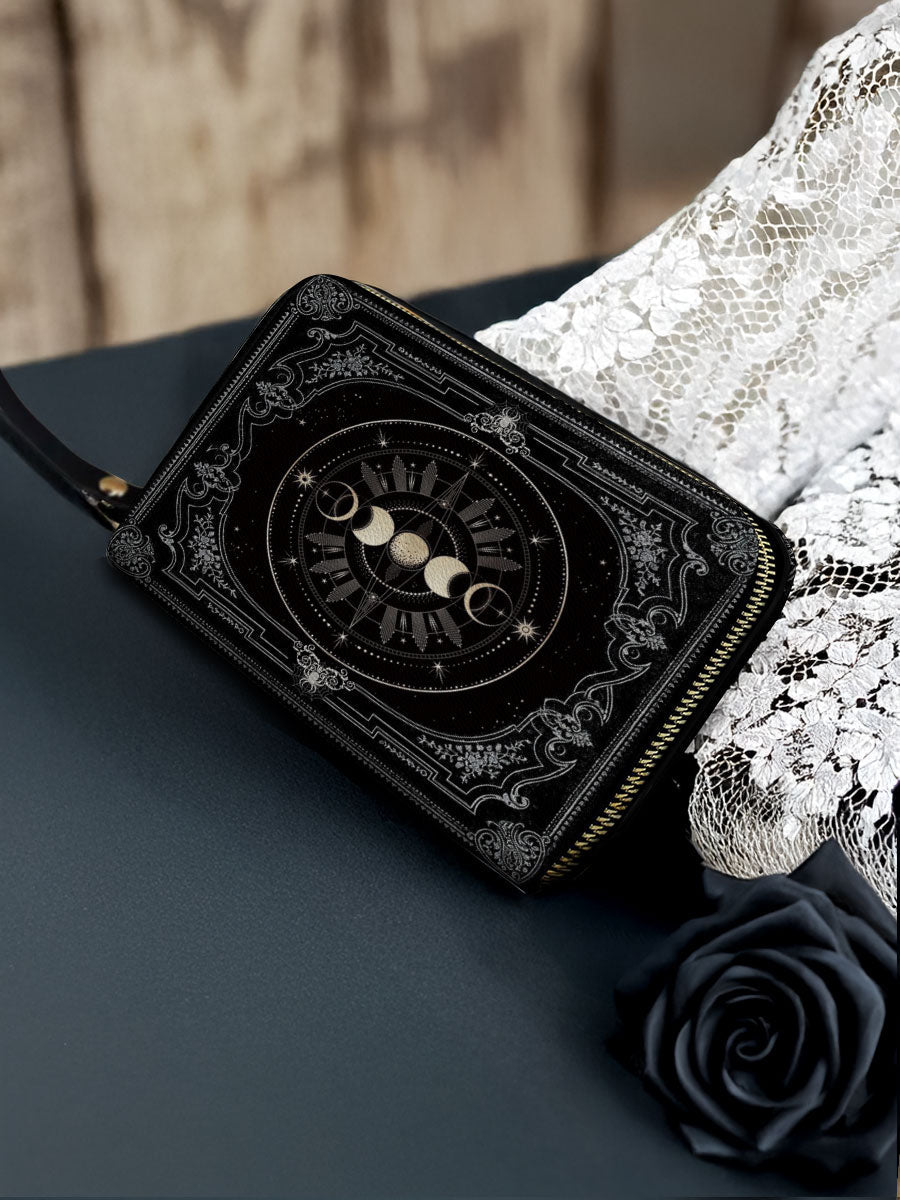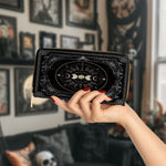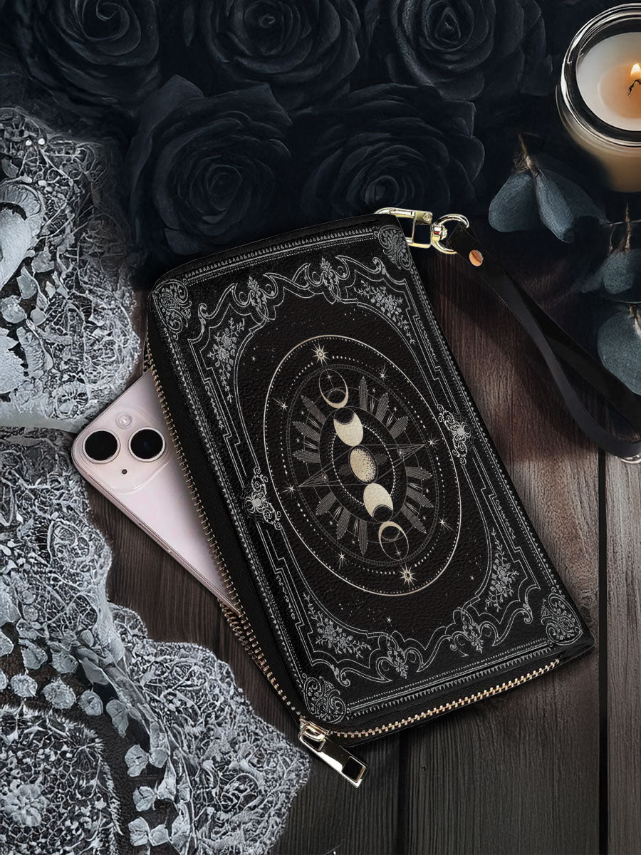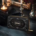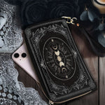 A sacred talisman for your everyday rituals, this wallet channels the profound energy of the moon’s phases. Each symbol speaks of cycles—beginnings, endings, and the beautiful in-between. The symmetrical layout, steeped in symbolism, is surrounded by ornate flourishes that enhance the sense of cosmic order and quiet power.