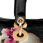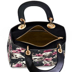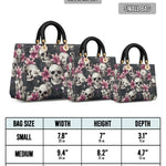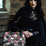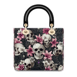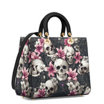 This handbag is a bold expression of life’s duality — fierce yet feminine, dark yet delicate. The hauntingly beautiful skulls emerge from a shadowed backdrop, softened by the soft blush of blooming lilies. Every detail is intricately rendered, creating a visual story that speaks of both resilience and elegance.