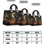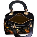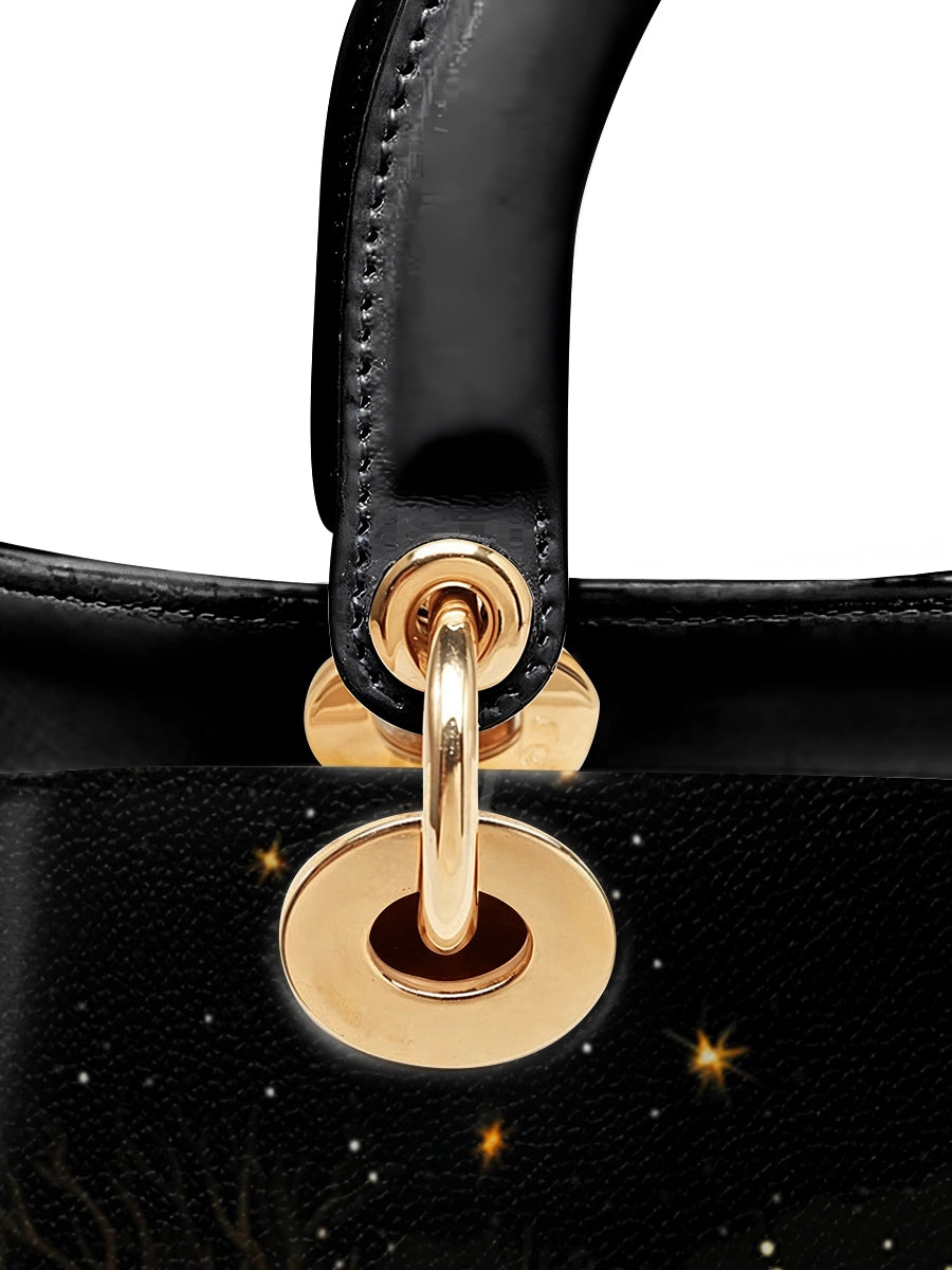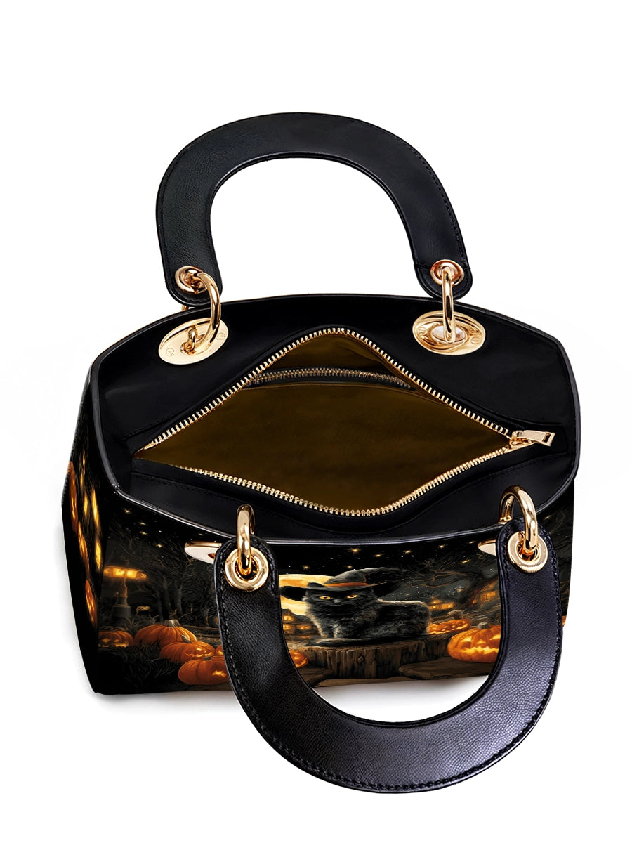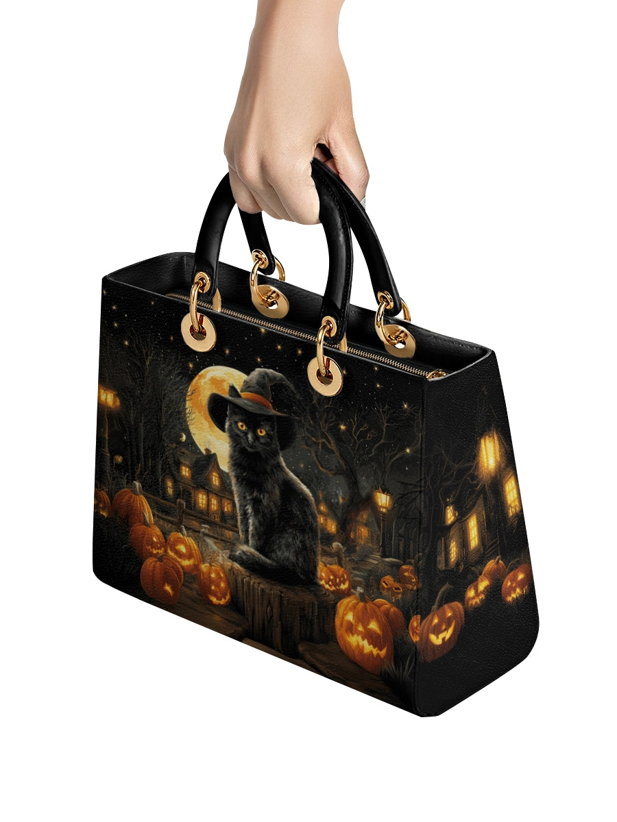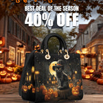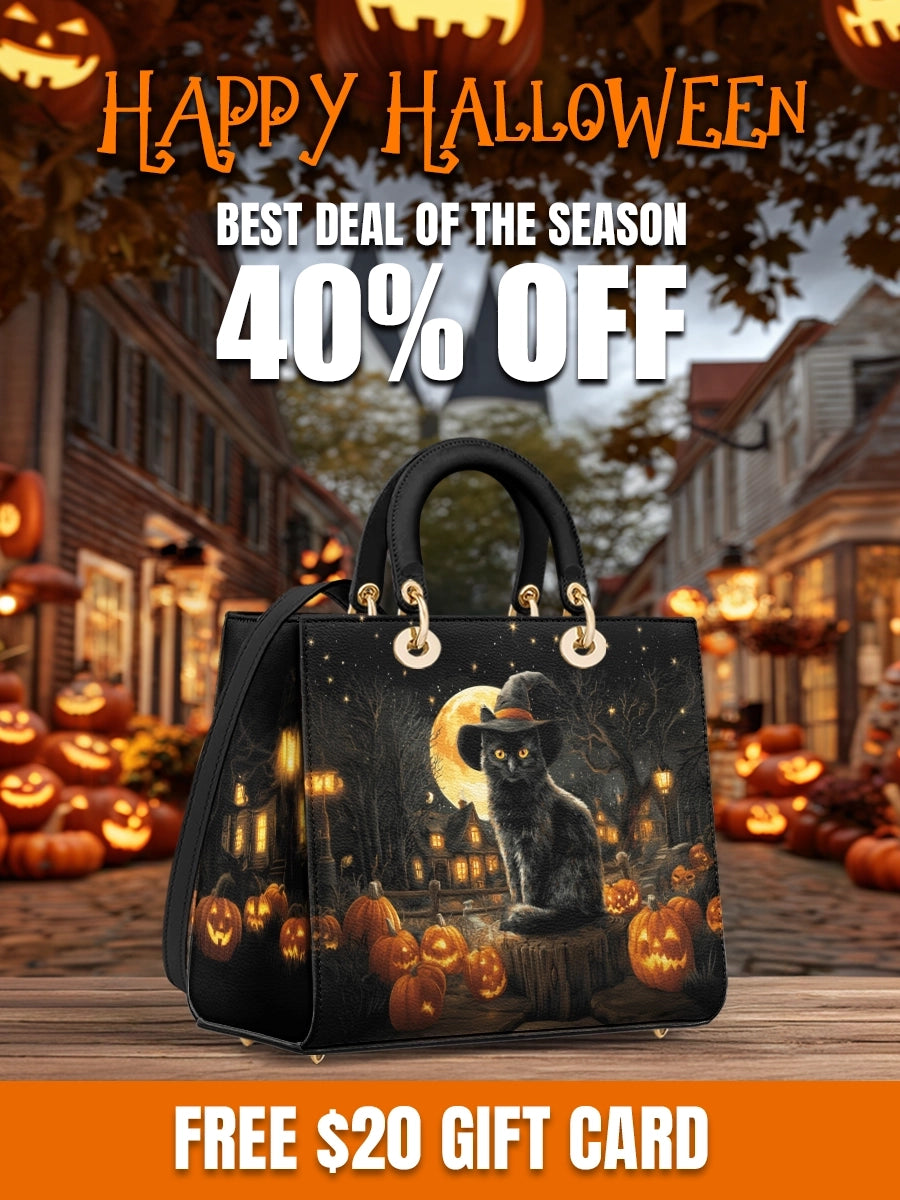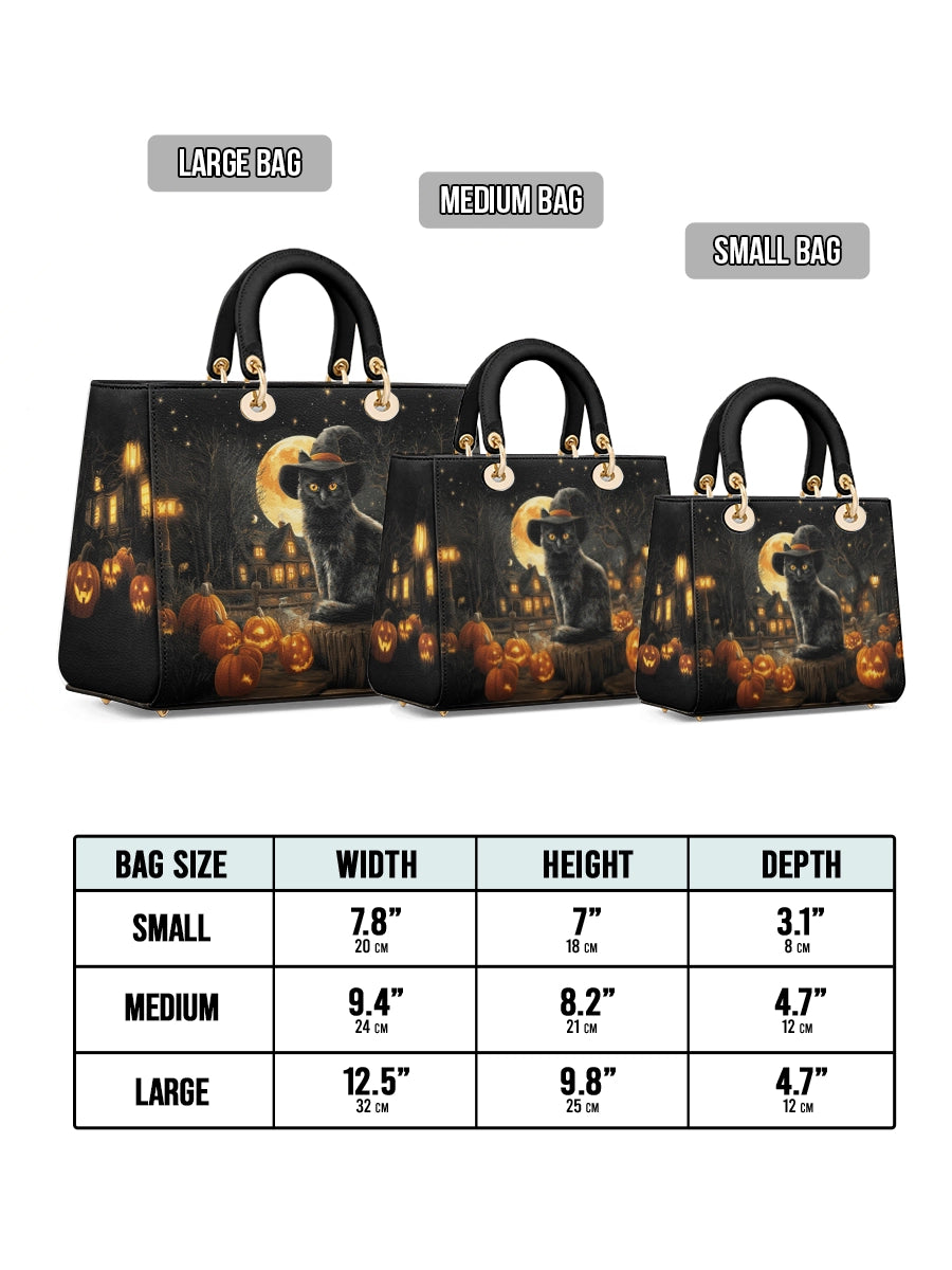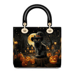 This bag features a whimsical Halloween scene sculpted in high-relief leather, capturing the magical mischief of a black cat beneath the full moon. Surrounded by grinning jack-o'-lanterns and glowing lanterns, the cat perches confidently on a tree stump, donning a classic witch hat with playful charm. In the background, crooked cottages and bare trees are bathed in golden light, evoking the spirit of a sleepy haunted village on Halloween night. The warm glow of oranges and deep shadows contrast beautifully with the sleek black leather, creating a rich visual narrative. More than just a bag, it’s a tale of mystery, charm, and Halloween nostalgia — forever etched in leather.