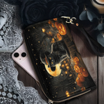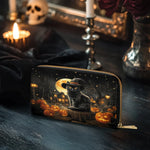 This wallet purse features a whimsical Halloween scene sculpted in high-relief leather, capturing the magical mischief of a black cat beneath the full moon. Surrounded by grinning jack-o'-lanterns and glowing lanterns, the cat perches confidently on a tree stump, donning a classic witch hat with playful charm. In the background, crooked cottages and bare trees are bathed in golden light, evoking the spirit of a sleepy haunted village on Halloween night. The warm glow of oranges and deep shadows contrast beautifully with the sleek black leather, creating a rich visual narrative. More than just a wallet, it’s a tale of mystery, charm, and Halloween nostalgia — forever etched in leather
