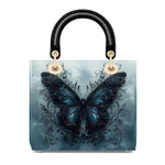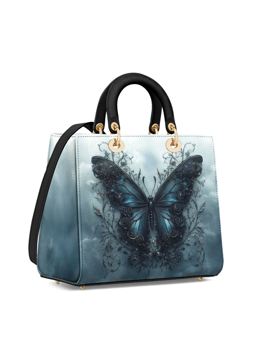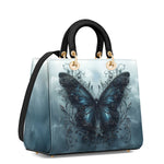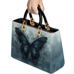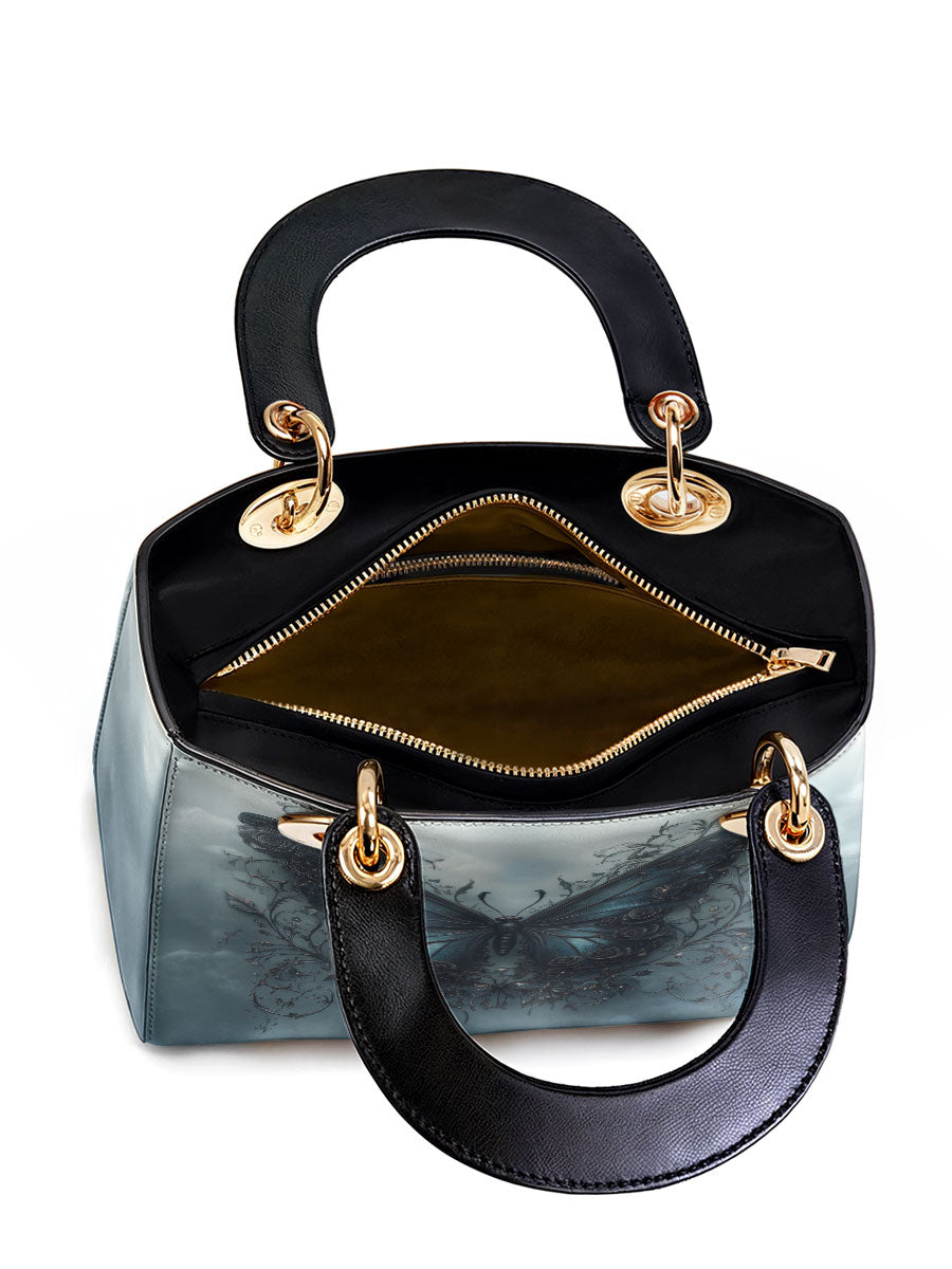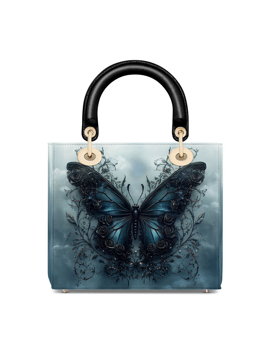 This captivating handbag features a mesmerizing midnight-blue butterfly rising from a tangle of dark vines, set against a misty sky that feels both otherworldly and serene. The wings glisten with quiet strength, detailed with baroque swirls that hint at transformation, resilience, and the beauty found in stillness. It evokes the symbolism of rebirth through darkness, a graceful tribute to women who have emerged stronger through life’s shadows.