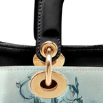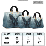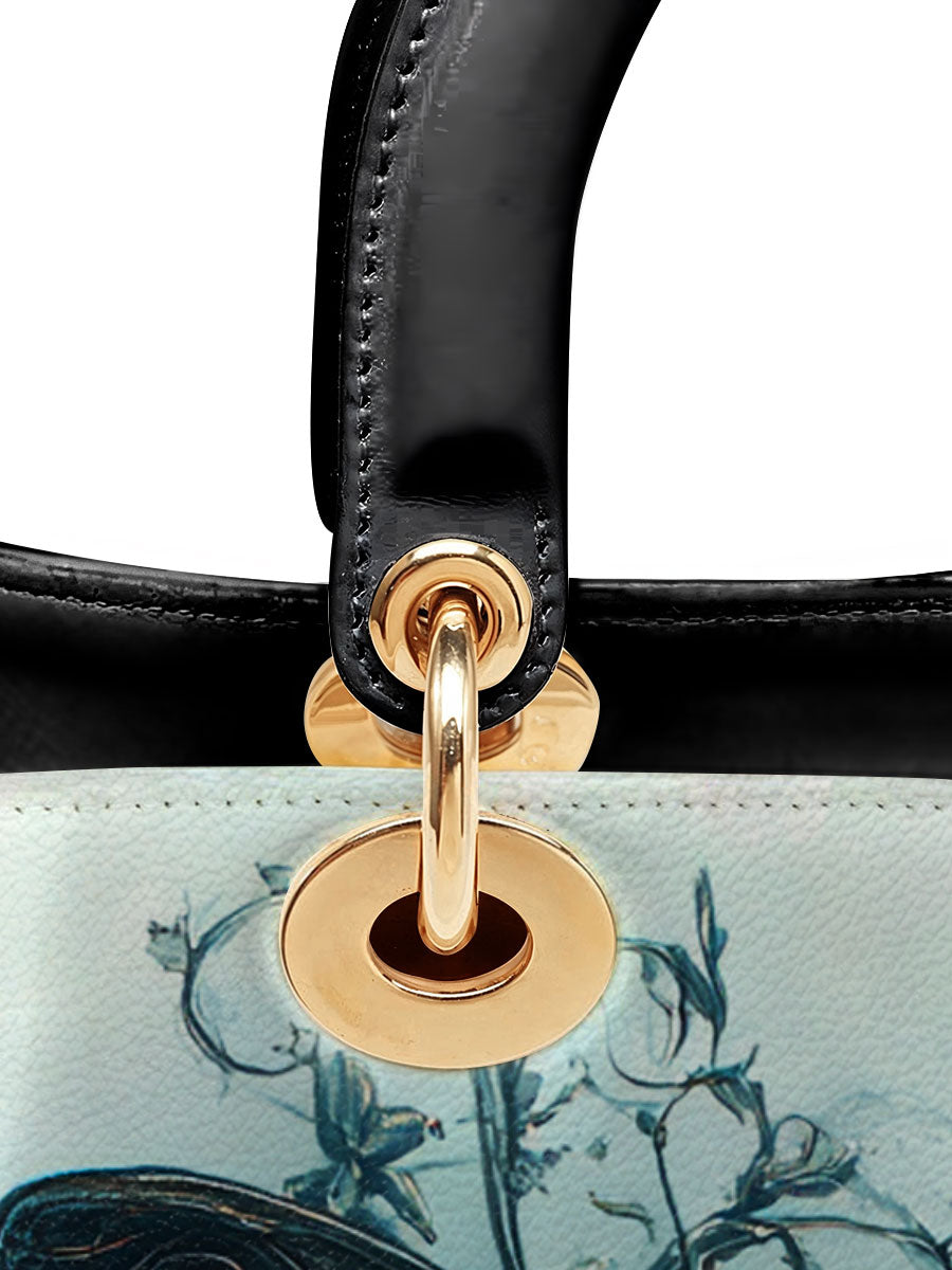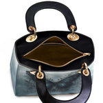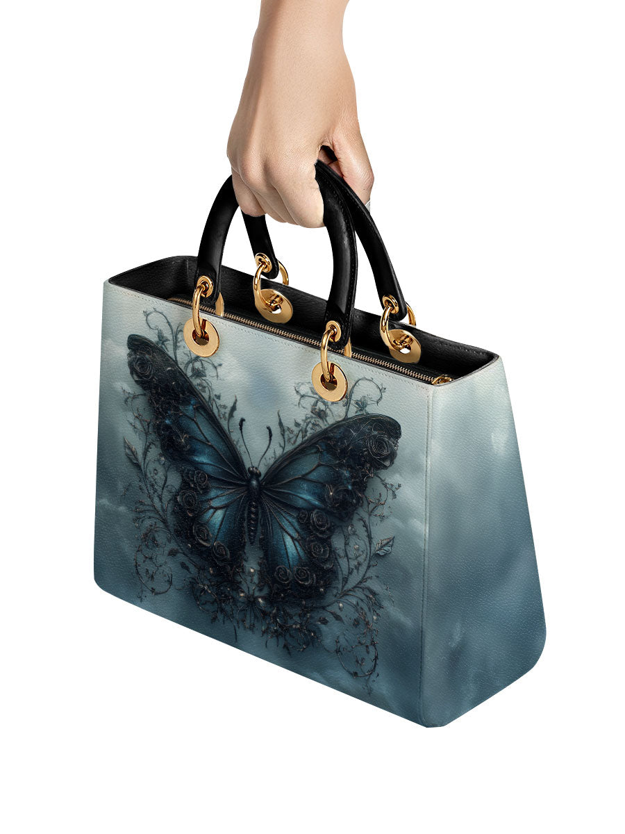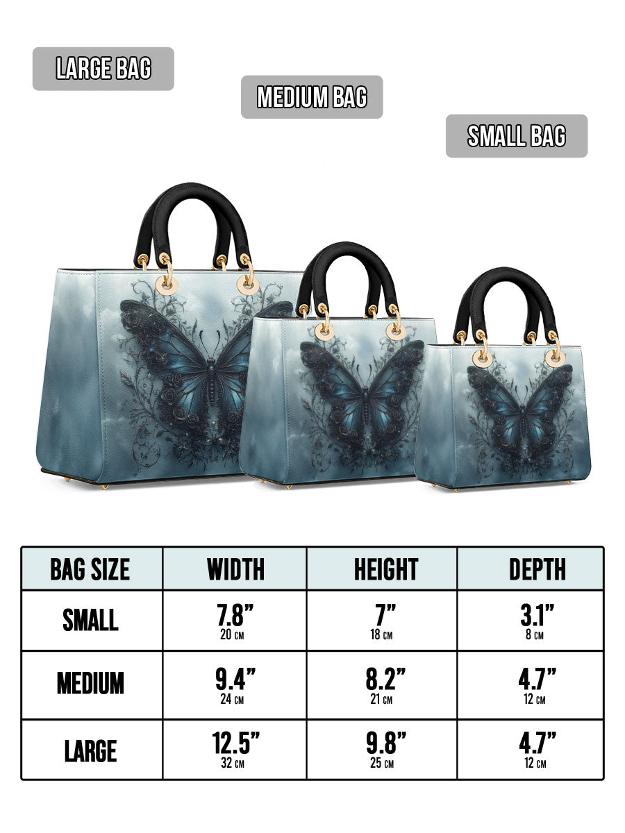 This captivating handbag features a mesmerizing midnight-blue butterfly rising from a tangle of dark vines, set against a misty sky that feels both otherworldly and serene. The wings glisten with quiet strength, detailed with baroque swirls that hint at transformation, resilience, and the beauty found in stillness. It evokes the symbolism of rebirth through darkness, a graceful tribute to women who have emerged stronger through life’s shadows.