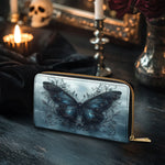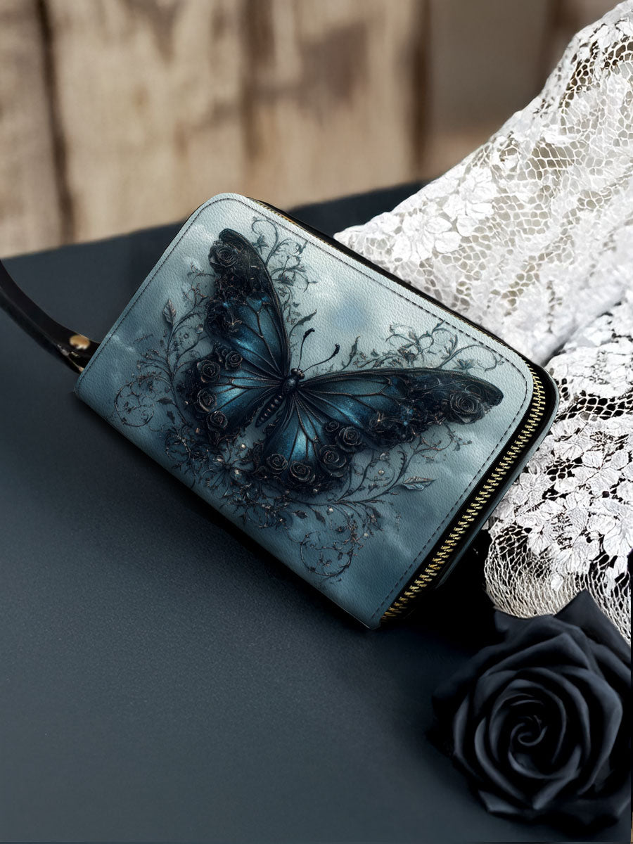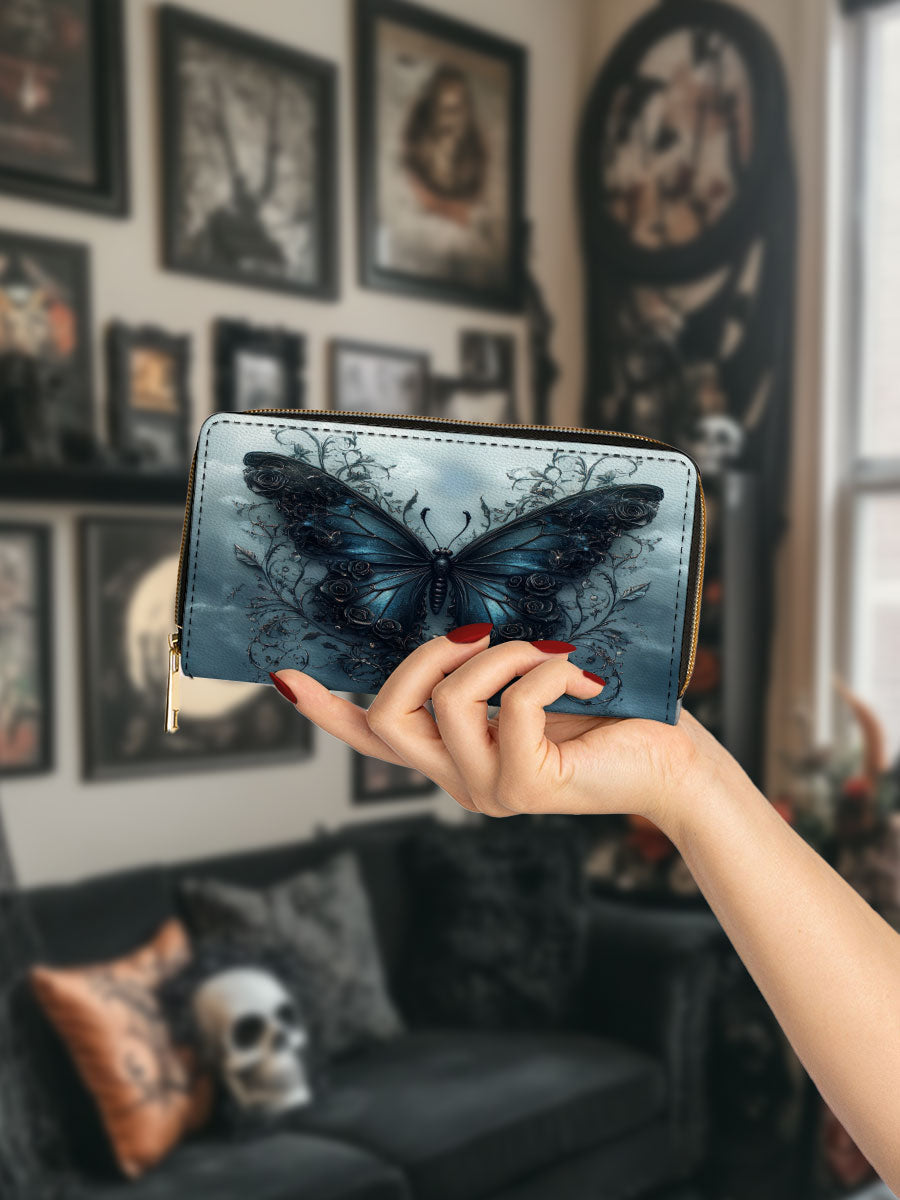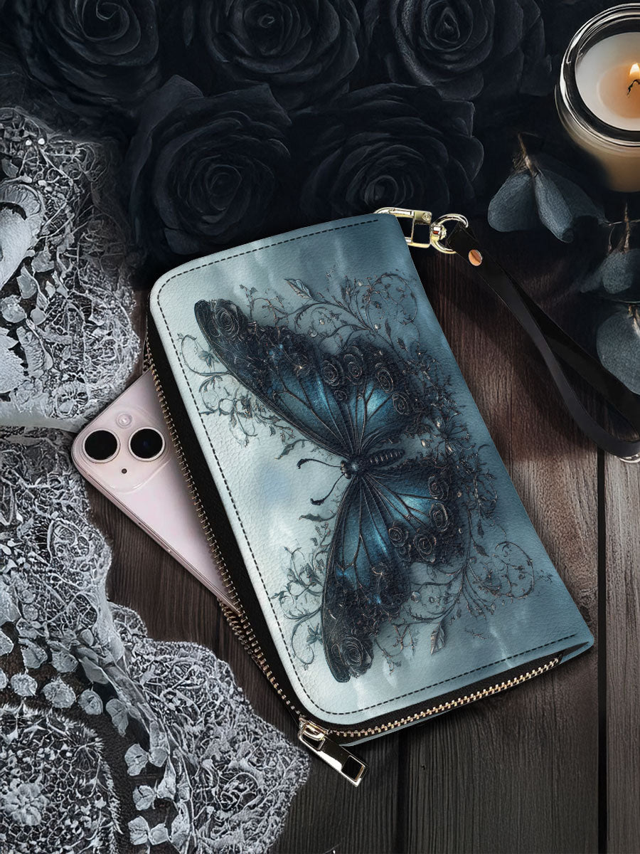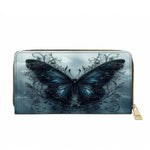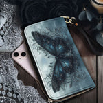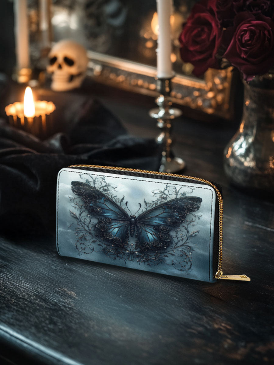 This elegant wallet captures the essence of quiet metamorphosis. A richly detailed blue butterfly anchors the design, surrounded by twisting vines and subtle gothic accents that whisper of secrets kept and stories survived. The stormy background adds depth and emotion, making every glance feel like a moment of reflection.