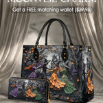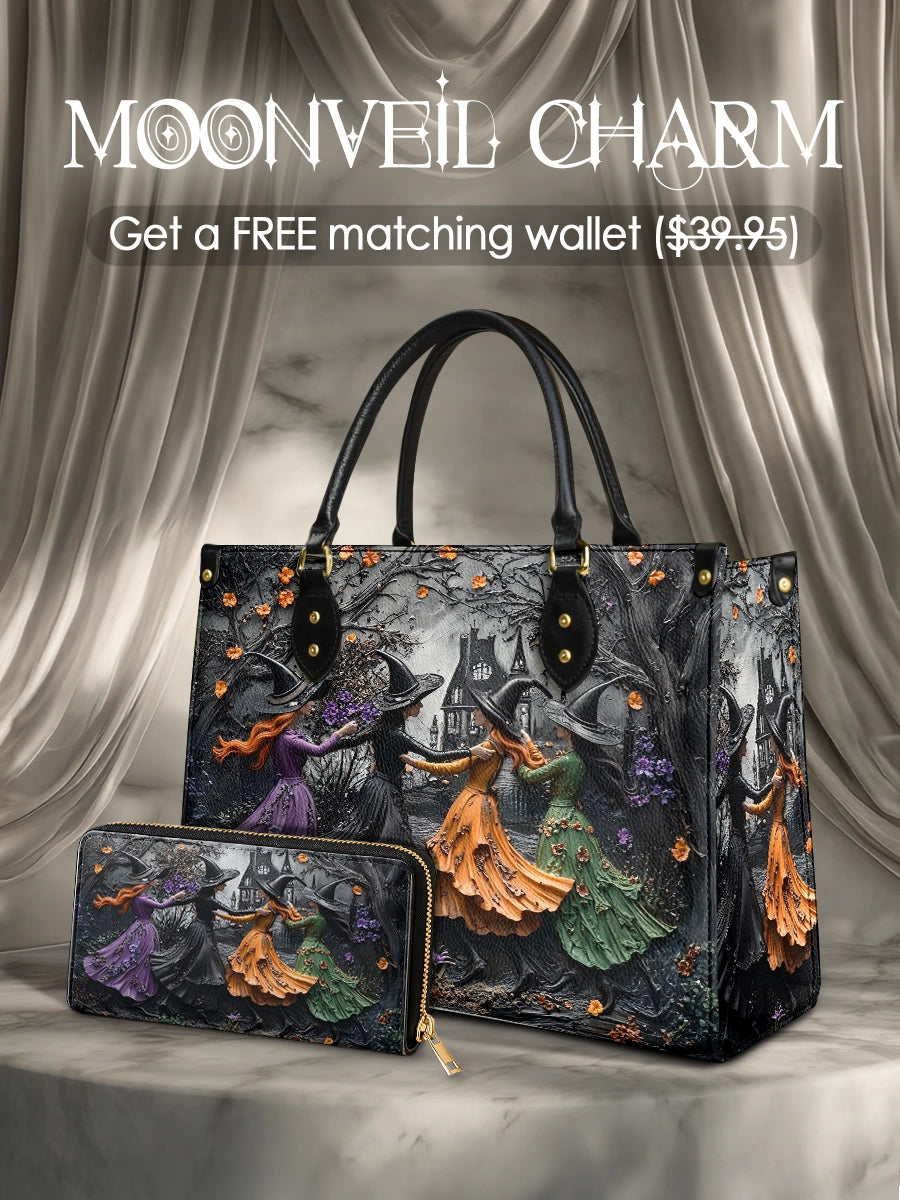 This bag features an enchanting Halloween scene sculpted in high-relief leather, capturing the eerie charm of witches dancing in the moonlight. Beneath gnarled, leafless trees and against the backdrop of a haunted mansion, four spellbinding witches twirl in flowing gowns of orange, green, purple, and black — each adorned with intricate floral textures and movement. The palette of dusky grays, twilight purples, and autumn oranges conjures a bewitching atmosphere, rich with mystery and old folklore. More than just a bag, it’s a story of sisterhood, magic, and the timeless allure of Halloween night — immortalized in leather.