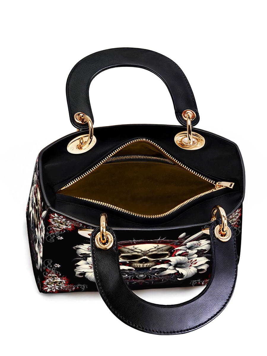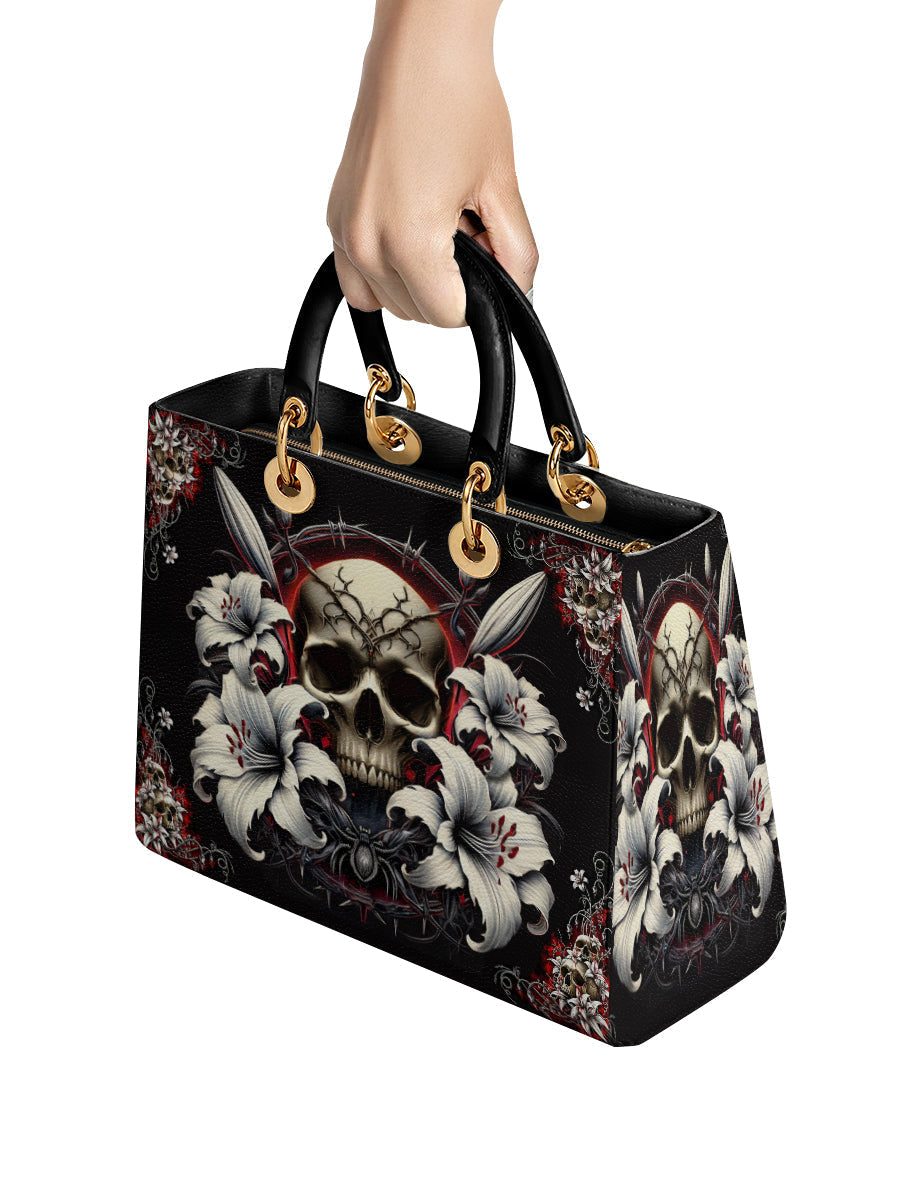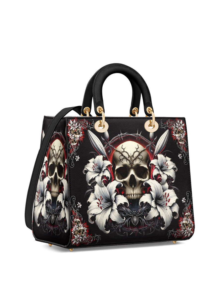 Each element is a vow: the skull, eternal remembrance; the lilies, purity reborn; the barbed halo, pain sanctified. This design is a relic of resilience, a talisman for the soul who walks between the holy and the haunted, never breaking her word to the fire within.