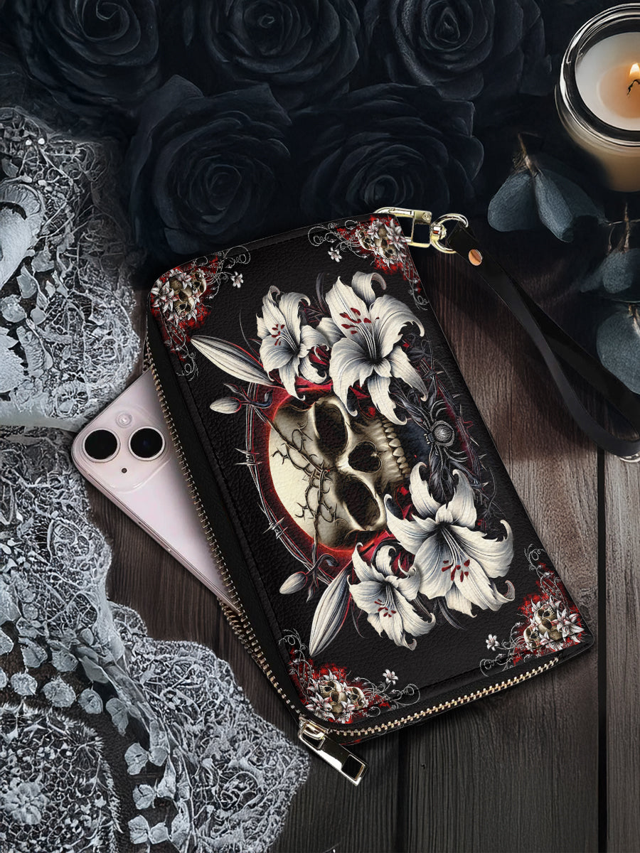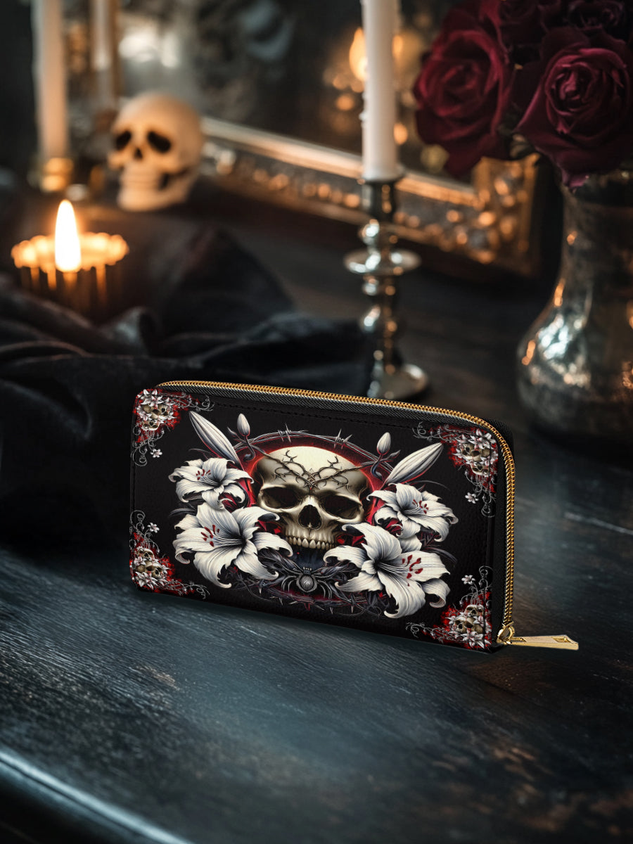 Sworn in silence, bound by shadow—the Vowed Skull is not a symbol of death, but a sacred promise carved in bone and sealed in bloom. At its heart, a crowned skull radiates beneath a crimson halo, surrounded by ivory lilies that bloom like whispered oaths. Thorns spiral like spells cast in blood and steel, guarding a truth too ancient to speak aloud.