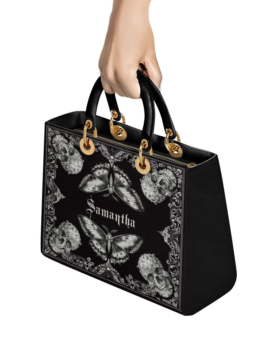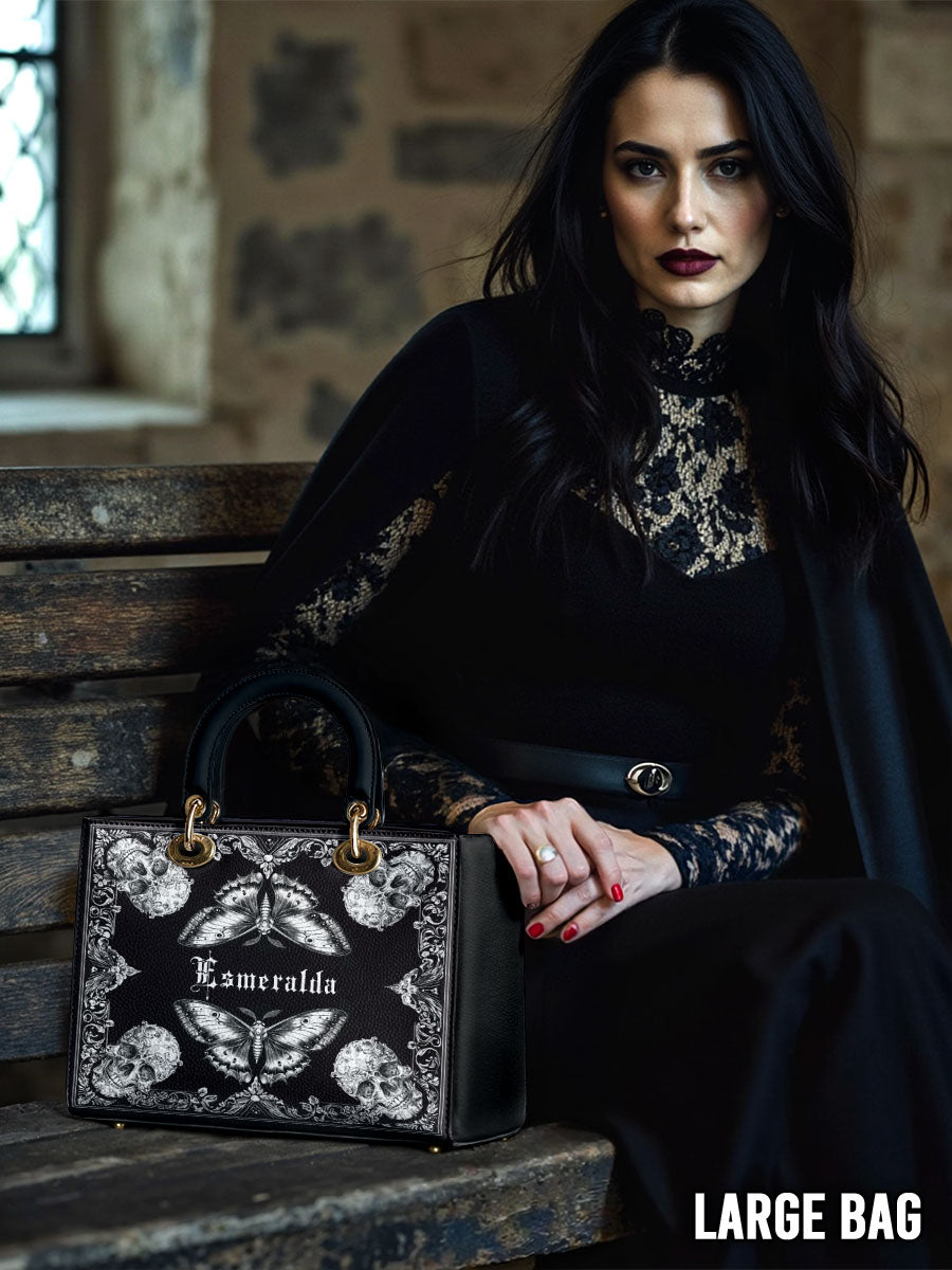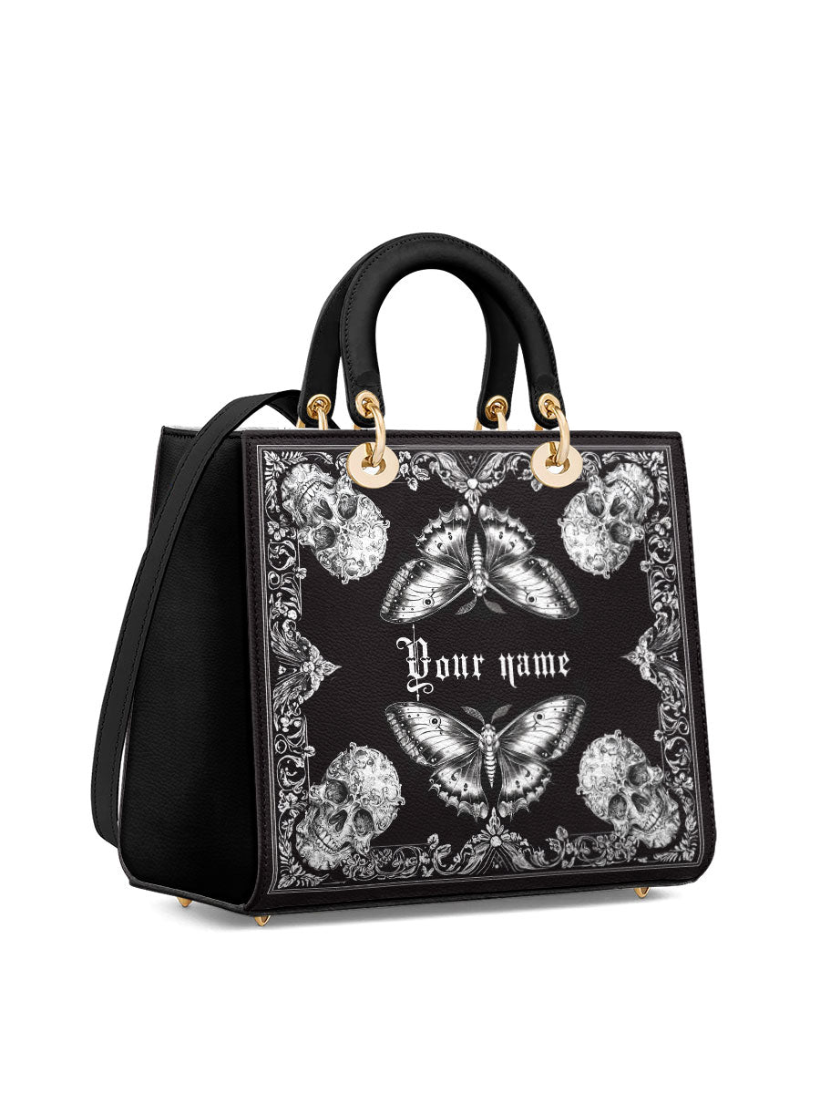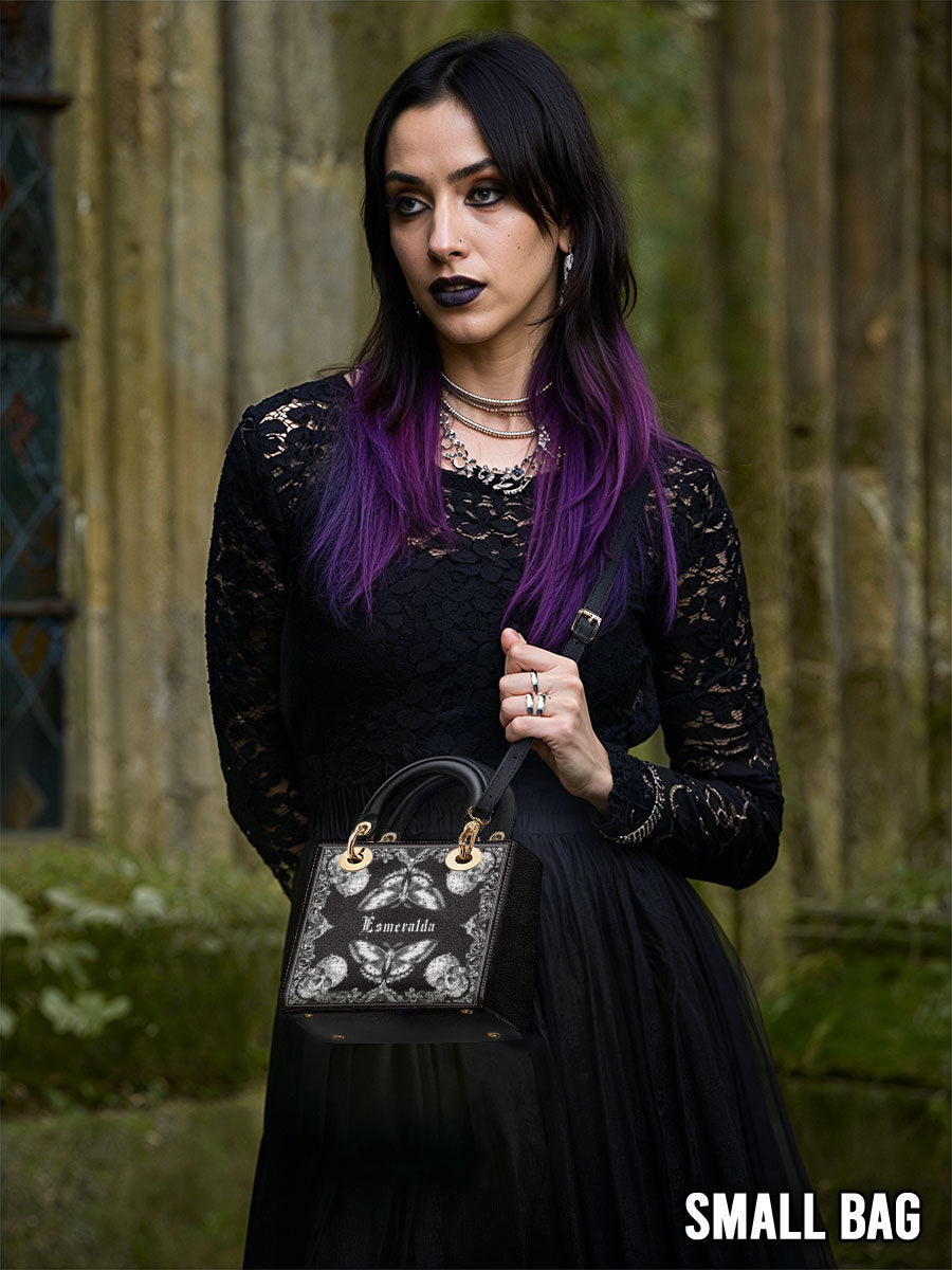 This personalized handbag brings together the haunting elegance of gothic lace, mirrored butterflies, and intricately carved skulls—forming a striking balance between fragility and power. The monochrome palette evokes a sense of mystery, while the symmetrical artwork draws the eye inward, like a portal to one's inner strength and transformation.