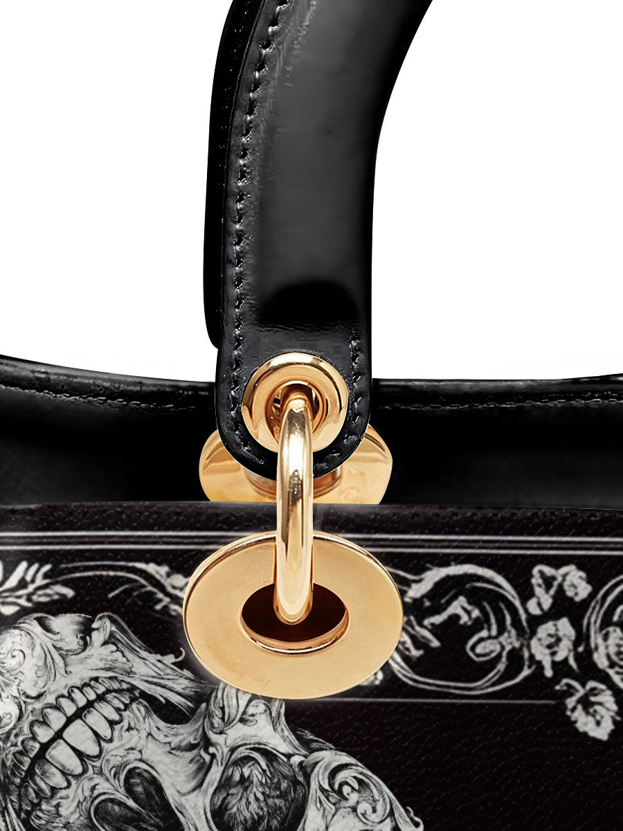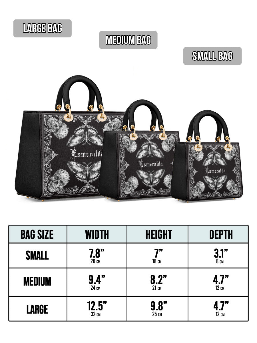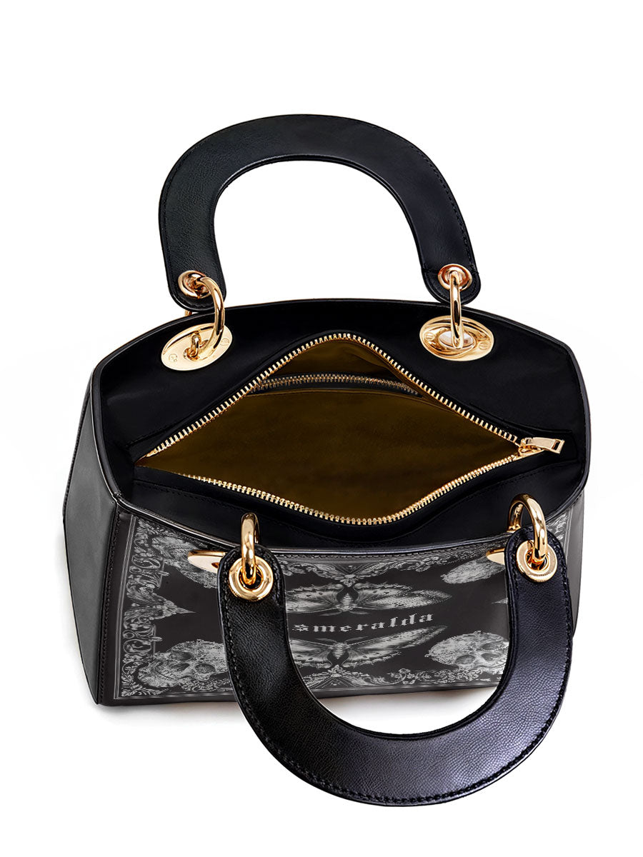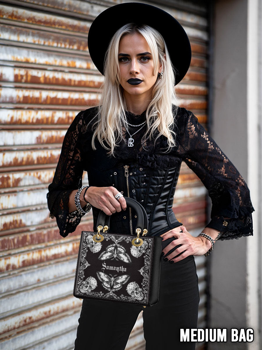 This personalized handbag brings together the haunting elegance of gothic lace, mirrored butterflies, and intricately carved skulls—forming a striking balance between fragility and power. The monochrome palette evokes a sense of mystery, while the symmetrical artwork draws the eye inward, like a portal to one's inner strength and transformation.