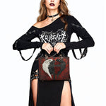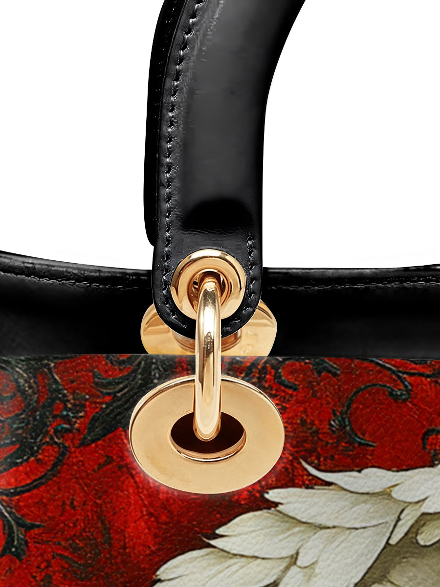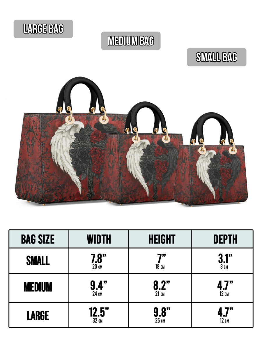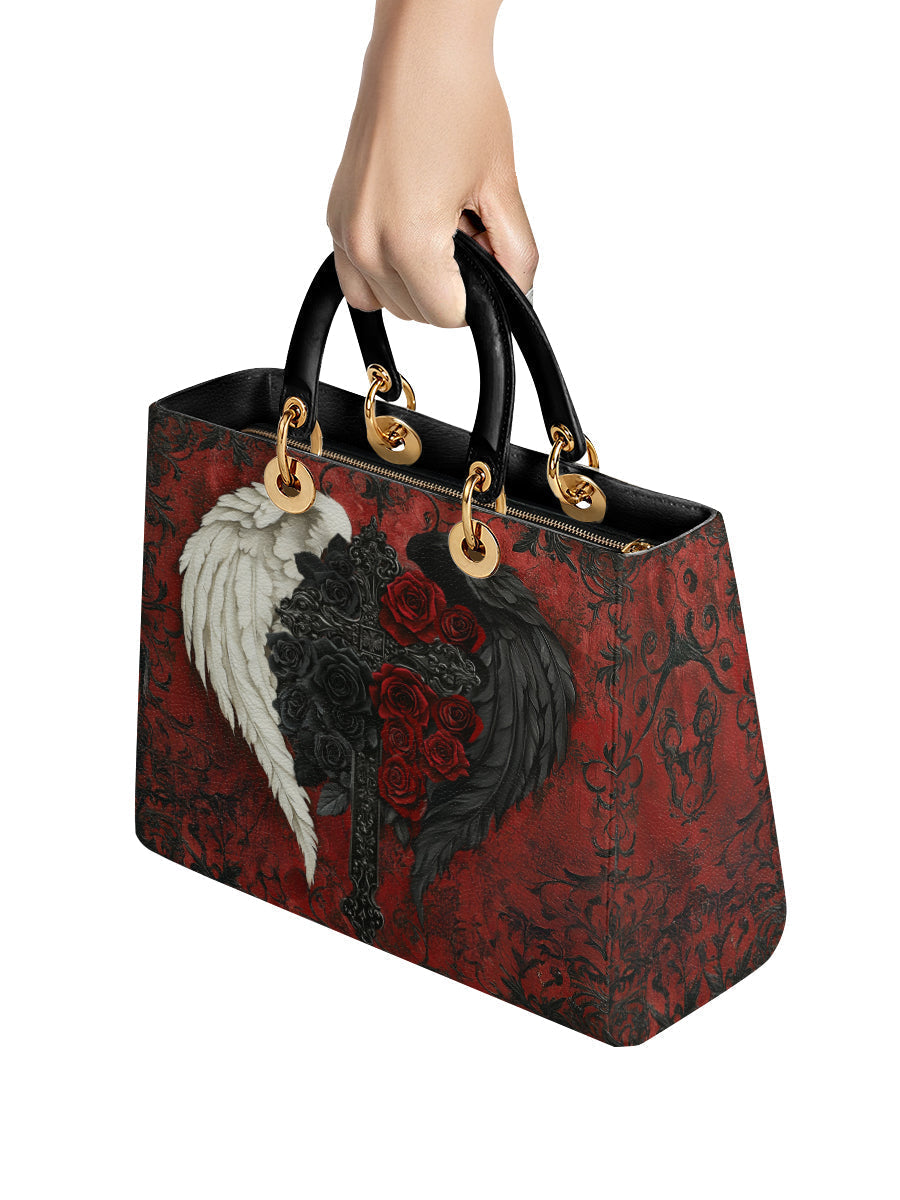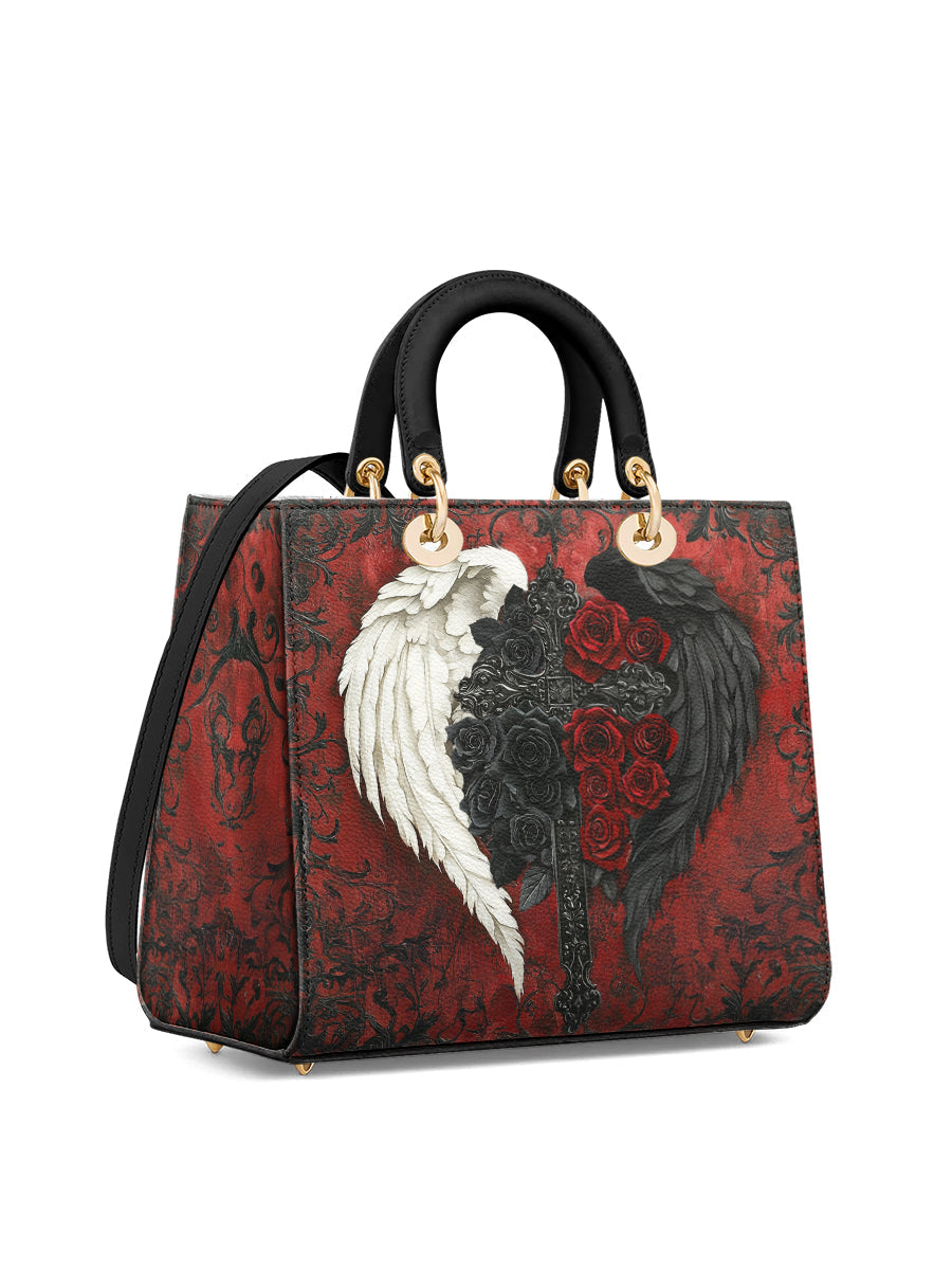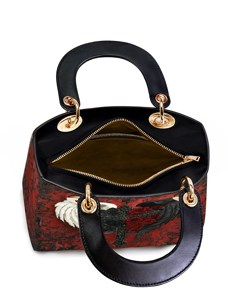 Fate is never black and white—it is the dance between light and shadow, the choices we make, the battles we fight within ourselves. The Wings of Fate handbag captures this eternal struggle, blending celestial grace with dark mystique. One wing, pure and angelic, whispers of hope and redemption; the other, dark and fierce, speaks of strength and defiance. At the center, an ornate Gothic cross entwined with red and black roses stands as a symbol of love, sacrifice, and the unbreakable bond between opposing forces.