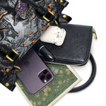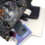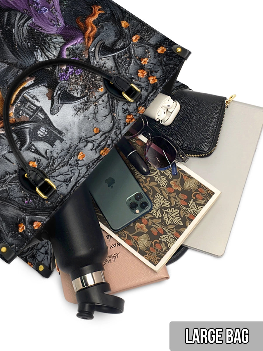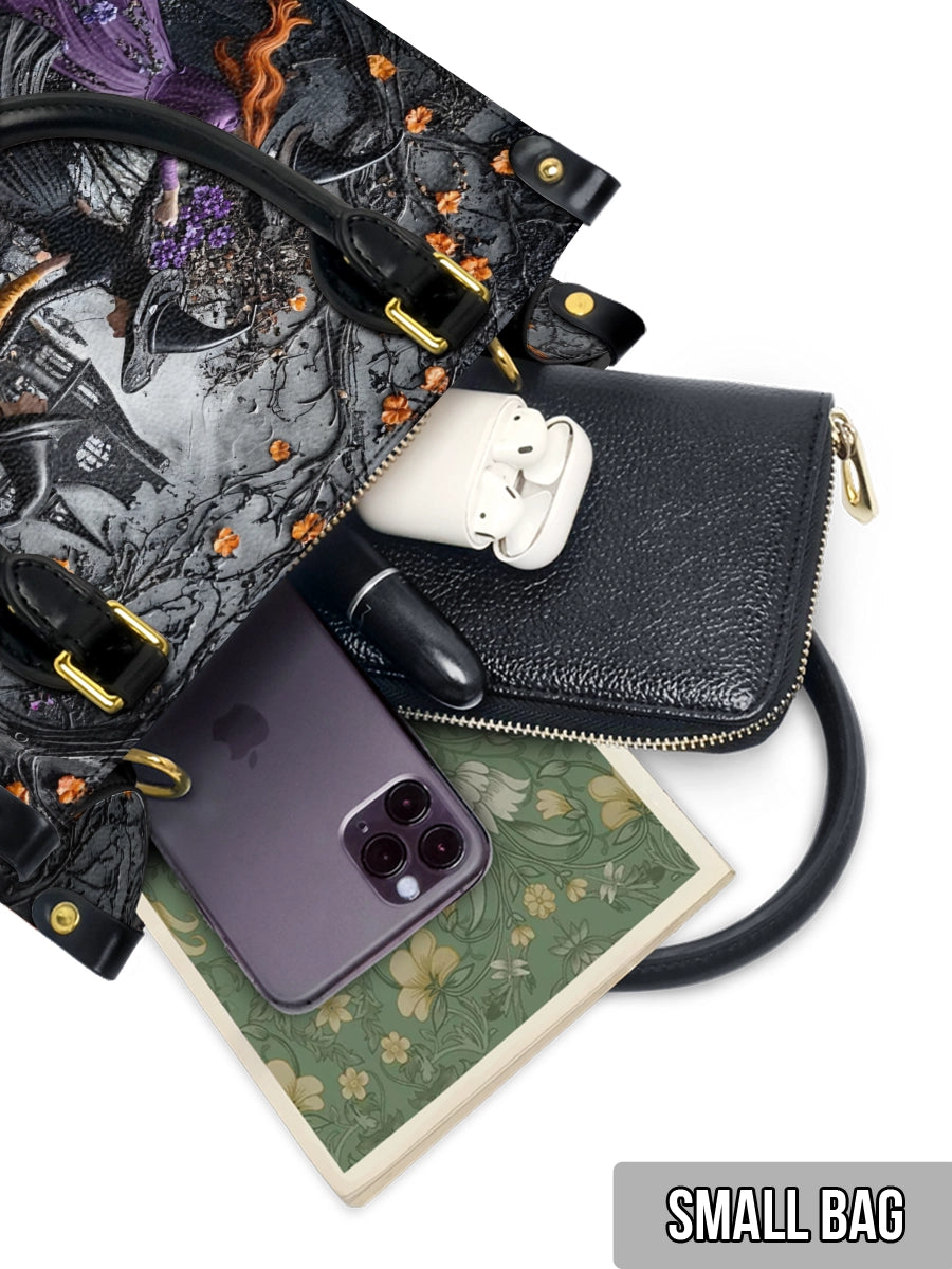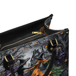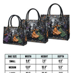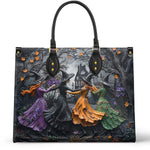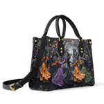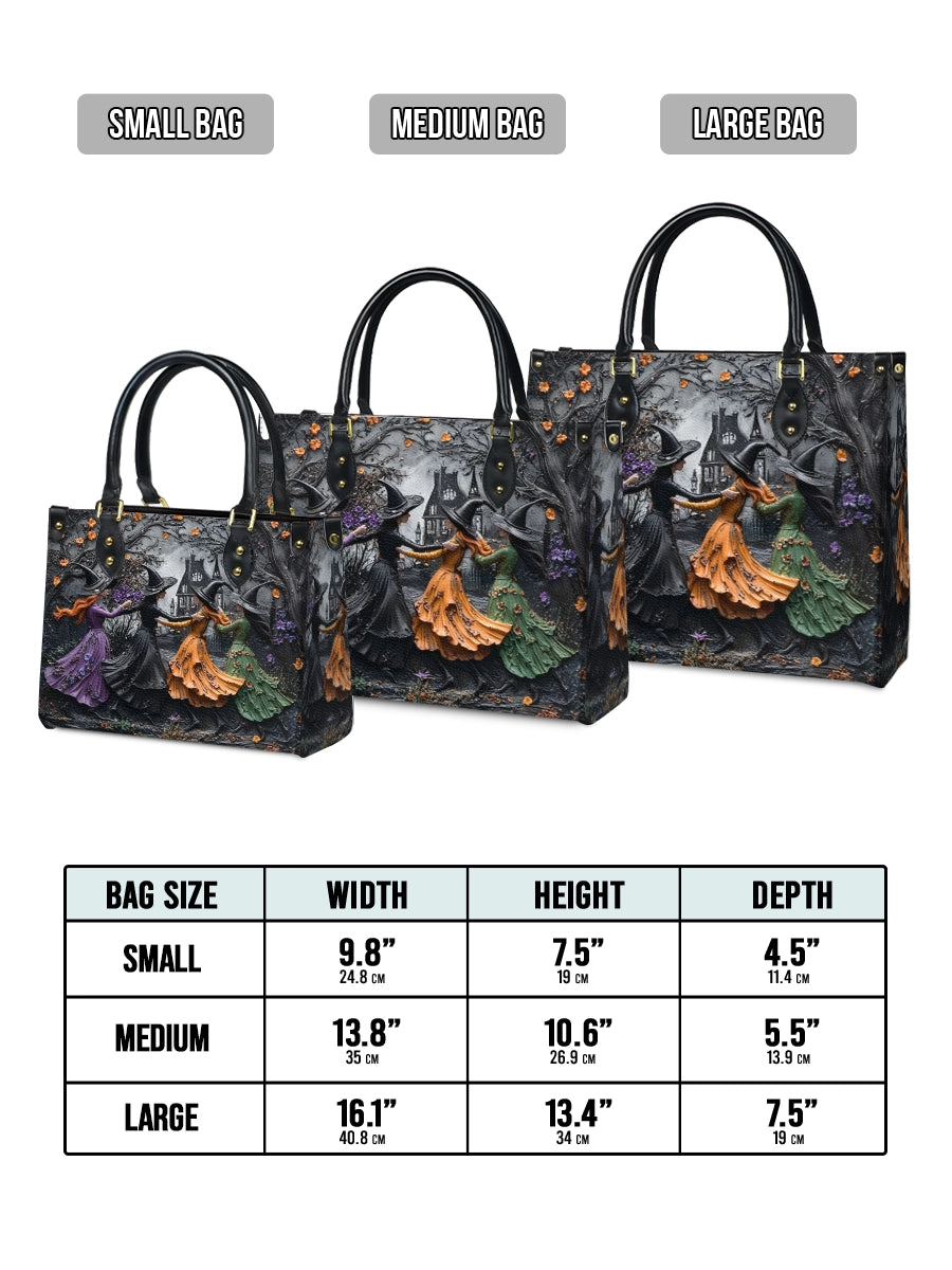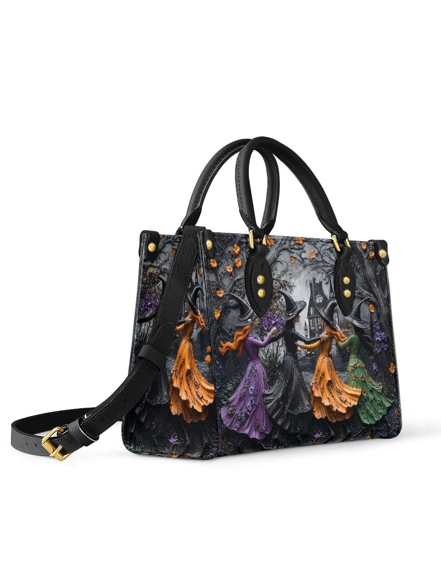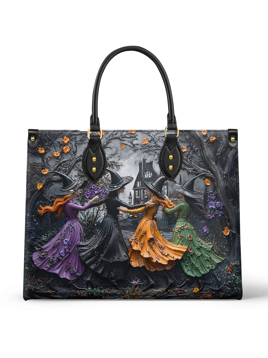 This bag features an enchanting Halloween scene sculpted in high-relief leather, capturing the eerie charm of witches dancing in the moonlight. Beneath gnarled, leafless trees and against the backdrop of a haunted mansion, four spellbinding witches twirl in flowing gowns of orange, green, purple, and black — each adorned with intricate floral textures and movement. The palette of dusky grays, twilight purples, and autumn oranges conjures a bewitching atmosphere, rich with mystery and old folklore. More than just a bag, it’s a story of sisterhood, magic, and the timeless allure of Halloween night — immortalized in leather.