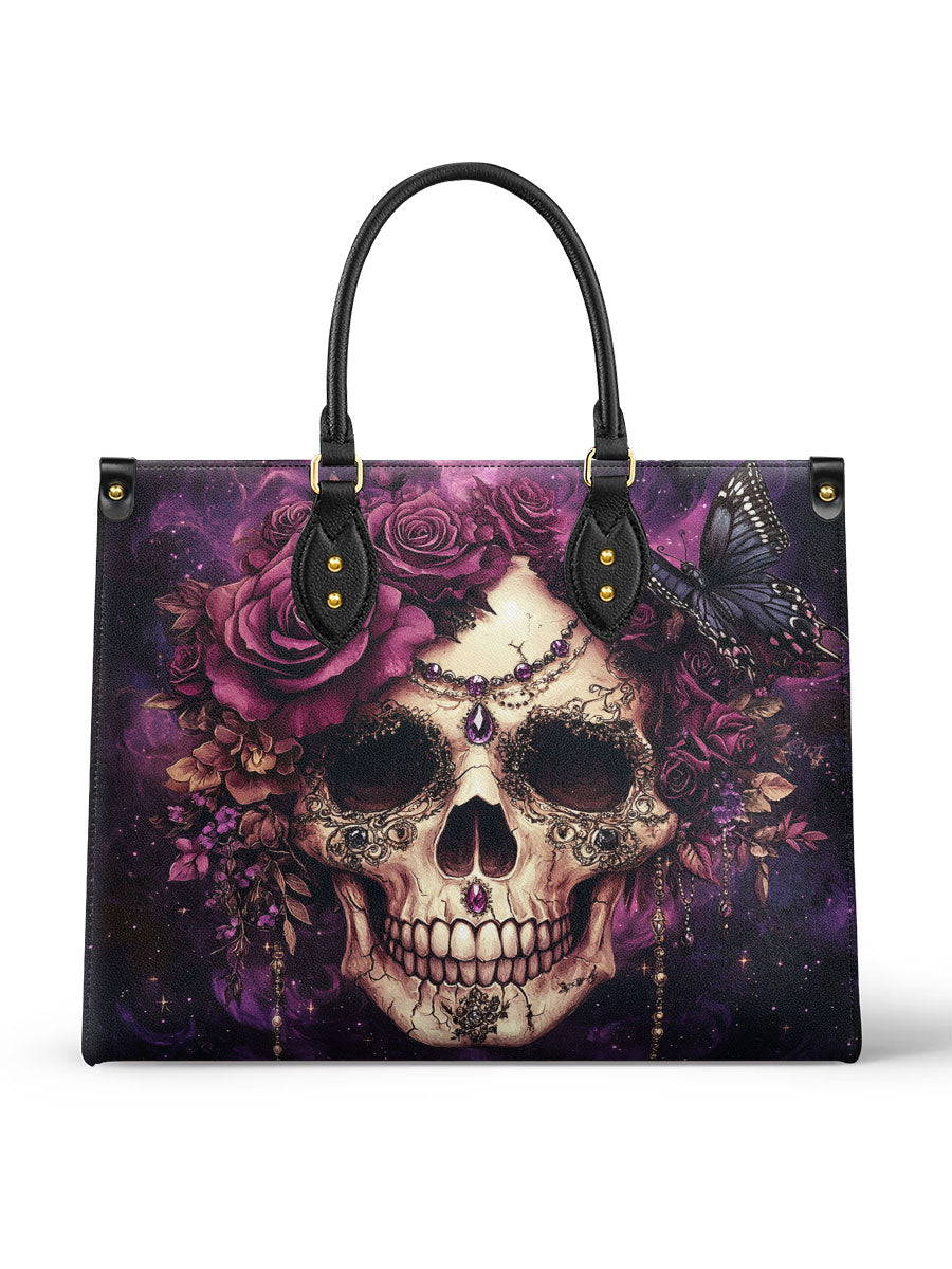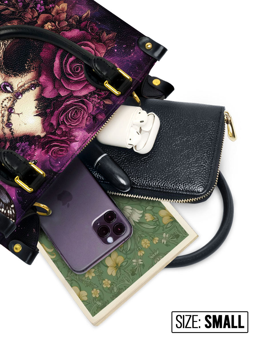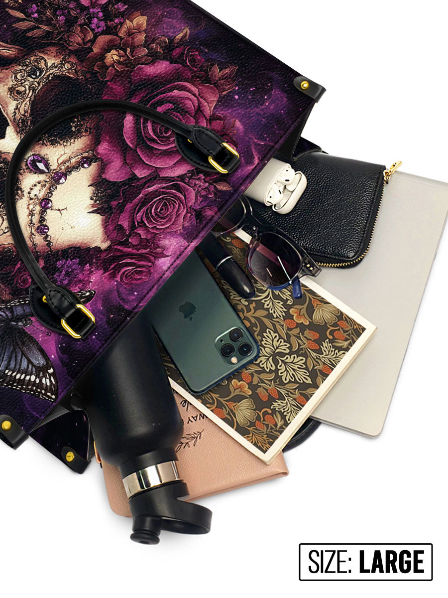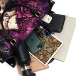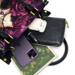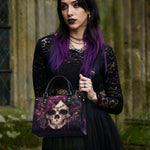 A vision of haunting elegance, this handbag captures the mystique of darkness adorned in bloom. The skull, adorned with roses and delicate lace motifs, evokes a story of beauty born from shadows. Deep purples and burgundies swirl together, creating a rich, gothic palette that feels both regal and untamed.