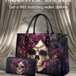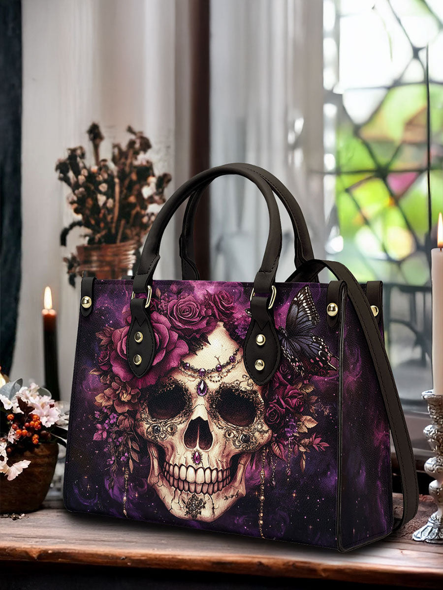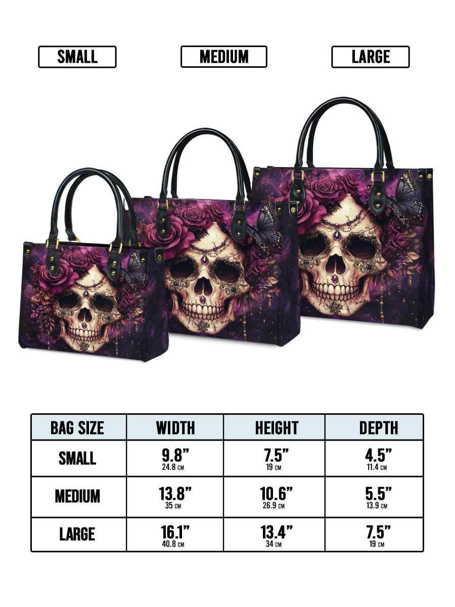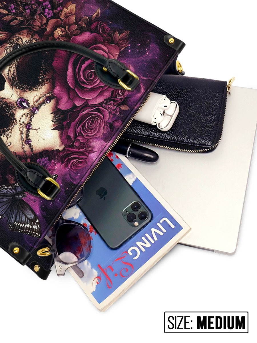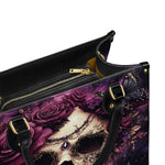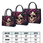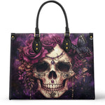 A vision of haunting elegance, this handbag captures the mystique of darkness adorned in bloom. The skull, adorned with roses and delicate lace motifs, evokes a story of beauty born from shadows. Deep purples and burgundies swirl together, creating a rich, gothic palette that feels both regal and untamed.