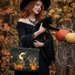 This bag features a whimsical Halloween scene sculpted in high-relief leather, capturing the magical mischief of a black cat beneath the full moon. Surrounded by grinning jack-o'-lanterns and glowing lanterns, the cat perches confidently on a tree stump, donning a classic witch hat with playful charm. In the background, crooked cottages and bare trees are bathed in golden light, evoking the spirit of a sleepy haunted village on Halloween night. The warm glow of oranges and deep shadows contrast beautifully with the sleek black leather, creating a rich visual narrative. More than just a bag, it’s a tale of mystery, charm, and Halloween nostalgia — forever etched in leather.