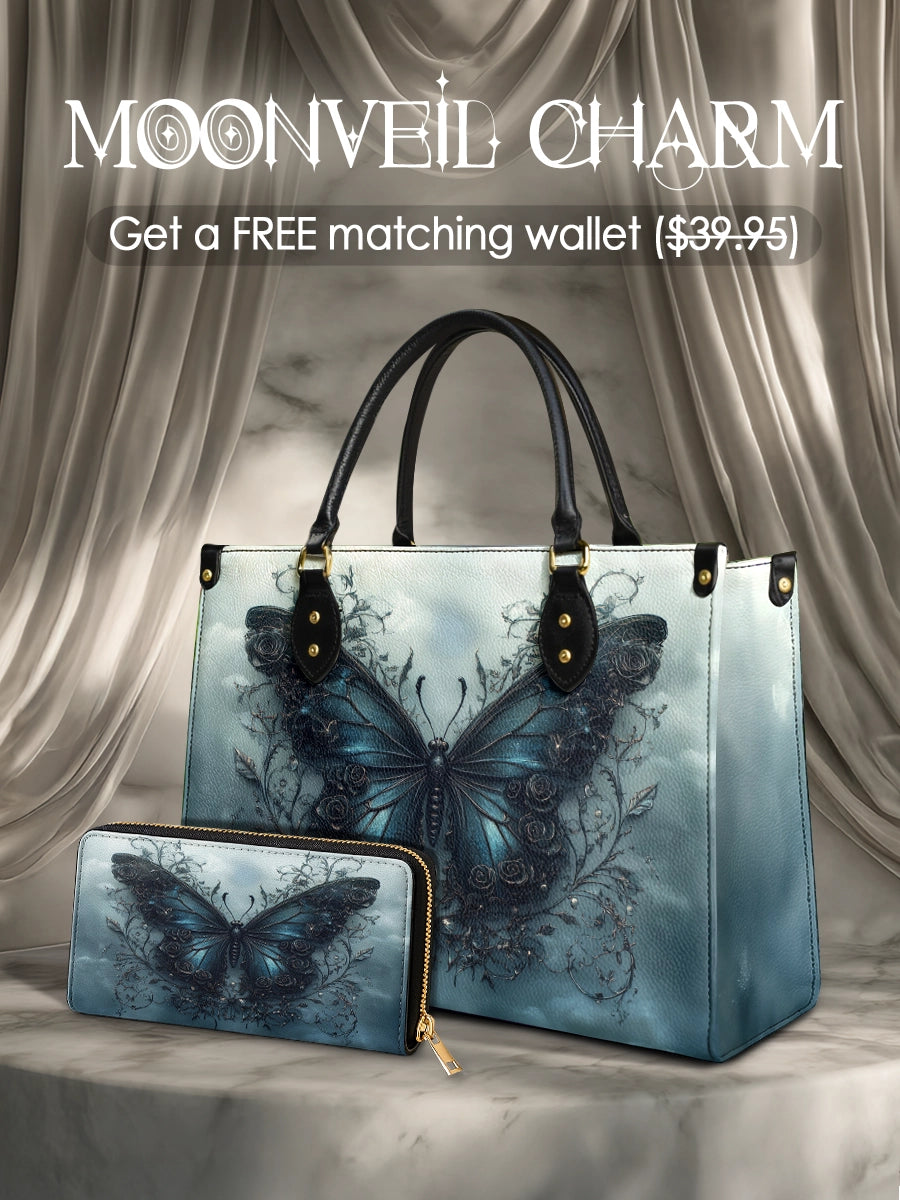 This captivating handbag features a mesmerizing midnight-blue butterfly rising from a tangle of dark vines, set against a misty sky that feels both otherworldly and serene. The wings glisten with quiet strength, detailed with baroque swirls that hint at transformation, resilience, and the beauty found in stillness. It evokes the symbolism of rebirth through darkness, a graceful tribute to women who have emerged stronger through life’s shadows.