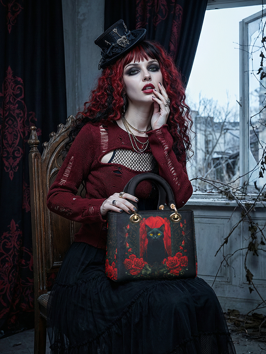 This striking leather handbag captures the allure of the mystical and the untamed. At the center sits a piercing-eyed black cat, framed by rich gothic patterns and a blood-red backdrop of roses—symbols of intuition, protection, and the wild feminine. It’s an artwork that whispers of moonlit rituals and deep, silent wisdom.