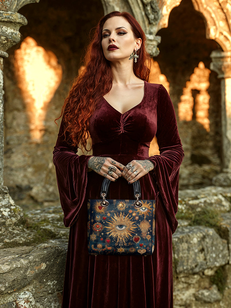 This captivating handbag features a celestial dance of sacred symbols, where radiant suns, golden eyes, and burning hearts ignite the dark backdrop like constellations. The central motif—a golden eye surrounded by light—serves as a symbol of inner vision, truth, and divine presence. Intricate gold detailing and mystical iconography give the piece a regal, spiritual aura that commands attention.