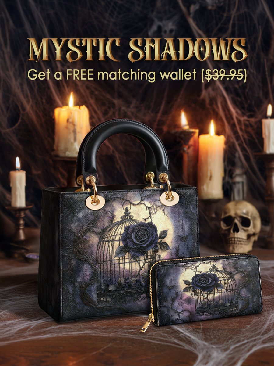 Beauty, even when confined, finds a way to glow. The Caged Bloom handbag is a quiet rebellion—an enchanting vision of a single midnight rose trapped within an ornate golden cage, yet still blooming with fierce elegance. Vines curl protectively around the frame, their shadows dancing across a moody twilight sky, as if nature itself guards the secrets held within.