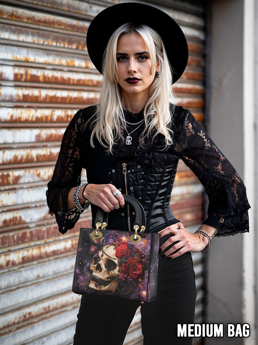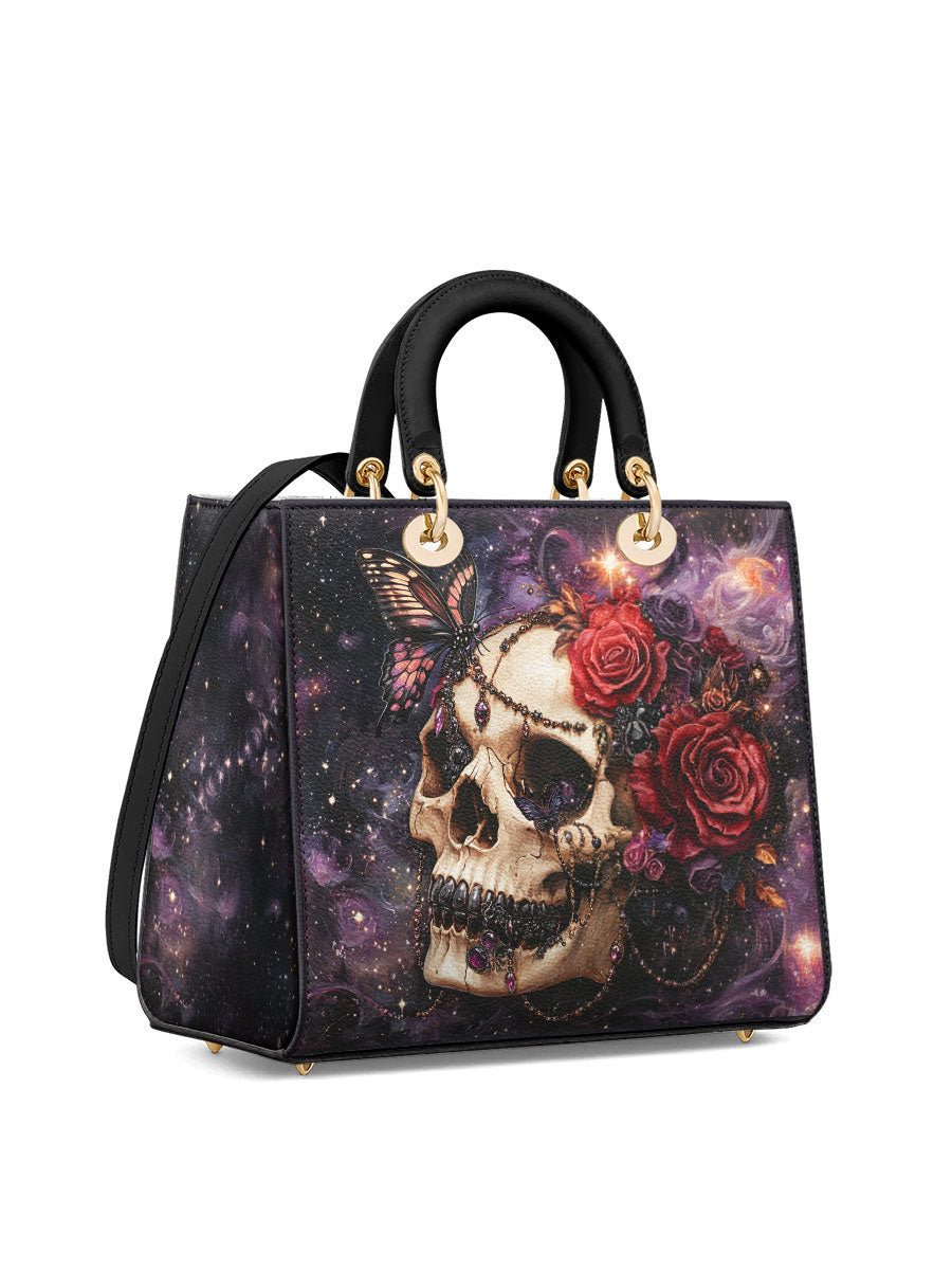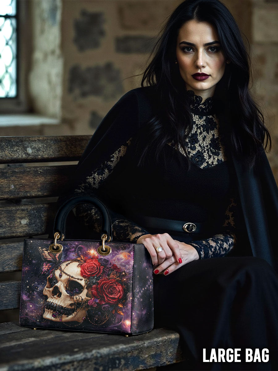 This leather handbag is a celebration of beauty that dwells in mystery. At its heart, a delicately adorned skull surrounded by crimson roses, shimmering jewels, and a fluttering butterfly evokes a powerful dance between life, death, and transformation. The cosmic background—deep purples and scattered starlight—feels like a dream stitched with secrets.