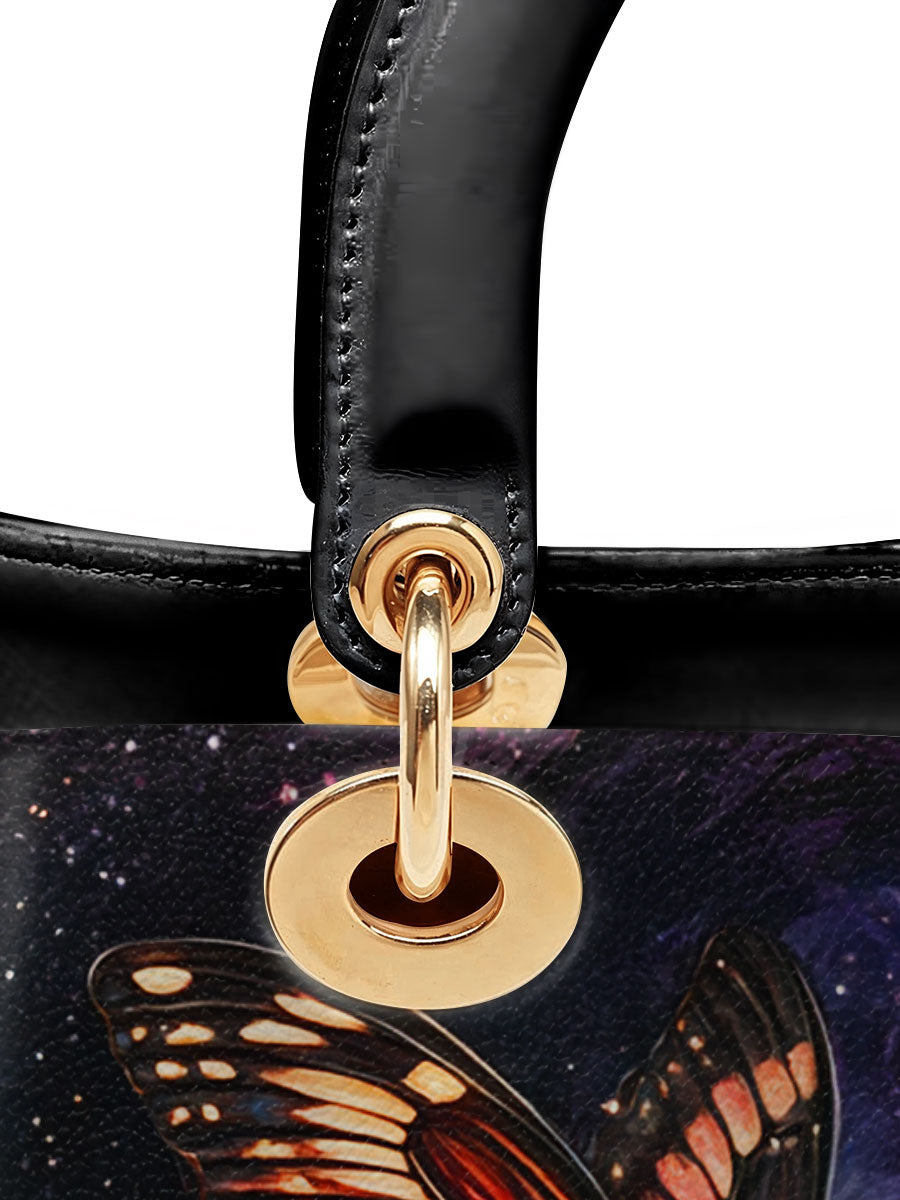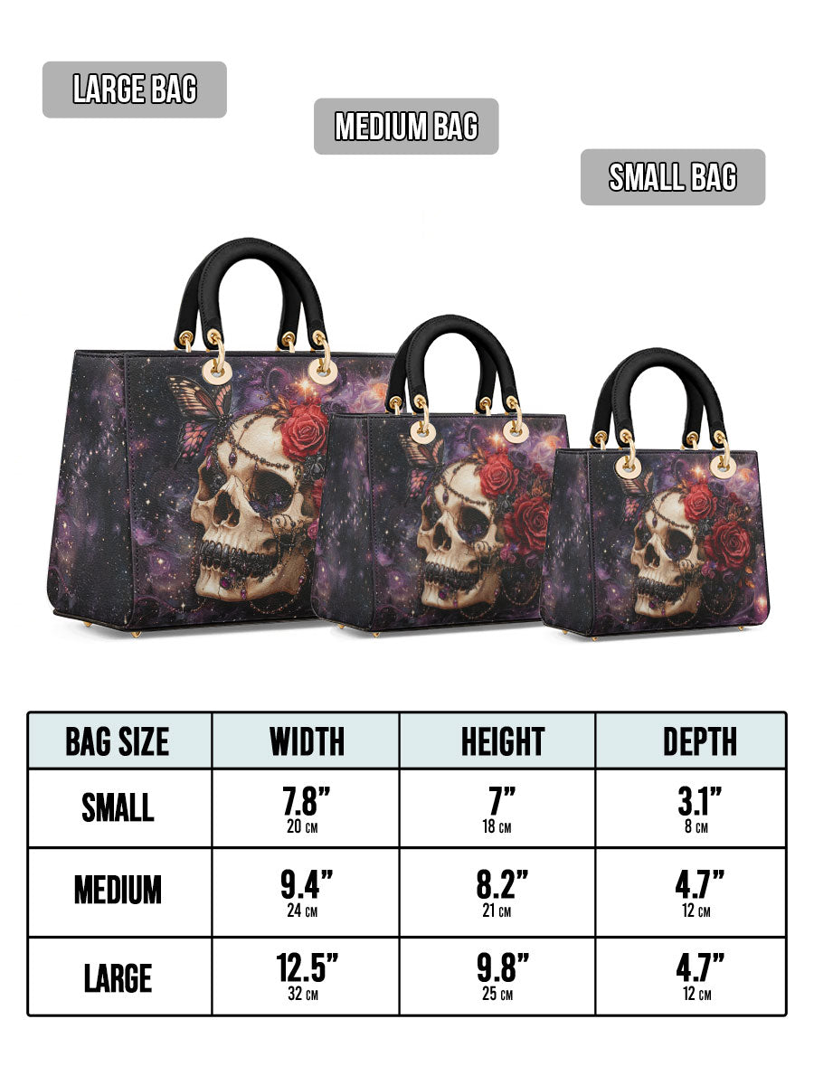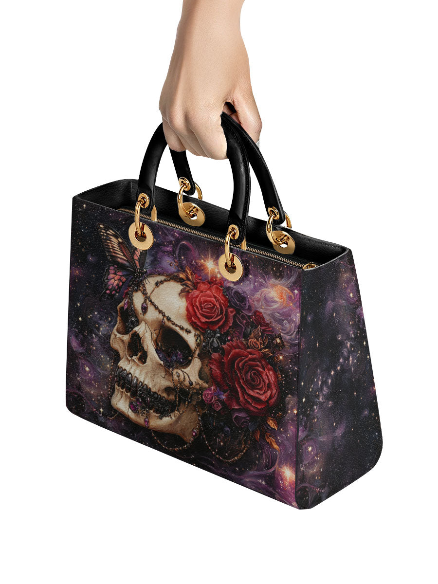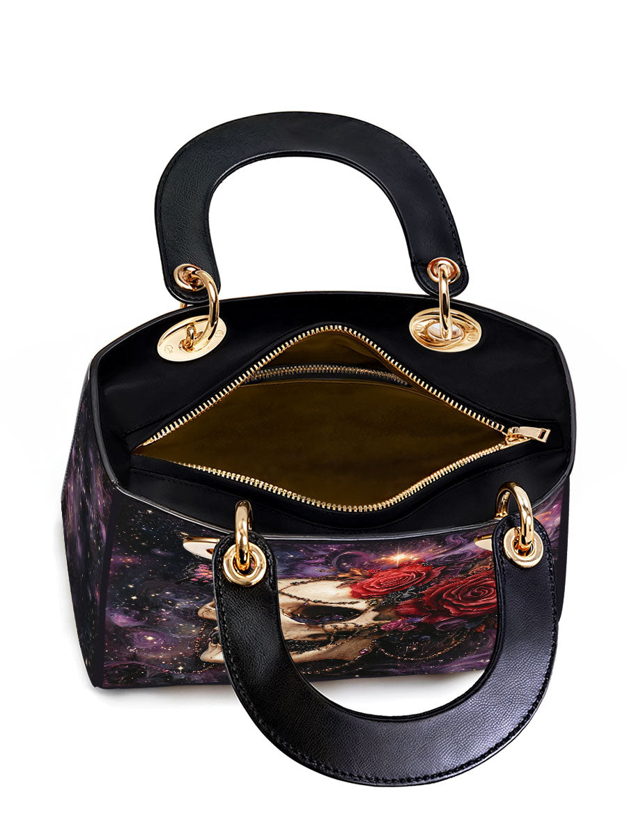 This leather handbag is a celebration of beauty that dwells in mystery. At its heart, a delicately adorned skull surrounded by crimson roses, shimmering jewels, and a fluttering butterfly evokes a powerful dance between life, death, and transformation. The cosmic background—deep purples and scattered starlight—feels like a dream stitched with secrets.