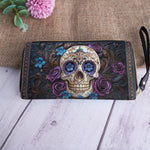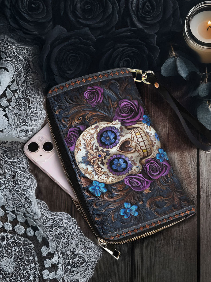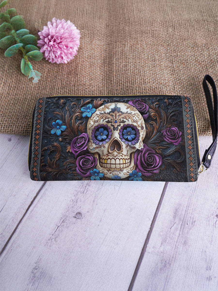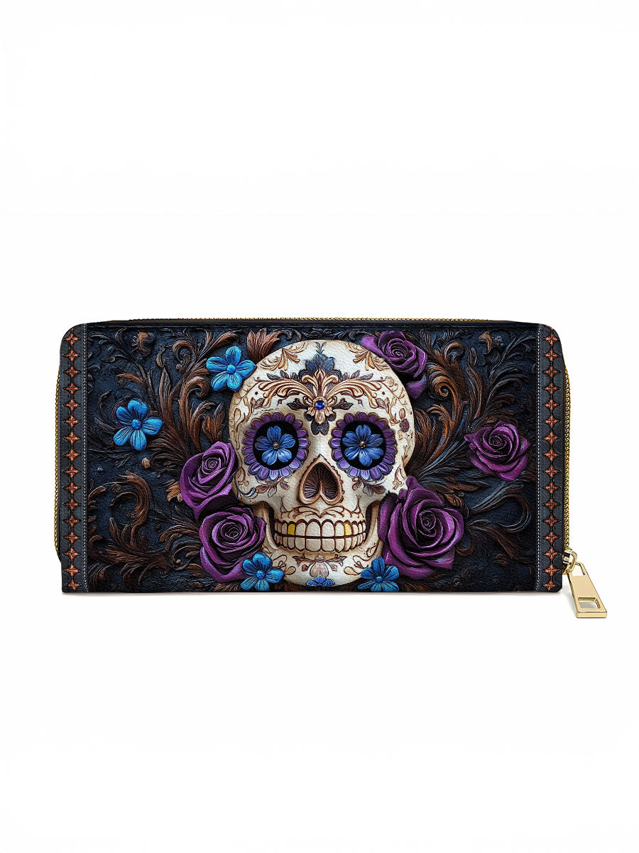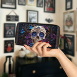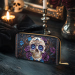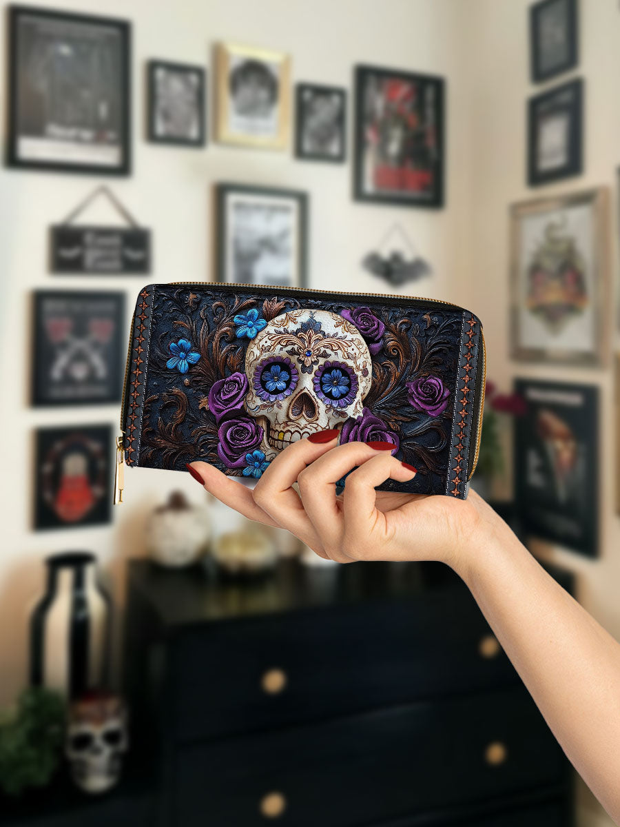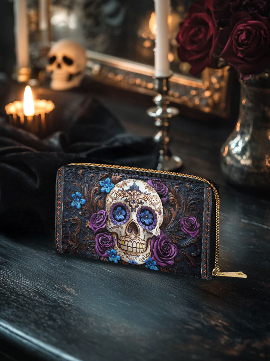 The Obsidian Rose Crypt Wallet brings together dark romance, artistry, and quiet feminine strength. Its centerpiece — a beautifully detailed sugar skull framed by violet and deep-blue roses — tells a story of resilience, beauty, and the mysteries we carry with us.