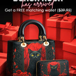This striking leather handbag captures the allure of the mystical and the untamed. At the center sits a piercing-eyed black cat, framed by rich gothic patterns and a blood-red backdrop of roses—symbols of intuition, protection, and the wild feminine. It’s an artwork that whispers of moonlit rituals and deep, silent wisdom.