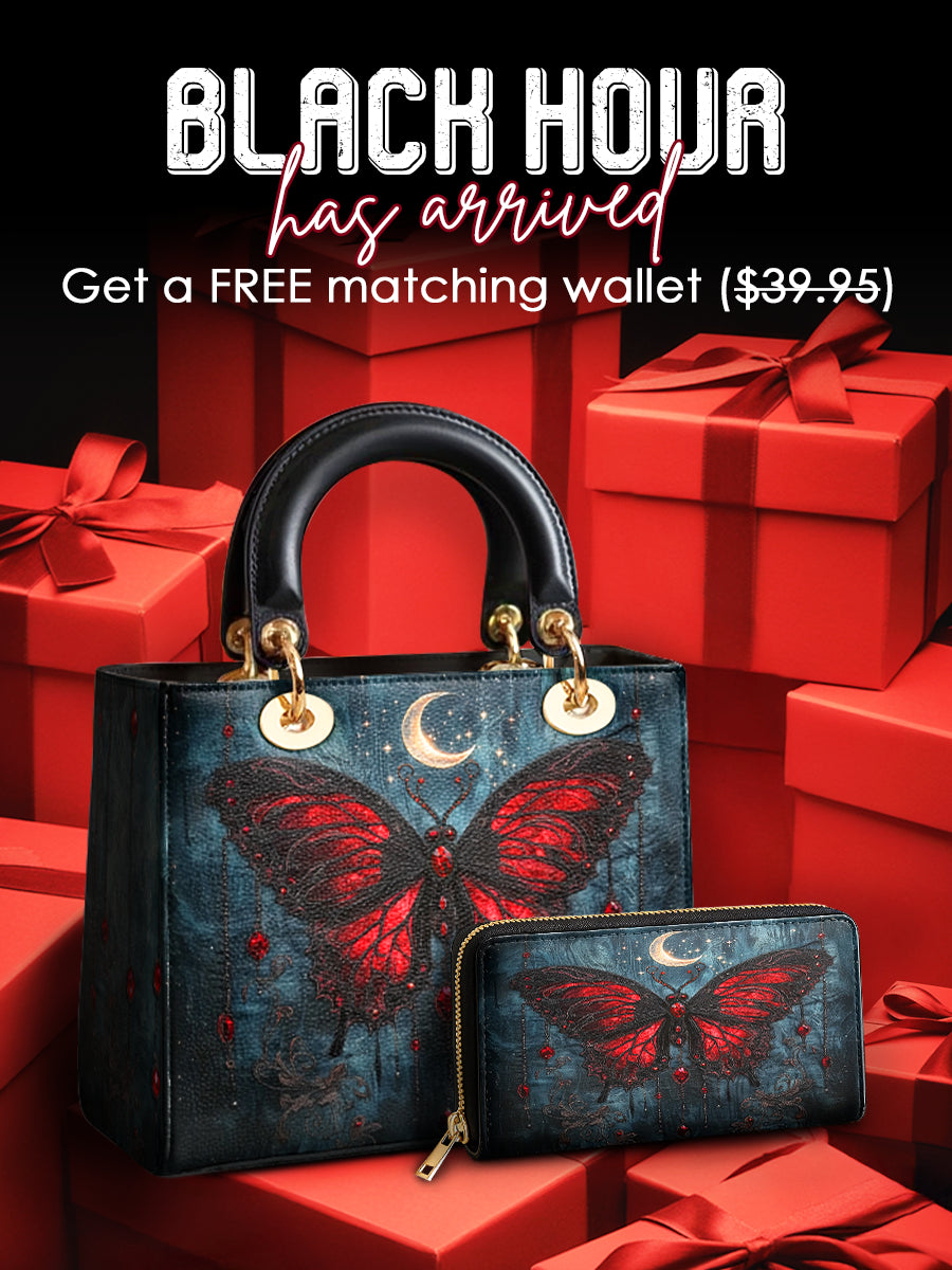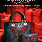 Not all transformations are gentle—some are born in fire and shadow. The Crimson Eclipse handbag is a tribute to metamorphosis through darkness, where the soul breaks free not in silence, but in a storm of crimson wings beneath a watching crescent moon. A glowing red butterfly, laced with gothic elegance, spreads across a midnight canvas—each vein pulsing with defiance, mystery, and power.