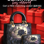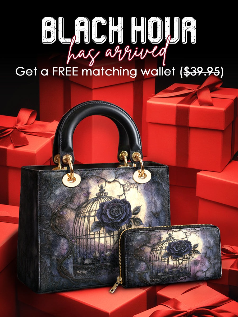 Beauty, even when confined, finds a way to glow. The Caged Bloom handbag is a quiet rebellion—an enchanting vision of a single midnight rose trapped within an ornate golden cage, yet still blooming with fierce elegance. Vines curl protectively around the frame, their shadows dancing across a moody twilight sky, as if nature itself guards the secrets held within.