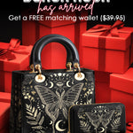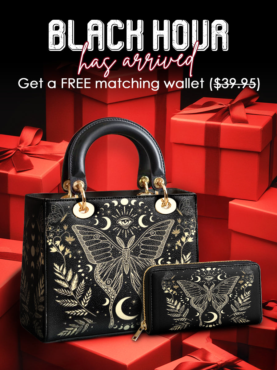 A radiant tribute to the divine feminine, this handbag features a stunning butterfly adorned with celestial symbols, crescent moons, and blooming laurels in luminous gold on a deep black background. The design evokes mystery, freedom, and sacred transformation, drawing inspiration from the moon’s phases and the spiritual journey of the soul. Every detail whispers of hidden knowledge and graceful strength, creating a visual harmony between elegance and power.