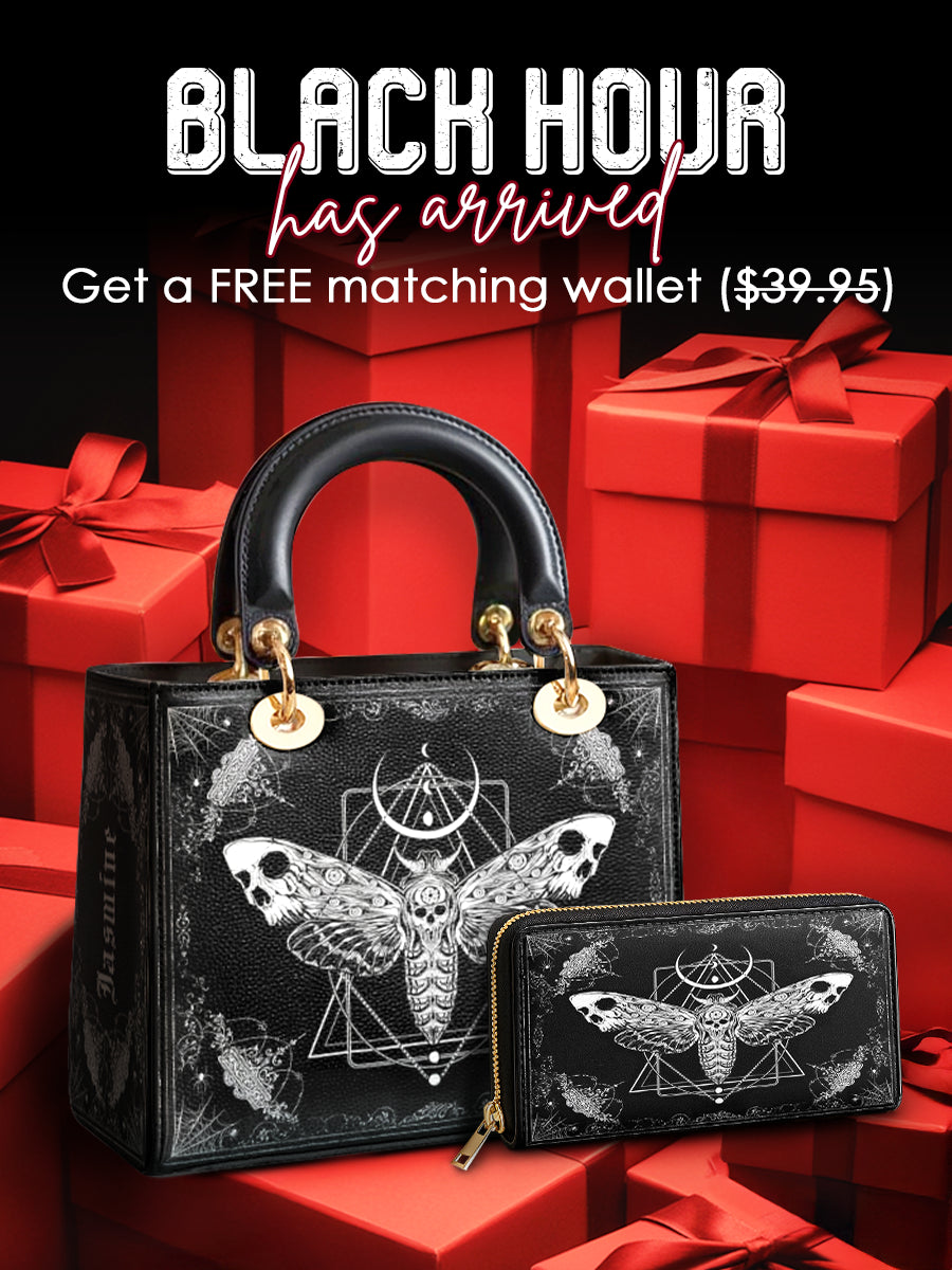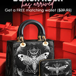 This exquisite handbag embodies transformation wrapped in mystery. The central figure—an ethereal moth with skull-tipped wings—sits poised between geometric sigils and lunar phases, symbolizing the eternal dance between death and rebirth. Set against a rich black canvas, the design whispers of metamorphosis, shadow work, and feminine power.