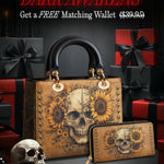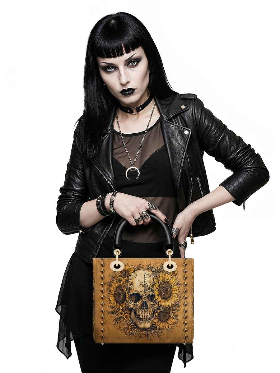 This handbag brings together striking contrast and raw beauty—a weathered skull surrounded by blooming sunflowers, symbolizing the dance between life and death. The warm, distressed tones and studded trim create a rugged yet refined aesthetic, perfect for those who embrace imperfection as part of their story.