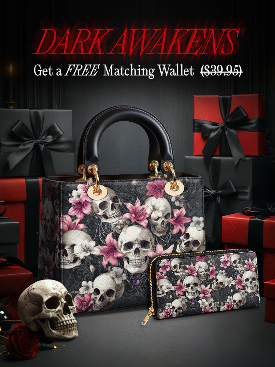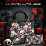 This handbag is a bold expression of life’s duality — fierce yet feminine, dark yet delicate. The hauntingly beautiful skulls emerge from a shadowed backdrop, softened by the soft blush of blooming lilies. Every detail is intricately rendered, creating a visual story that speaks of both resilience and elegance.